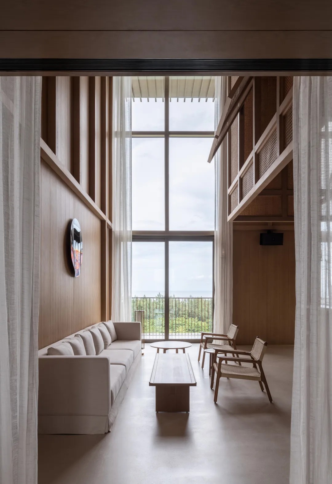 手工烧制的陶土砖塑造了砖石基座;竹子经过淘洗与压制,充分适应热带湿热气候,成为理想的建筑材料;藤编与黄铜的精致细节为质朴的建筑语言增添了丰富的层次;黎族的织锦工艺成为软装织物与地毯的设计灵感。