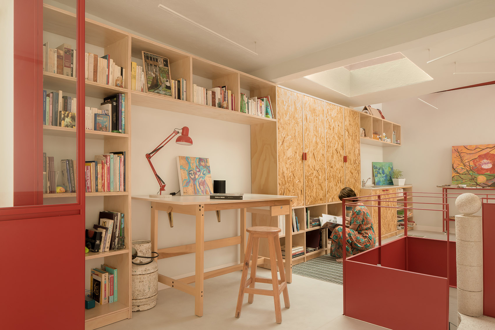 扩建计划围绕一座现有的螺旋楼梯展开,将车间分为两个部分。第一部分是一个工作室区域,可以通向一个露台,露台上可以俯瞰到科约阿坎中心街道两旁的树冠。从这个空间进入更为私密的区域,其中包括一个完整的浴室。相对的墙面上,定制的木工单元贯穿整个空间的深度,为丹妮拉的创作过程提供了丰富的储物空间,存放物品、书籍和材料。该单元包括书架、绘图桌、抽屉以及一张坚固的工作台,上面安装有专门处理材料的水槽。