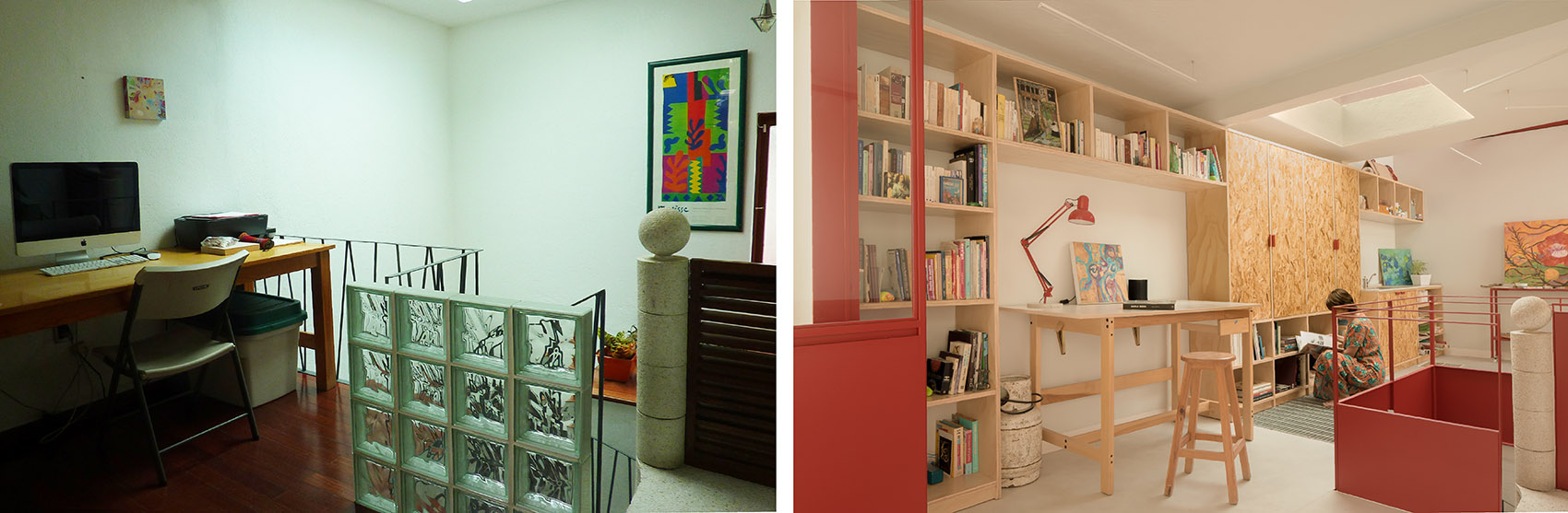 Daniela Riquelme是墨西哥城的艺术家,专注于绘画和珠宝创作,最初将房屋的二楼用作她的工作室和工坊。然而,随着时间的推移,她发现这个空间无法满足她的艺术创作需求,特别是在空间和照明方面的局限性。因此,工坊的翻新工作重点是对二楼进行全面改造,以更好地支持艺术创作。此次改造包括创造新的开口、安装定制家具、木工和铁艺、上色、为工作室-工坊计划添加一个展览区域,以及最重要的,引入充足的自然光。