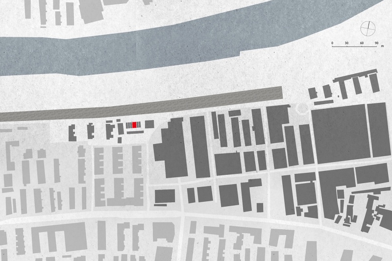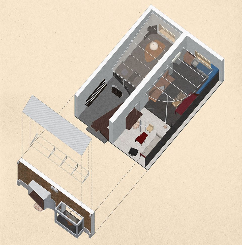 室内原始层高五米,平面被一道结构墙体平均地分为两部分。层高和墙体保温导致了该房屋被动节能方面的劣势,中间的结构墙体也带来了空间整合上的困难。工作室所在的联排房处于园区地势低洼处。到了夏天雨水丰盈的时节,雨水便可能会倒灌入室内。