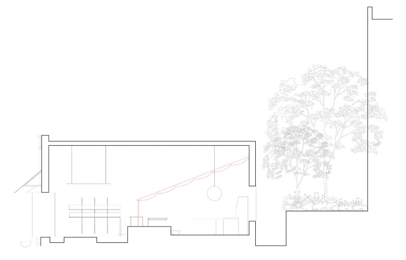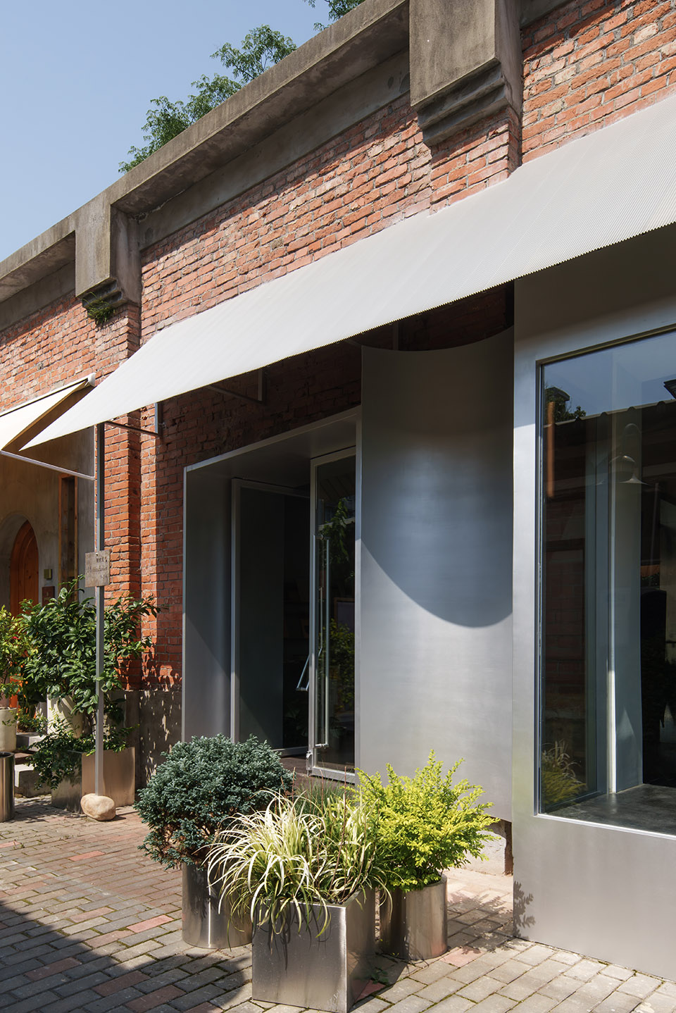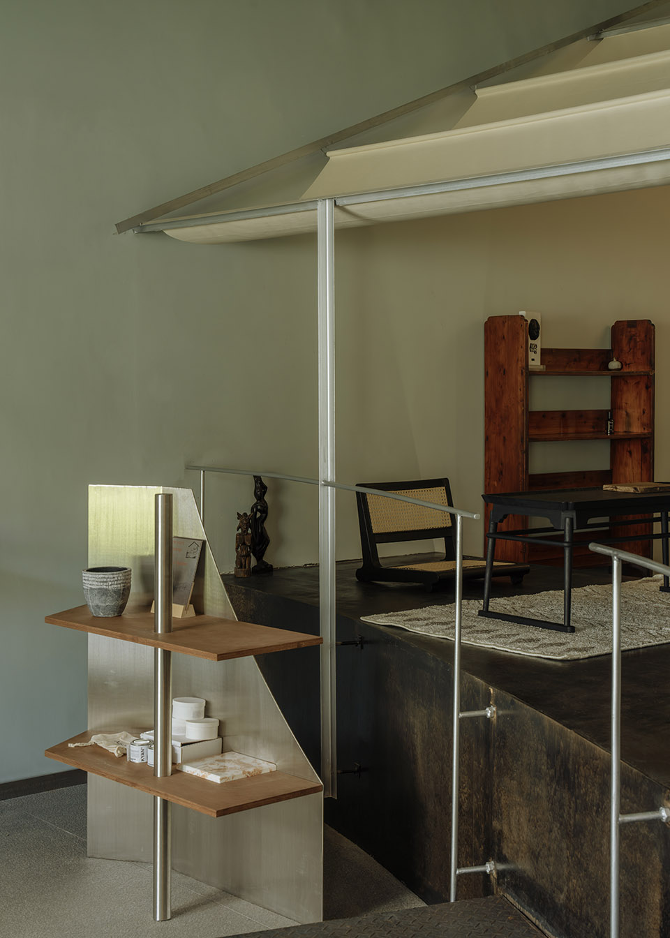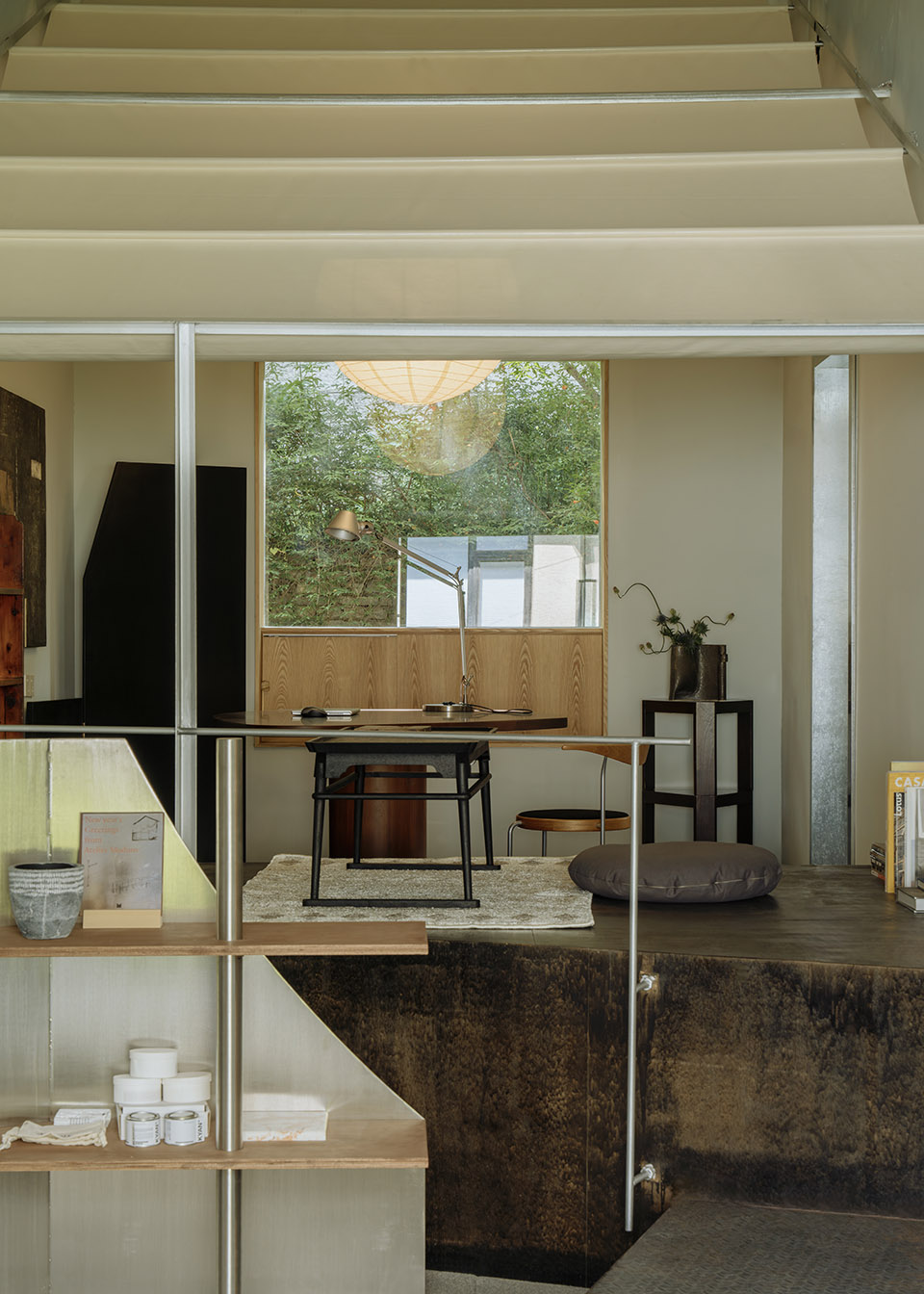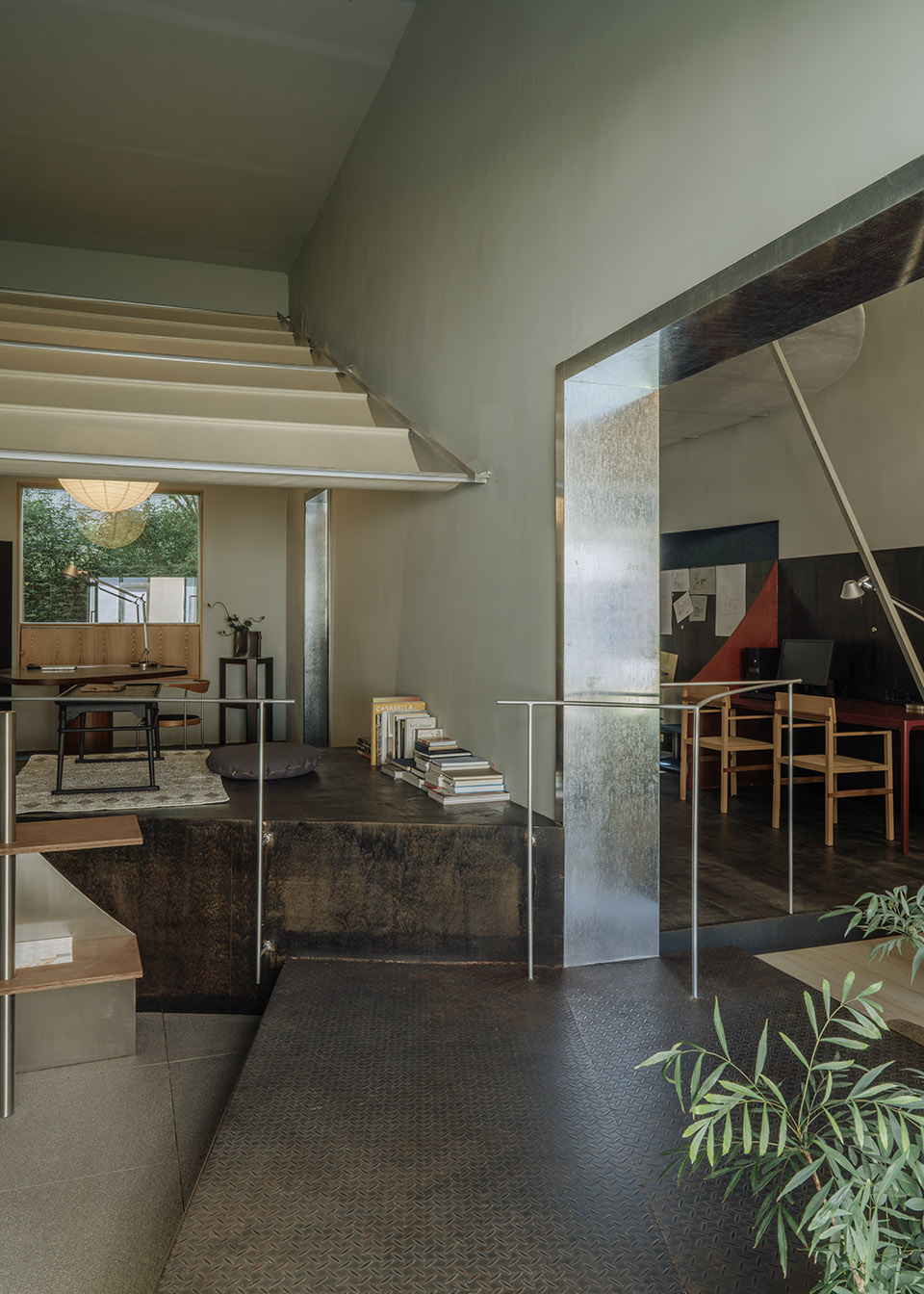 门口处我们常置了一块毛石踏步,一如小时候大人们会在积水路段给过路的学童放置好汀步一样的砖块。在室内入口处,我们用热压钢板铺就了一条“威尼斯”季节式的过水栈道,折角位置与墙体产生一个植物端景。由入口展架区起,沿逆时针方向分别为接待客厅,公共办公区和独立办公室,高度依次递增。正对入口即见到作为独立办公室的“茶亭”而未可到达。其由角钢固定的波段式织物覆盖,利用层高条件形成一个角度陡峭的坡面。边缘位置尽可能的压低檐口,与垫高的茶席一同收窄了由外向内的视线通廊,保证办公需求的私密性。而高坐在“茶亭”边缘处,视线高度下降便可以尽览入口与室外的景致。公共办公区同样由一个屋顶遮蔽,由一根斜撑在毛石上的纤细角钢和固定在墙体两端的工型钢合力支撑。斜撑的角钢在保证其结构需求的前提下截面尽可能的窄小,反应着亚克力屋顶的真实荷载感受。