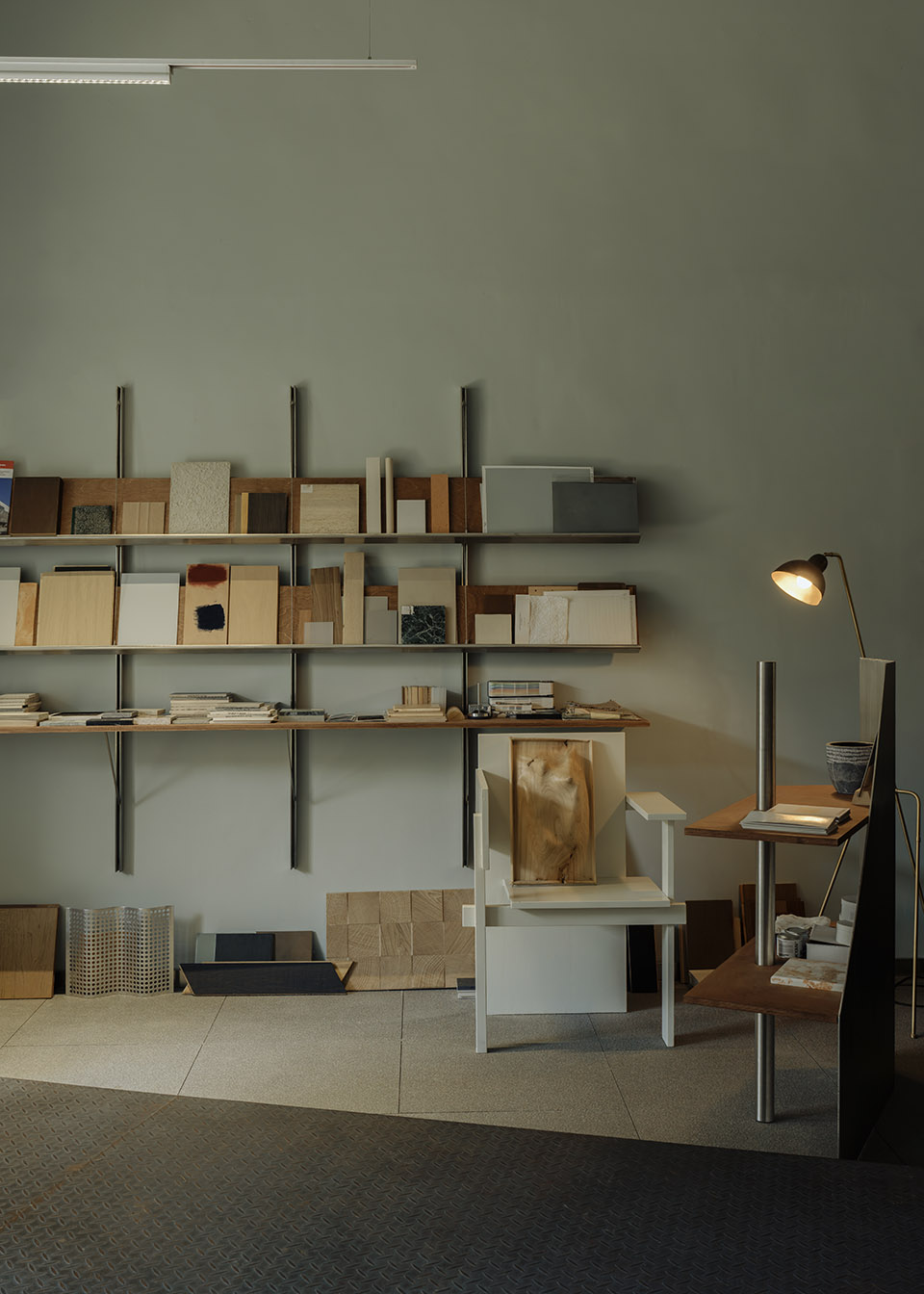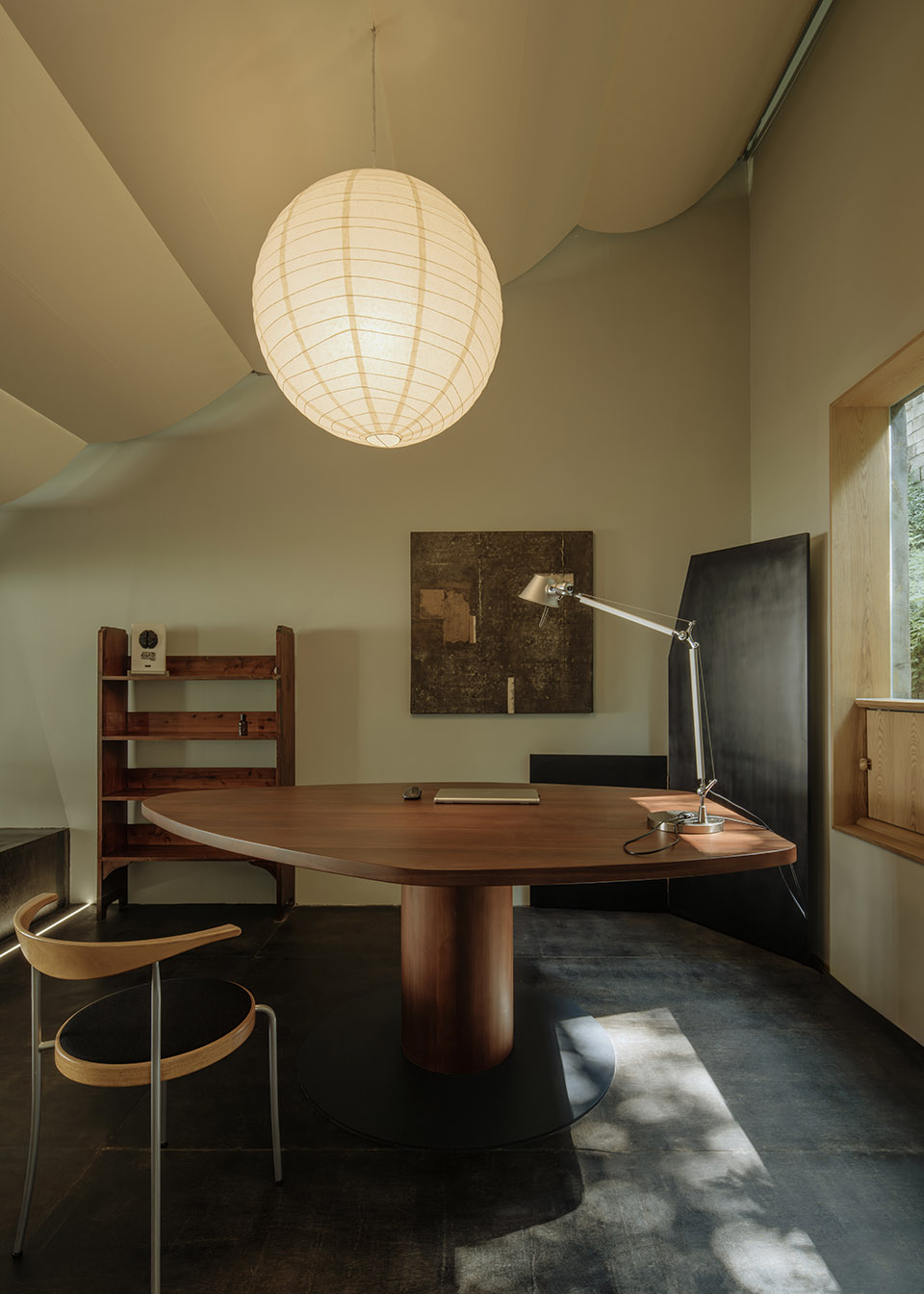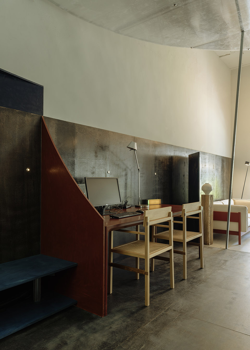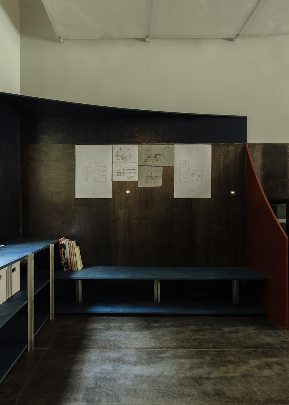 沿动线回环迈步上行,在动态行进观察的各焦点位置,我们布置了不同的景观式家具。家具设计方面延续了Modum&ATE SIMO联名展架系统的建构逻辑,即尽可能的利用角钢和扁钢等易得标准品材料,通过拟态木构的方式带来节点的形式美感。不同的是,在我们自己的工作室中,尝试了与更多有趣材料的组合,比如大漆、木蜡油海洋板。无法控制预期效果的材料尝试给我们带来了很多启发和偶得效果。此外,在这一次的系统家具设计中,我们尝试融入一种“开放形式”和“未完成感”。有此思考发自对意大利建筑师Umberto Riva自宅项目的研究。Riva在作品中有着强烈的“模糊物的第一性”的倾向,如溯上墙壁的餐桌和与天花断开的隔墙。其中应有之义便是打破空间中各类型陈设的“应有之貌”,模糊家具与空间的边界。形式语言在此思考框架下获得了释放,如翼展的双圆弧办公墙桌、单吊线线性灯、曲线切割的屏风和角柜。工作室项目容许我们实现一次边界尝试的游戏。