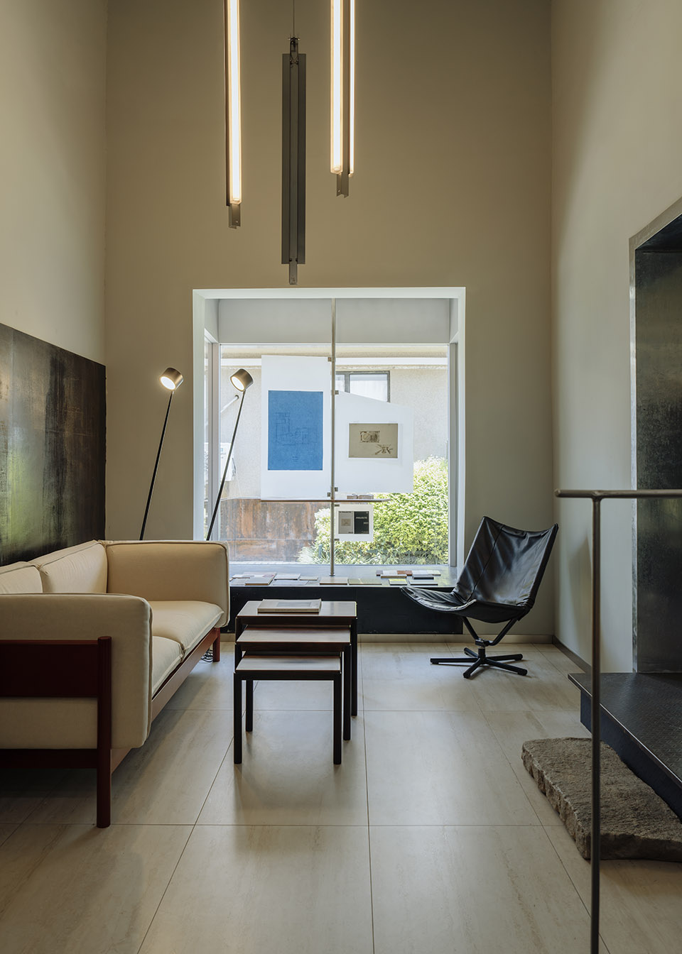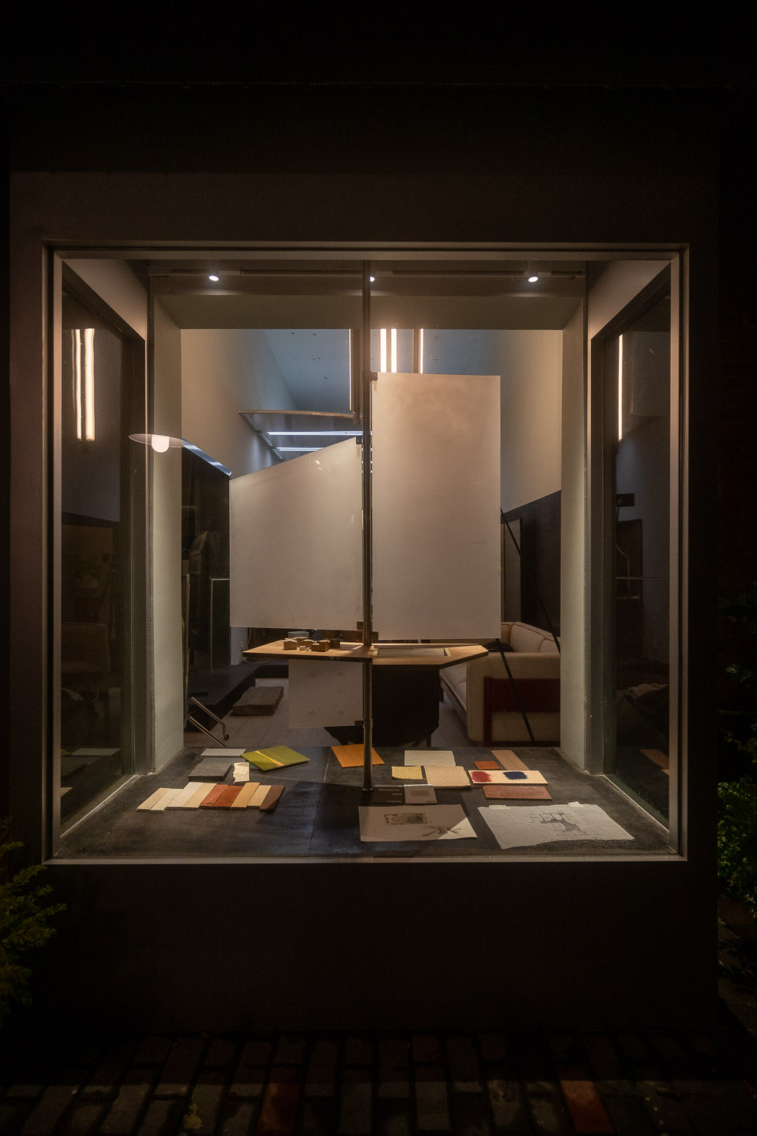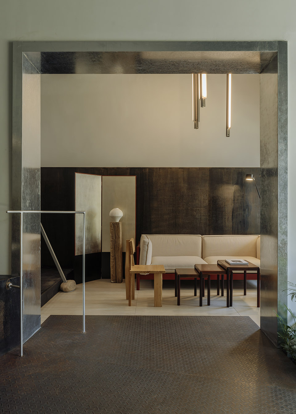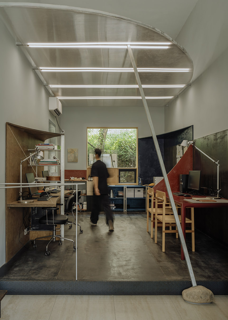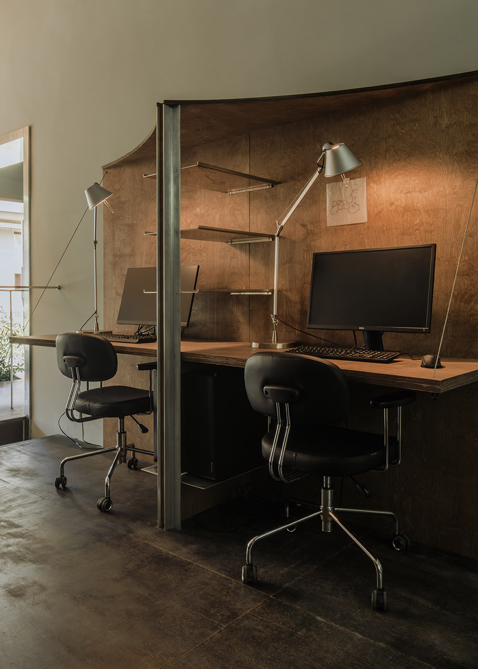 沿动线回环迈步上行,在动态行进观察的各焦点位置,我们布置了不同的景观式家具。家具设计方面延续了Modum&ATE SIMO联名展架系统的建构逻辑,即尽可能的利用角钢和扁钢等易得标准品材料,通过拟态木构的方式带来节点的形式美感。不同的是,在我们自己的工作室中,尝试了与更多有趣材料的组合,比如大漆、木蜡油海洋板。无法控制预期效果的材料尝试给我们带来了很多启发和偶得效果。此外,在这一次的系统家具设计中,我们尝试融入一种“开放形式”和“未完成感”。有此思考发自对意大利建筑师Umberto Riva自宅项目的研究。Riva在作品中有着强烈的“模糊物的第一性”的倾向,如溯上墙壁的餐桌和与天花断开的隔墙。其中应有之义便是打破空间中各类型陈设的“应有之貌”,模糊家具与空间的边界。形式语言在此思考框架下获得了释放,如翼展的双圆弧办公墙桌、单吊线线性灯、曲线切割的屏风和角柜。工作室项目容许我们实现一次边界尝试的游戏。