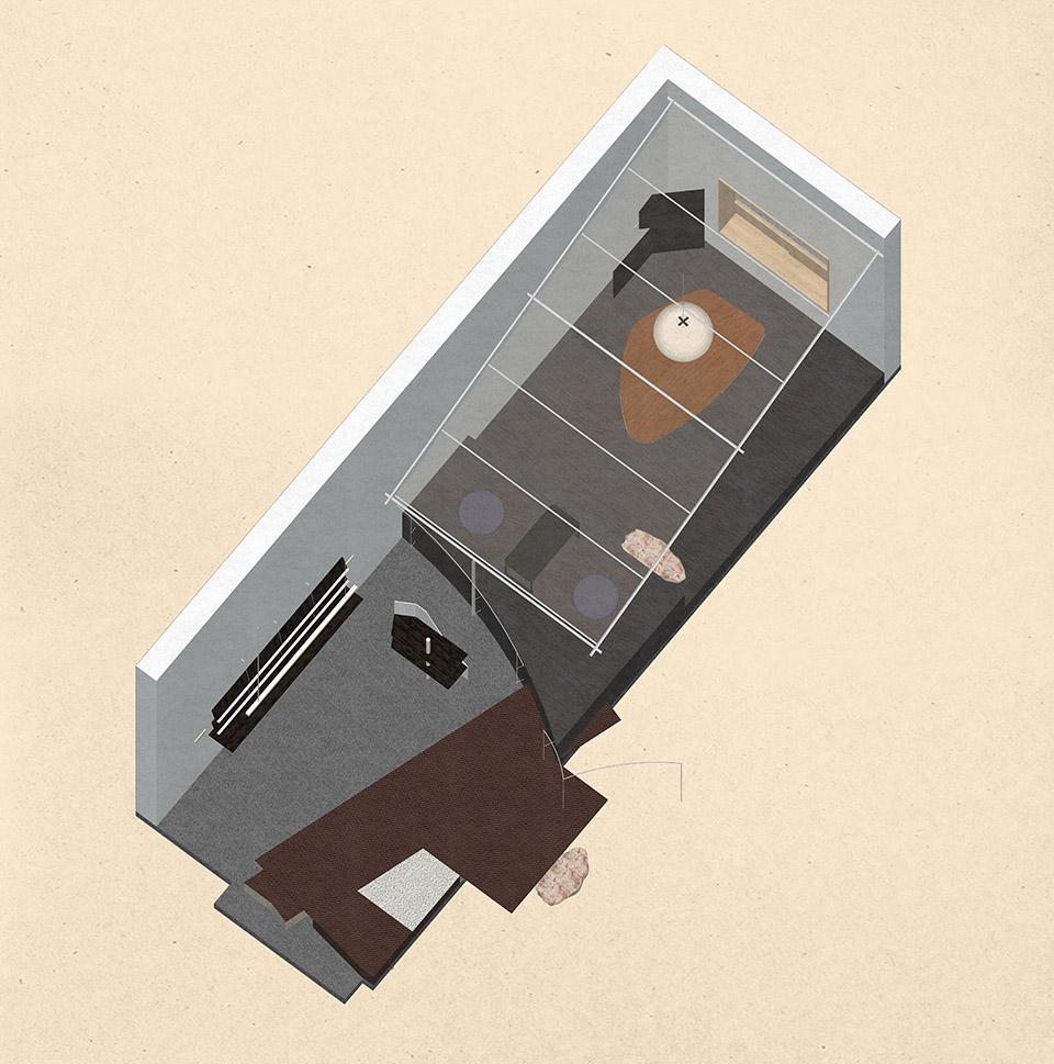 层高过高与地势低洼两个问题并置一块,解题思路也自然产生。利用层高的可能性,将不同功能的空间设计为“嵌套进室内的小房子”。每个小房子都有着作为建筑本体所必备的构成元素,比如柱、屋顶、开口等等。每个房间由其平面位置决定被带到不同的标高上,经由重构入口高度和重划路径,在解决雨水、融雪倒灌问题的同时,平添些游园式的意趣。
