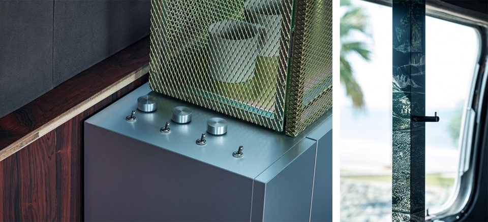 为了让使用者可以在任何环境下享受360度的窗景,设计者将拖车的上部和下部材料调换过来,使所有的必要功能都集中在车辆下部,以留出最大的车窗视野。那些不可避免需要突出于上部的家具均采用了网状或透明材料,或者缩小了体积。为了避免在外壳上形成过于明显的对比,设计尽可能保持了老式拖车的质感,仅做了防水处理等少量改动。