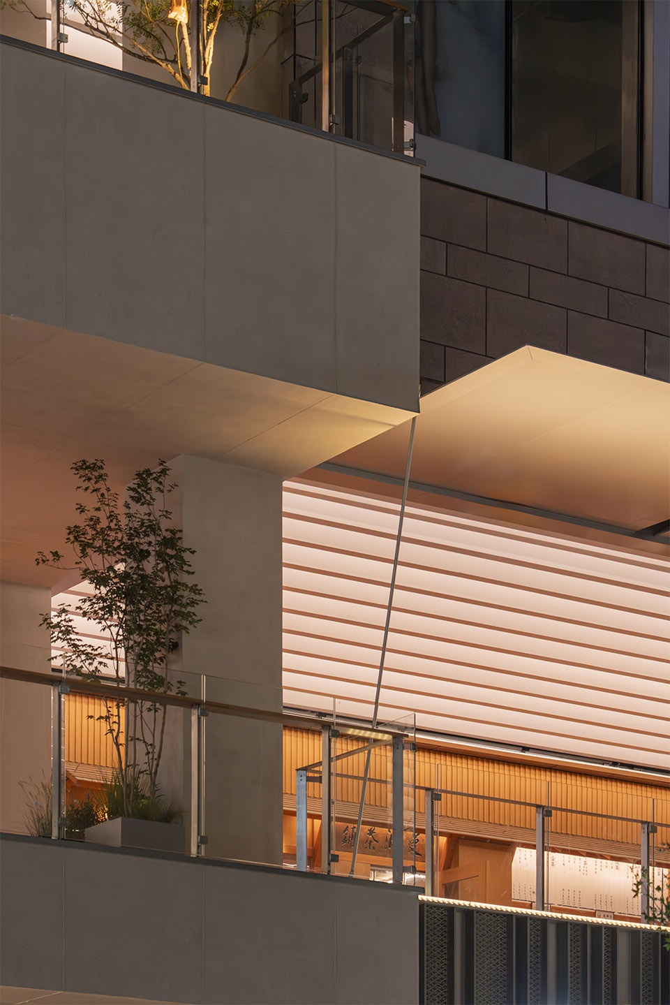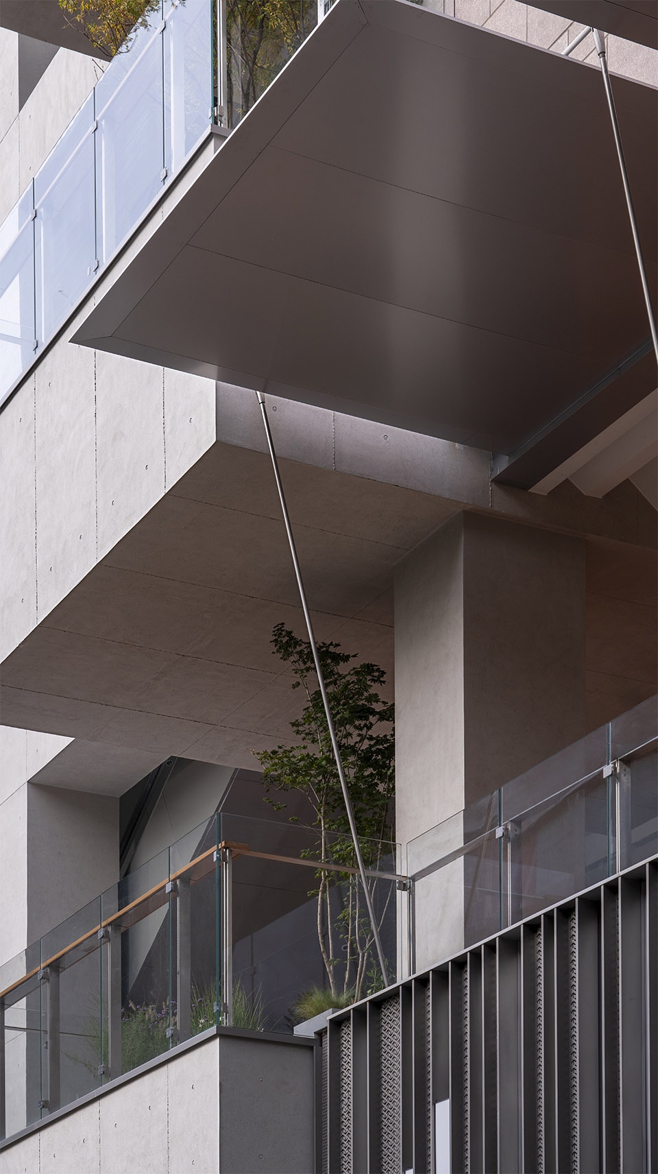 新立面的材质语言冷静而克制,以浅灰色混凝土作为基底,但在关键的互动界面则介入了阳极氧化铝等精致的金属质感。纤细的金属拉杆支撑着外挑的遮阳棚,使其在视觉上显得格外轻盈。精心布置的绿植花池作为”垂直花园”的载体,点缀在各层平台之上,树影婆娑,不仅为建筑注入了生机,更将小镇的自然气息垂直向上延伸。