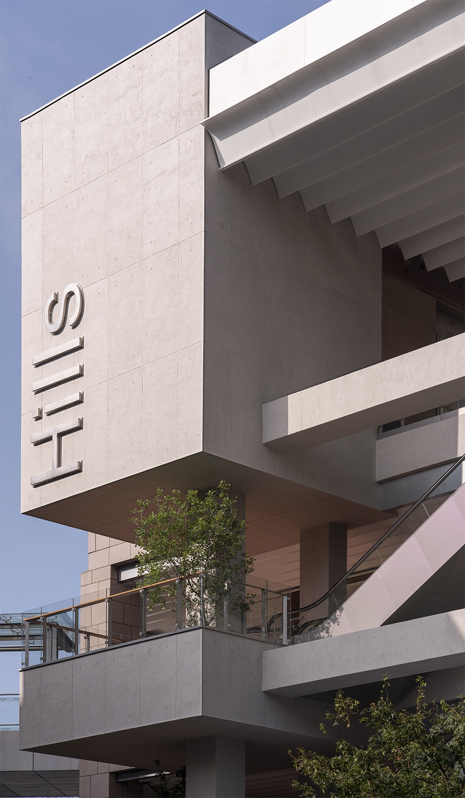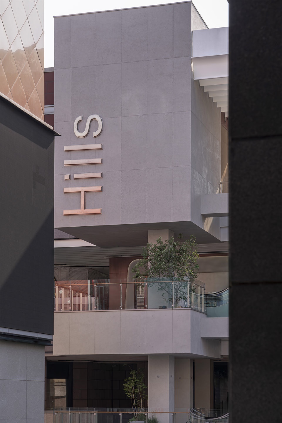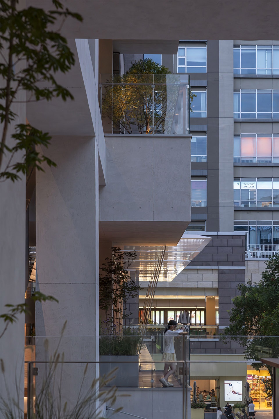 在各层,设计增设了外挑的平台,作为休息和拍照的”打卡点”,同时也成为广场与楼上相互对望的观景台。这些外挑的平台,将原本平面的建筑‘界面’(Façade)转化为一个上演着城市生活的立体‘舞台’(Stage),让楼上楼下的人们相互观看,共同构成了一幕幕生动的公共戏剧。为了呼应祥云小镇”花园式”的商业氛围,我们将绿植作为重要的设计元素,贯穿于整个立面。在各层平台精心布置花池和树木,不仅软化了建筑硬朗的线条,更将地面层的自然气息垂直向上延伸,创造出一个多层次的、充满生机的空中花园。
