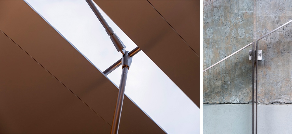 设计将二层连廊从纯粹的通行空间,转变为可停留的社交节点。为此,我们增加了功能性雨棚。其悬挑的姿态首先增强了对地面人群的视觉昭示;其次,它遮阳避雨的功能,结合栏板边的木质吧台,鼓励人们在此停留、喝杯咖啡、俯瞰广场。因为我们相信,真正的活力源于人们停留的意愿,而非简单的人流。这些停留、交谈、观望的人们,本身就构成了最生动的立面表情,成为了吸引楼下顾客的动态风景。