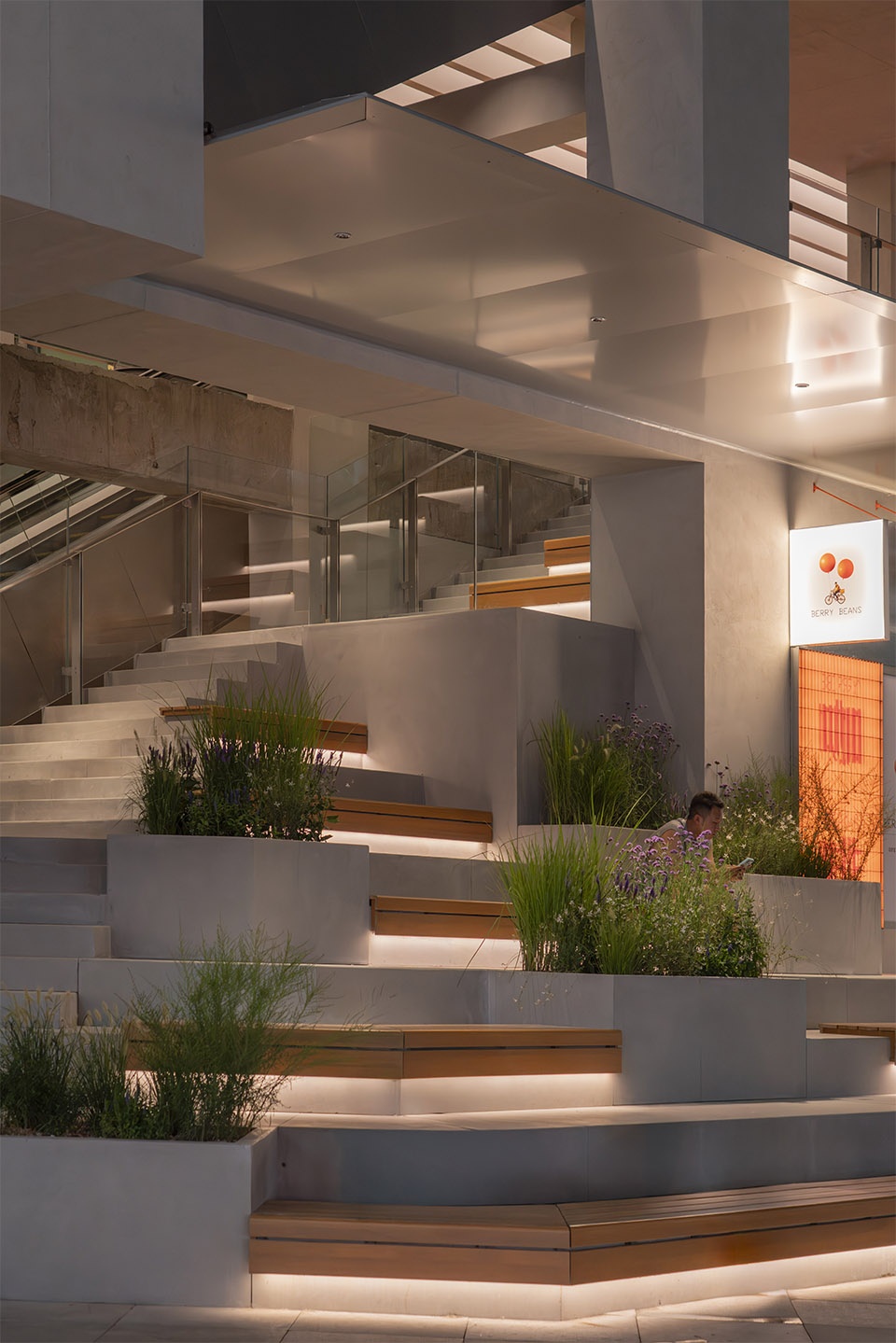 首层的大台阶成为了广场的自然延伸和”城市看台”,吸引着人们在此停留、聚集并向上探索,孩子们的欢笑声与家长们闲适的身影交织在一起,充满了生活气息。二层及三层的”打卡平台”因功能雨棚的加入而更具活力,人们愿意在栏板边的吧台小坐,喝杯咖啡,俯瞰广场上的热闹景象。这些停留、交谈、观望的人们,本身就构成了最生动的立面表情,吸引着更多地面游客的好奇心。