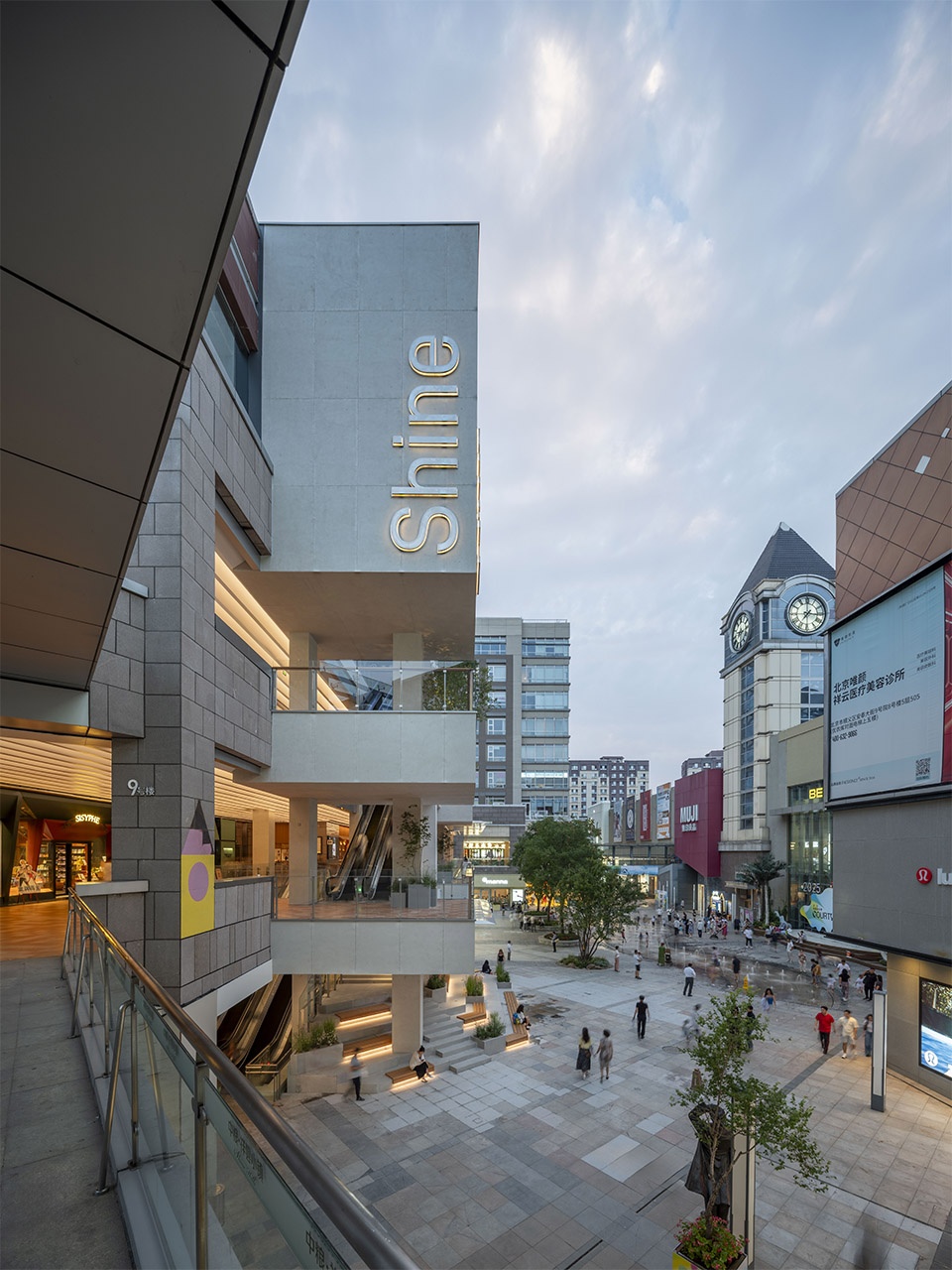 改造后的9号楼,以一种全新的、开放的姿态重新融入祥云小镇的公共生活。拆除幕墙后,建筑内部的商业活动、人流和灯光被完全释放,共同构成了一幅充满活力的、层次丰富的立面图景。