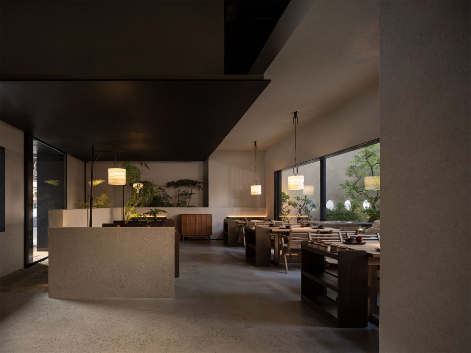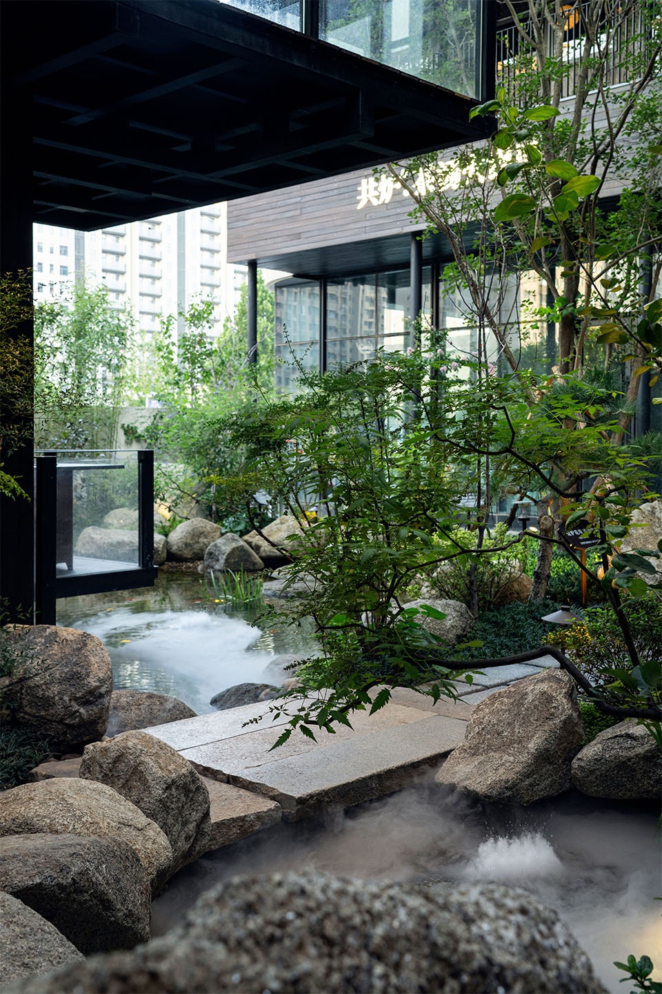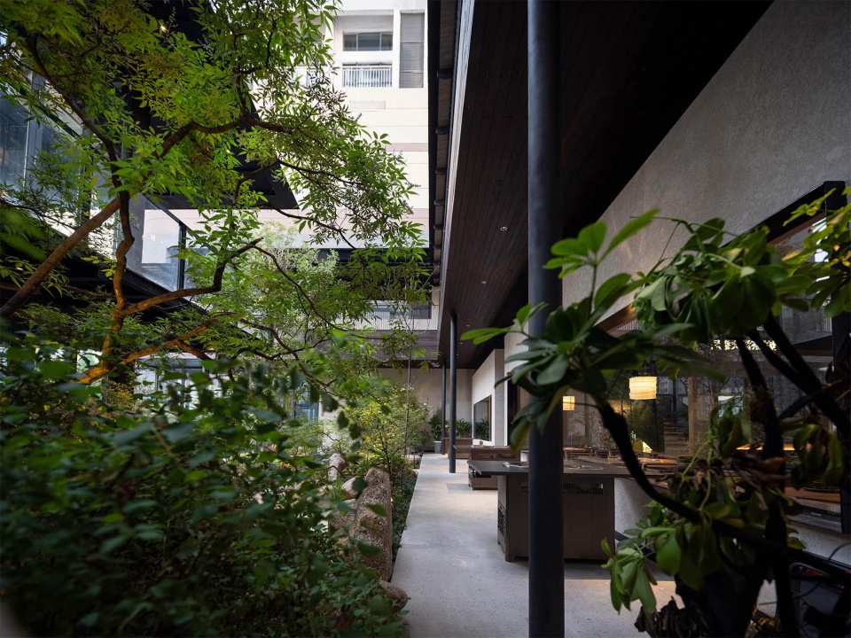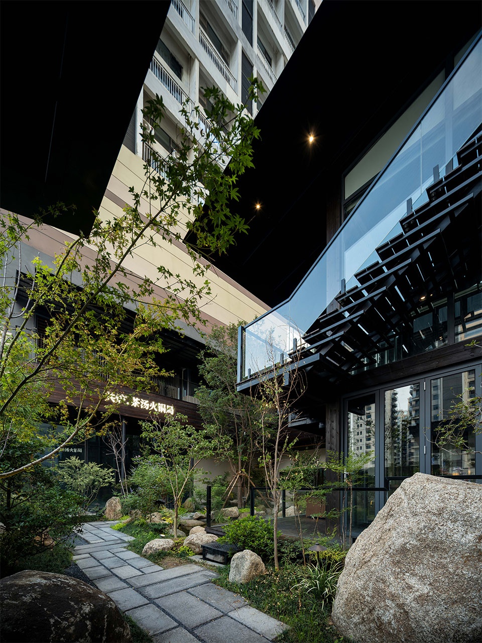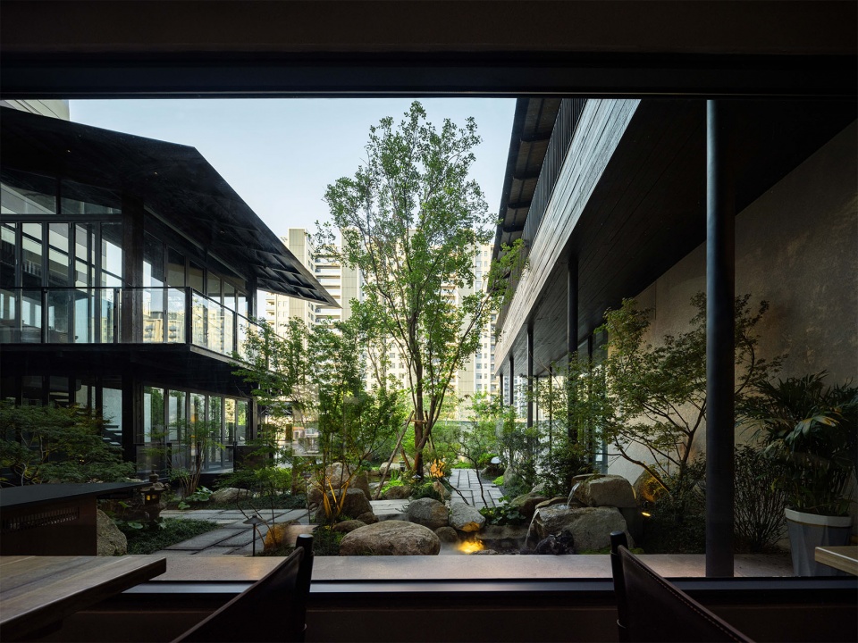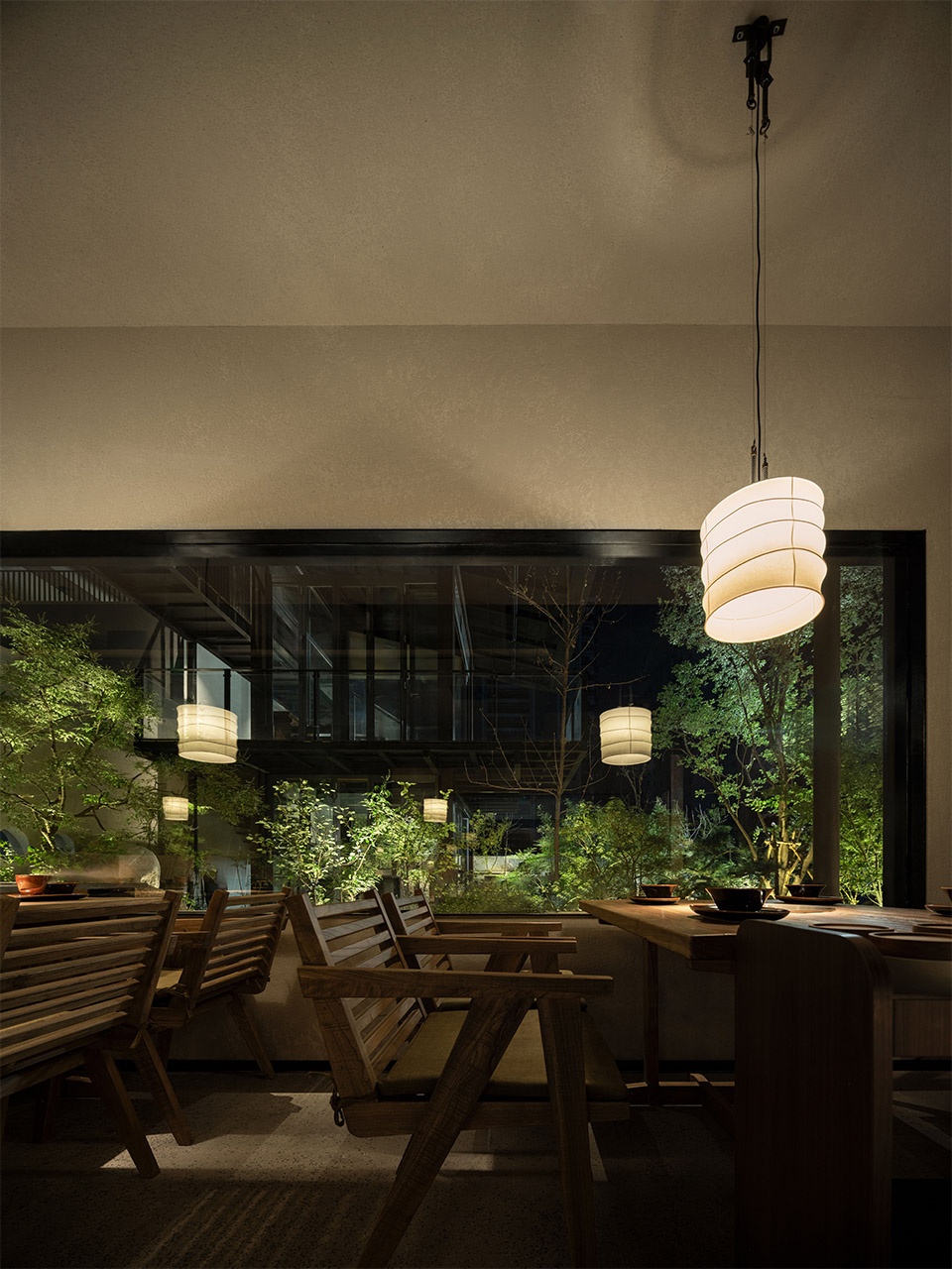 与品牌合作的多个门店,YOUNG团队始终在坚持将景观与就餐相融合。与以往受户型限制,多是利用不适合就坐用餐的区域,或是借街区外景来营造自然氛围不同,本案则是直接在围合区域内规划了一个小型的园林庭院。