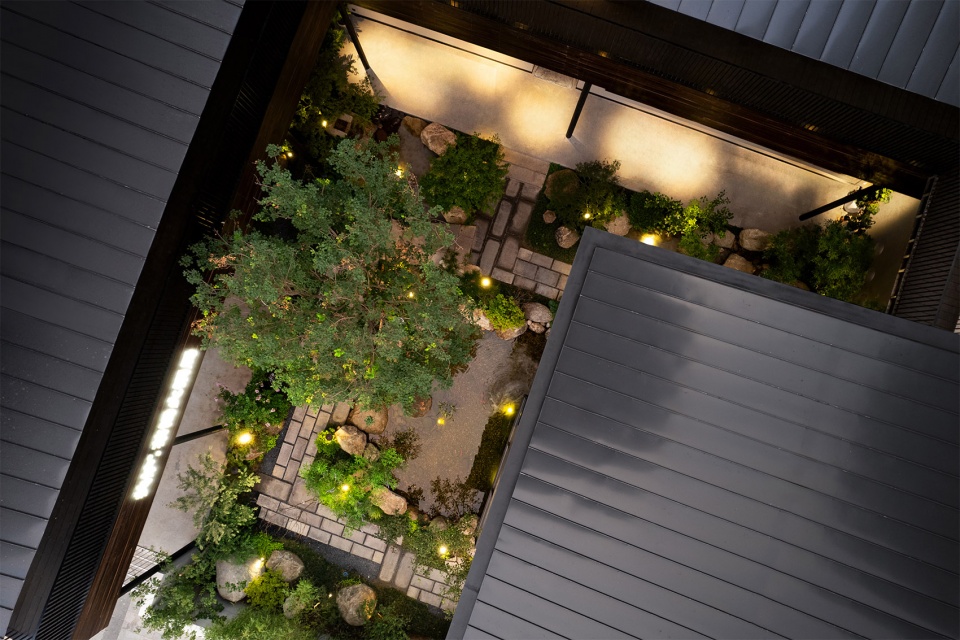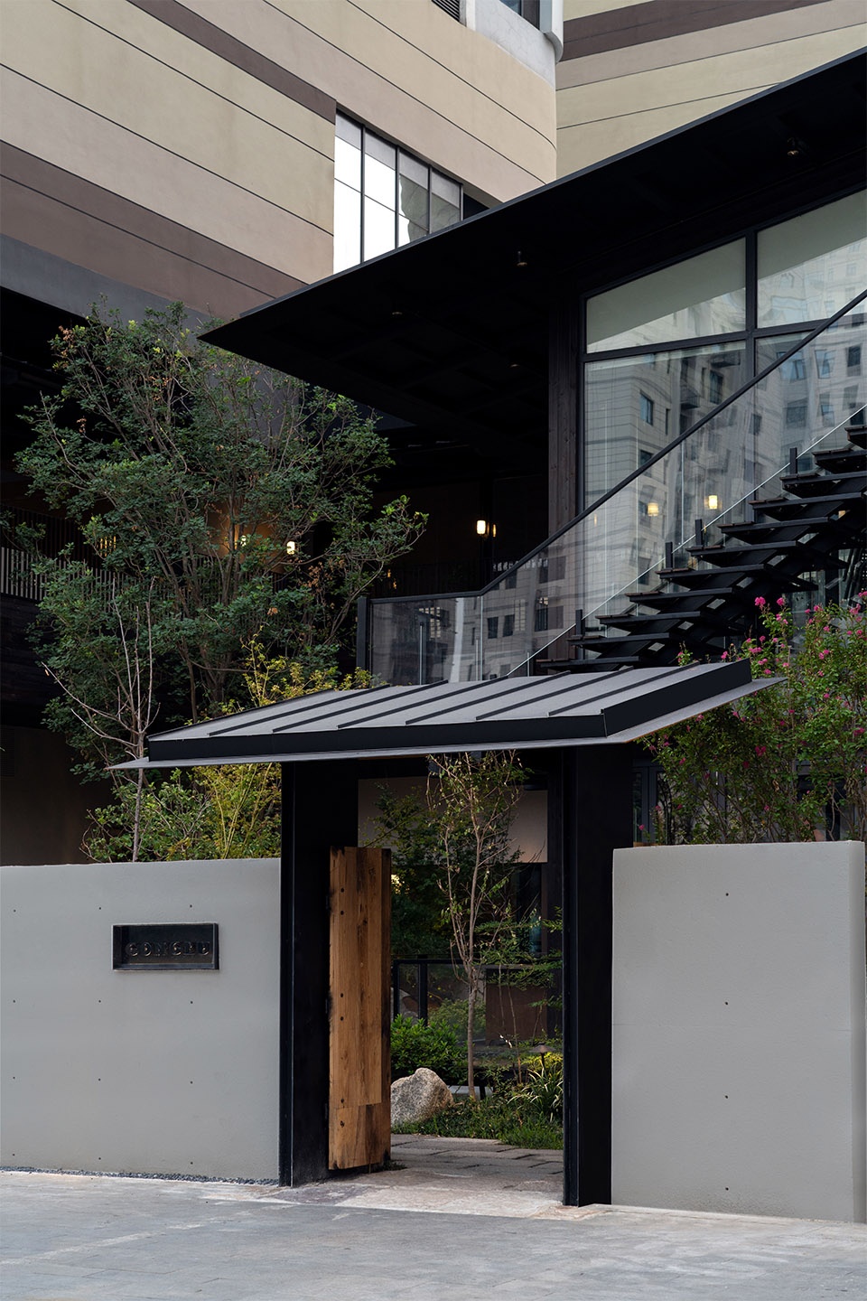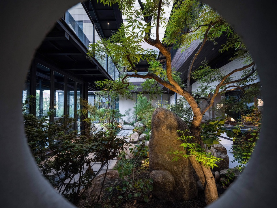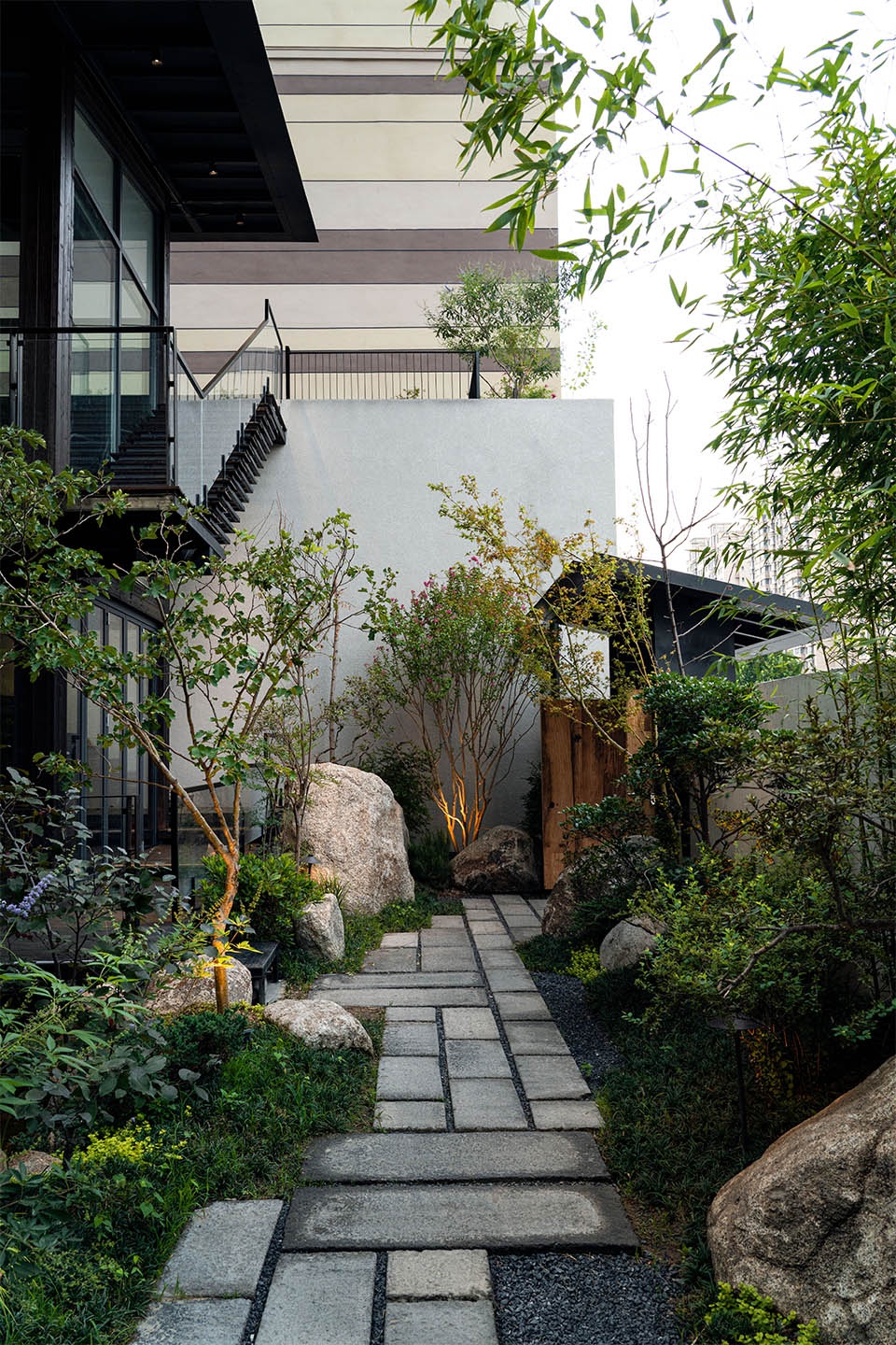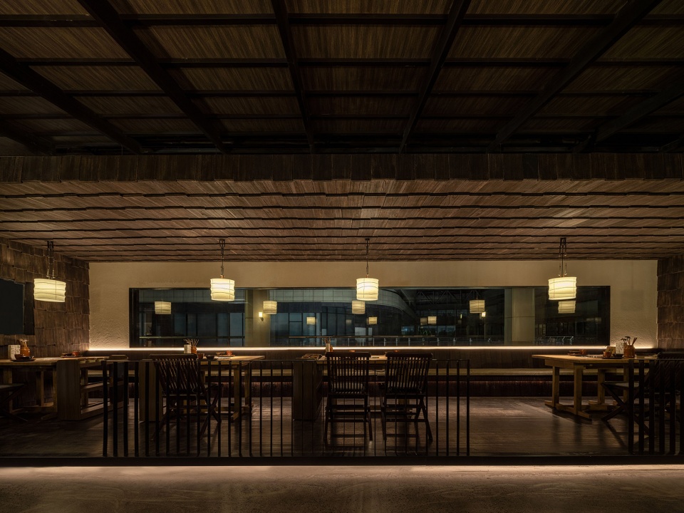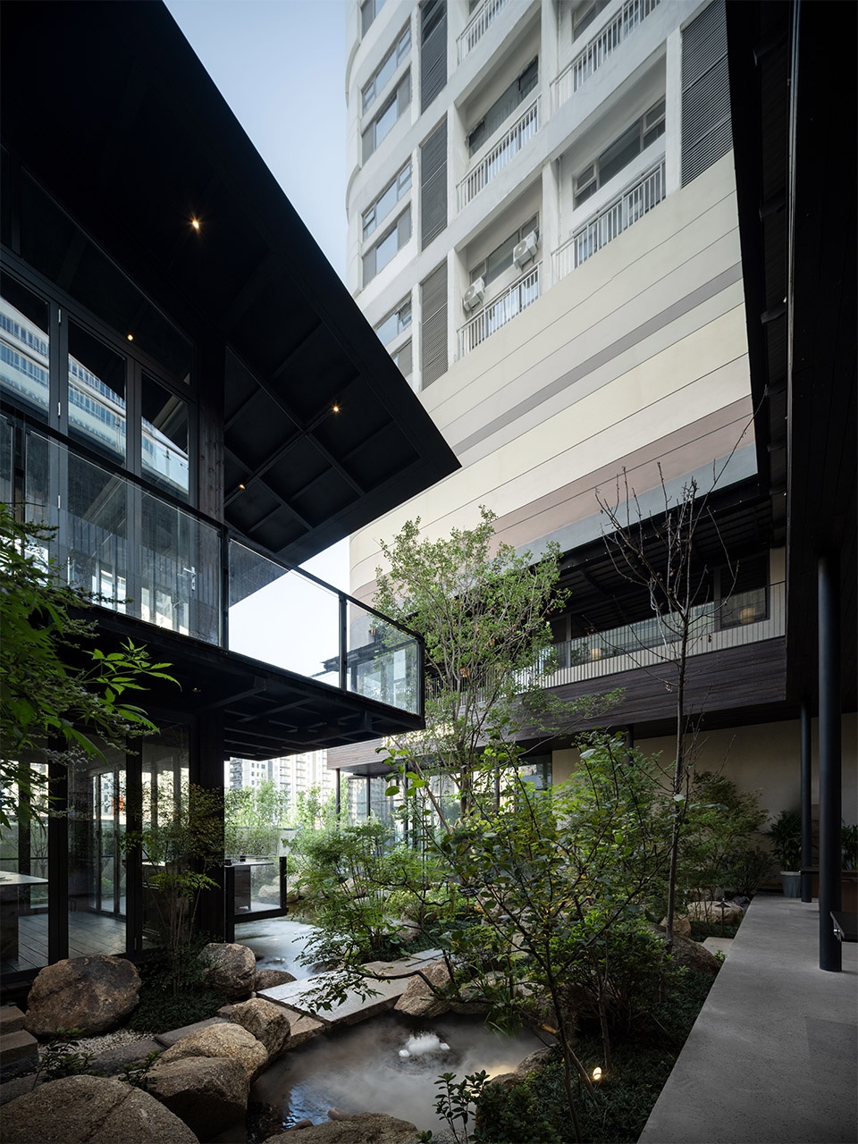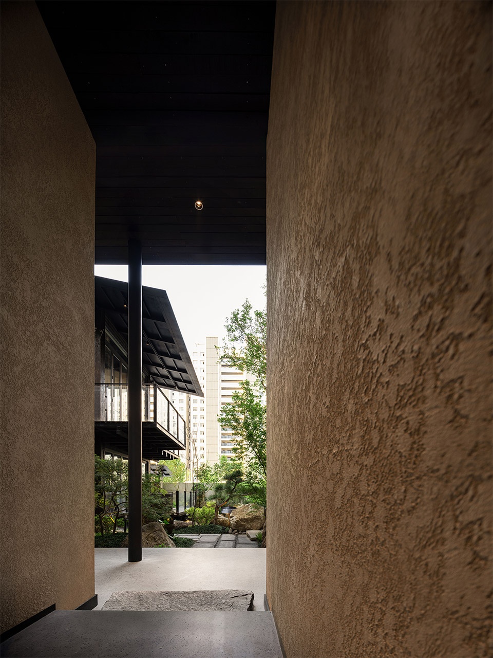 与品牌合作的多个门店,YOUNG团队始终在坚持将景观与就餐相融合。与以往受户型限制,多是利用不适合就坐用餐的区域,或是借街区外景来营造自然氛围不同,本案则是直接在围合区域内规划了一个小型的园林庭院。