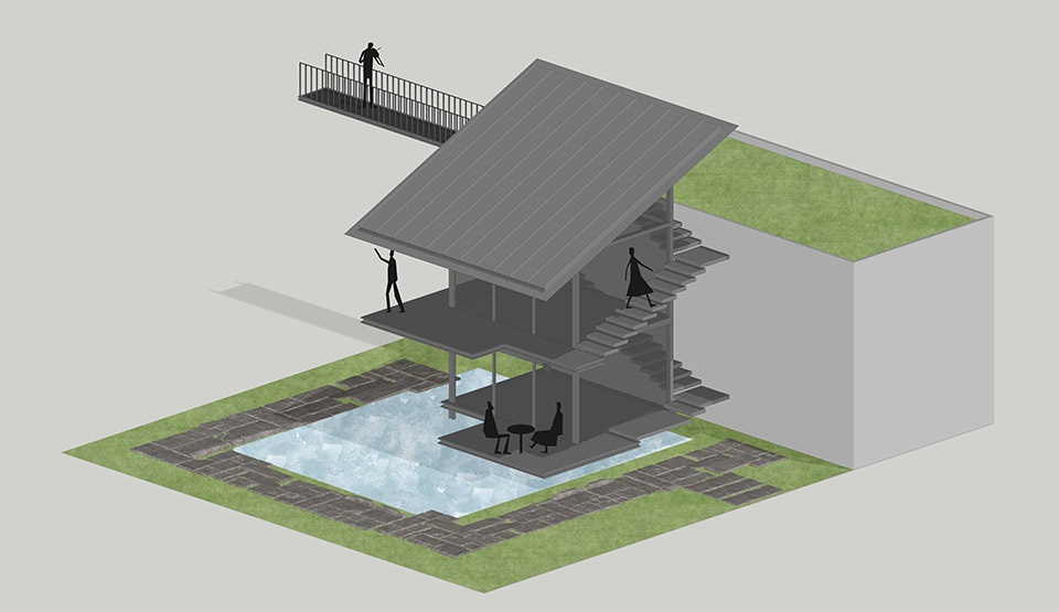 一层食客通过石板路,穿过树丛进入景观亭,二层则是经过风雨连廊,走过空中廊桥,迈入景观亭内。景观亭的楼梯则是环绕景观亭排布,螺旋上升。