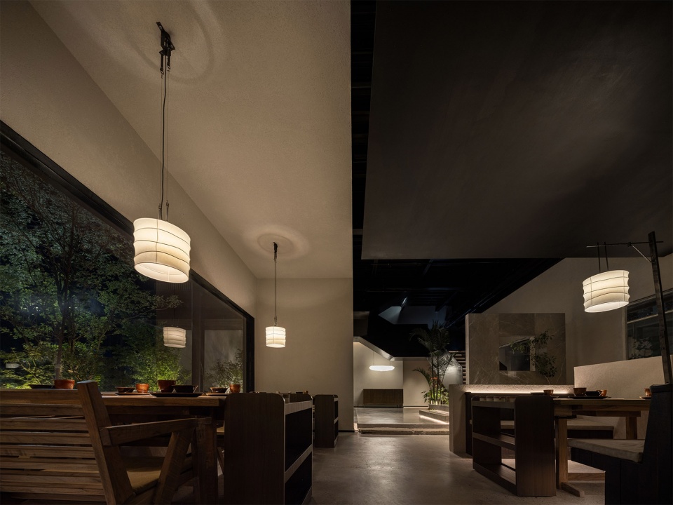 进入室内,YOUNG团队延续以往的思路,利用合适的空间栽种植物,将景观面窗户在合适比例下尽量做大,室内与户外景观相呼应,使食客们能体验到的不仅是锅内珍馐。在面对商场内部的墙体上则是重点区域开窗,保证室内通透,也间接对外展示室内火热场面。