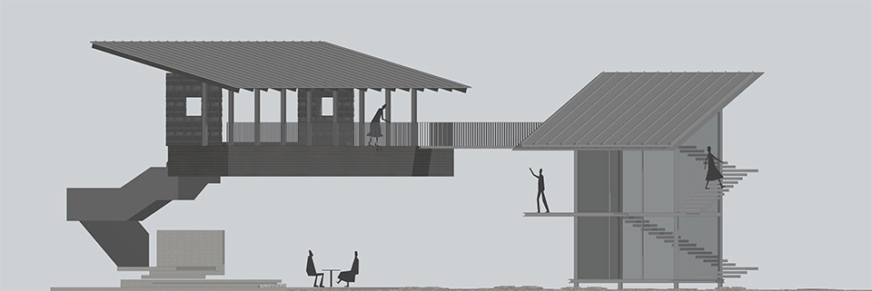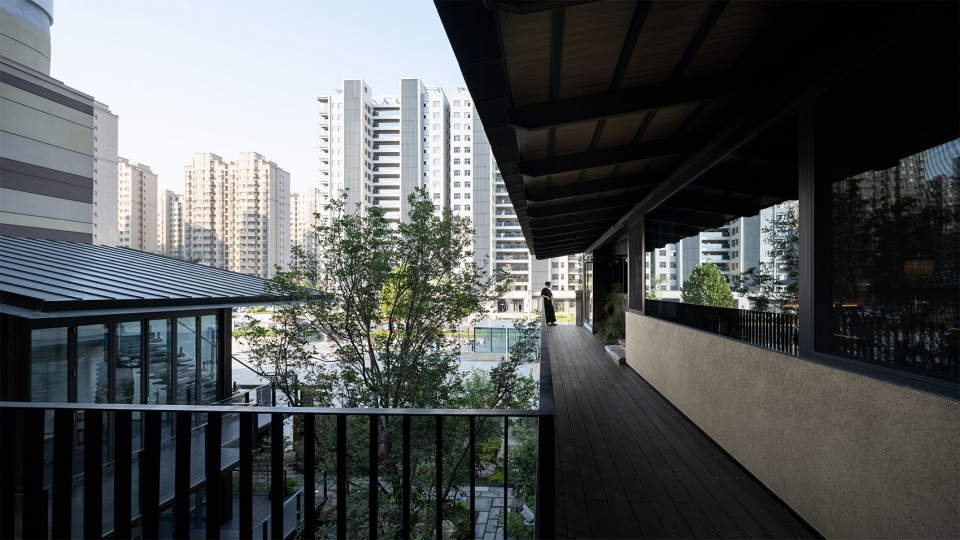 外挂的楼梯保证了景观亭内空间的相对独立,给予亭内食客一定隐私感的同时,又保证了去往二层小院及二层用餐区路线的通畅。