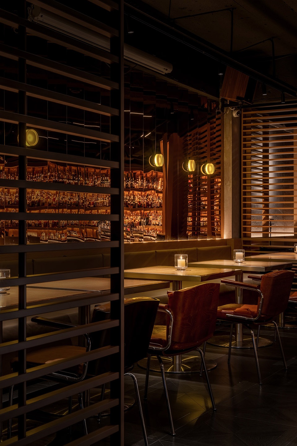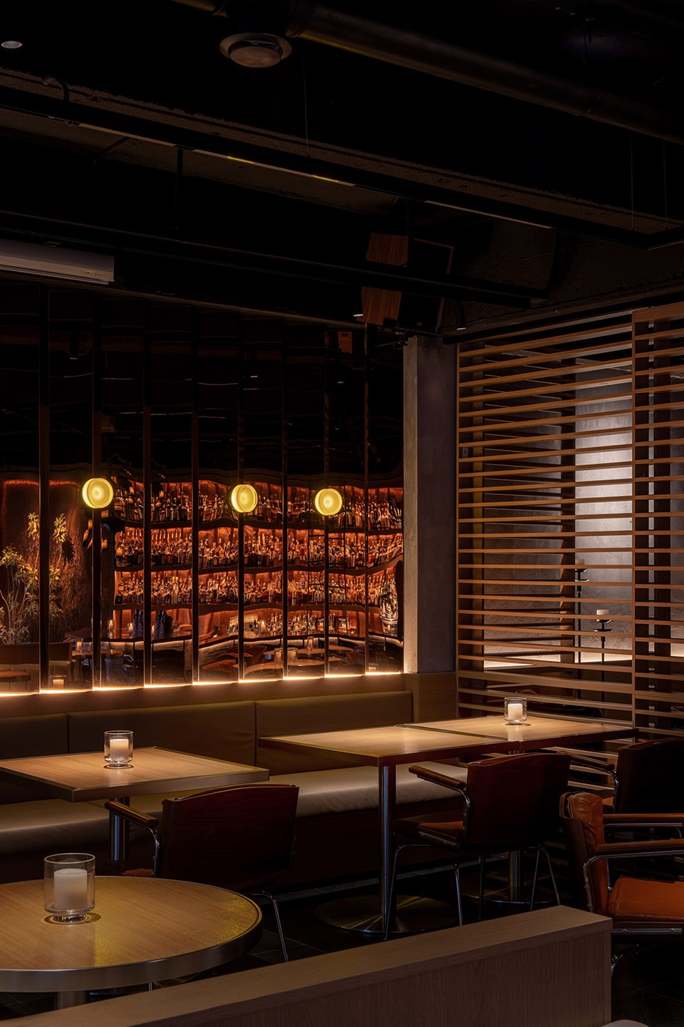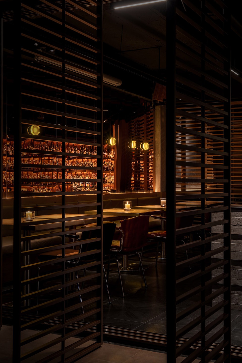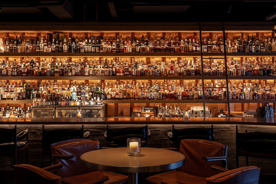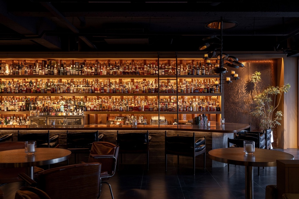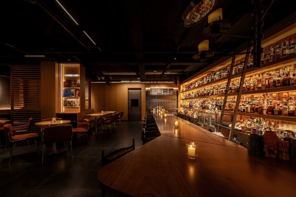 由于空间对酒的陈列数量有较大需求,我们在吧台一侧做了层次丰富的酒墙,可以借助梯子够取高处的酒。酒架的背面同样使用了反射材料,用做旧金属板与酒瓶的光影结合,创造神秘的空间感受。