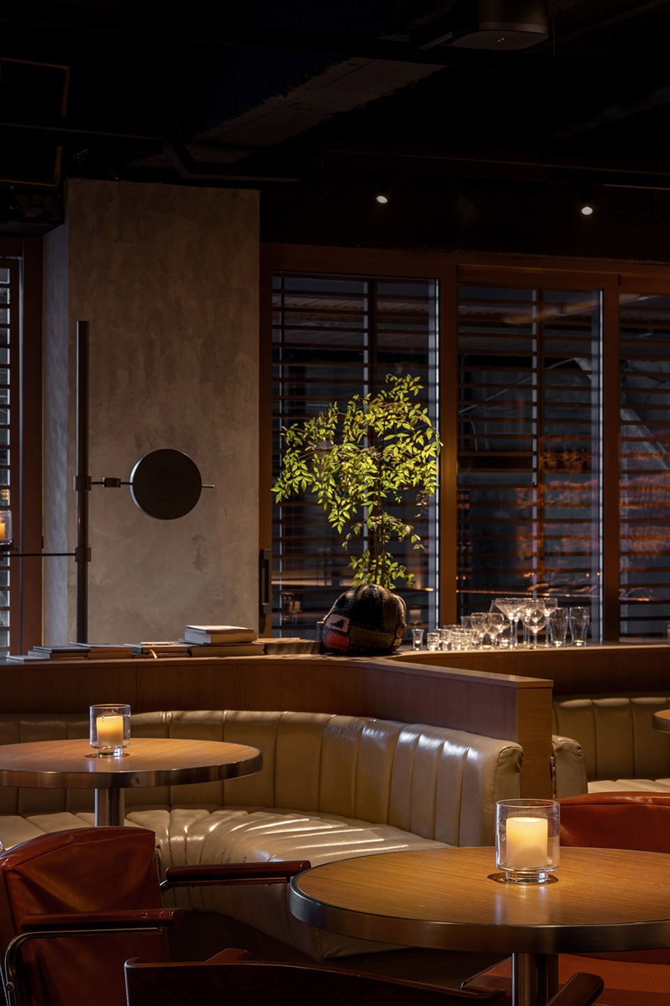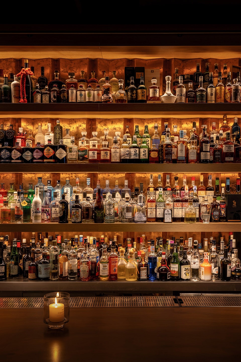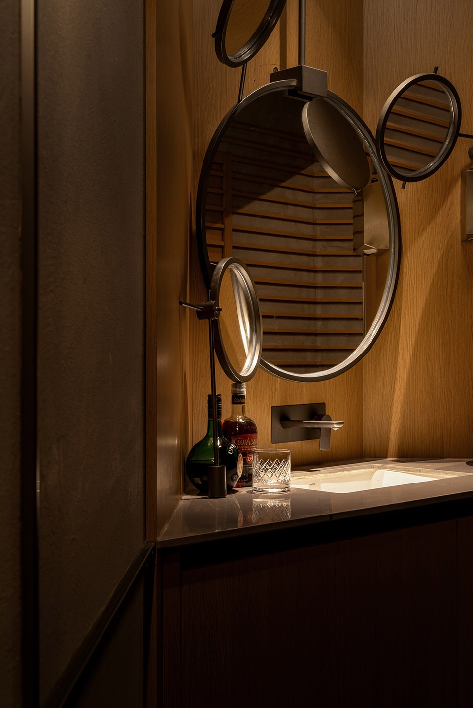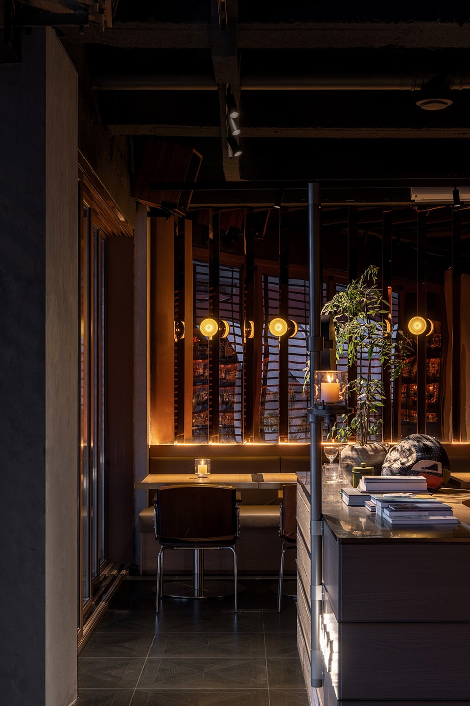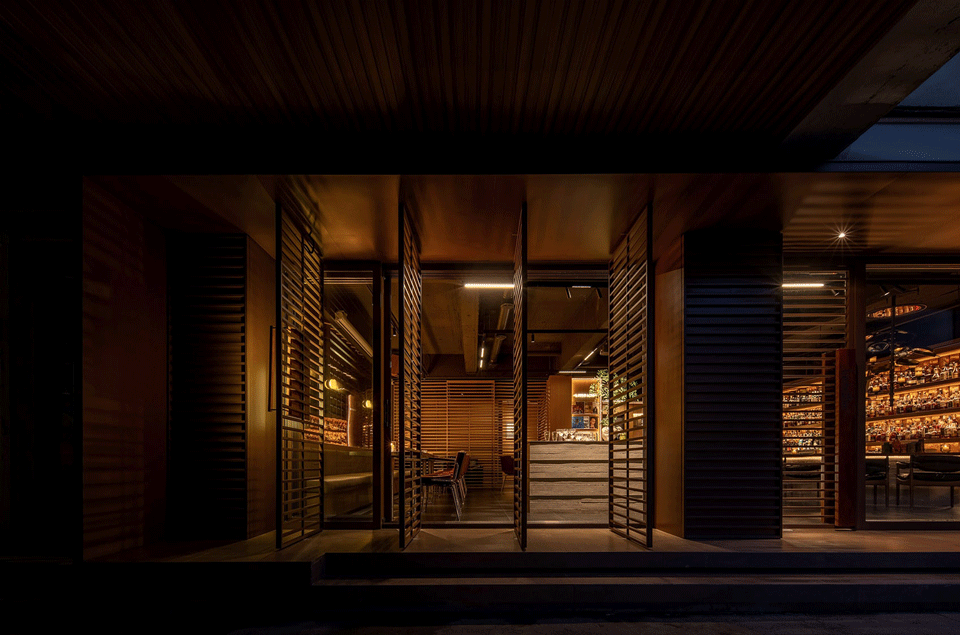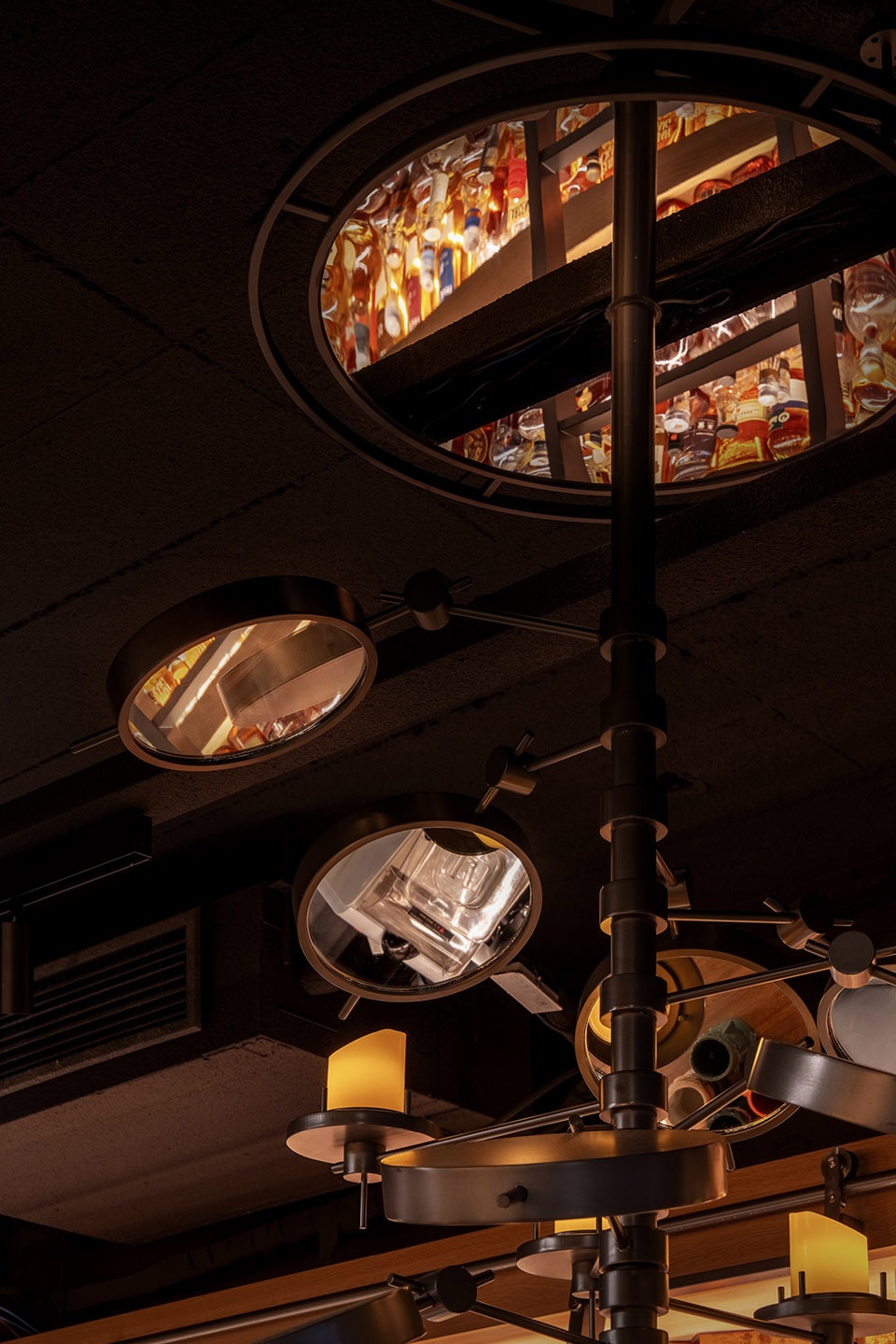 由于空间对酒的陈列数量有较大需求,我们在吧台一侧做了层次丰富的酒墙,可以借助梯子够取高处的酒。酒架的背面同样使用了反射材料,用做旧金属板与酒瓶的光影结合,创造神秘的空间感受。