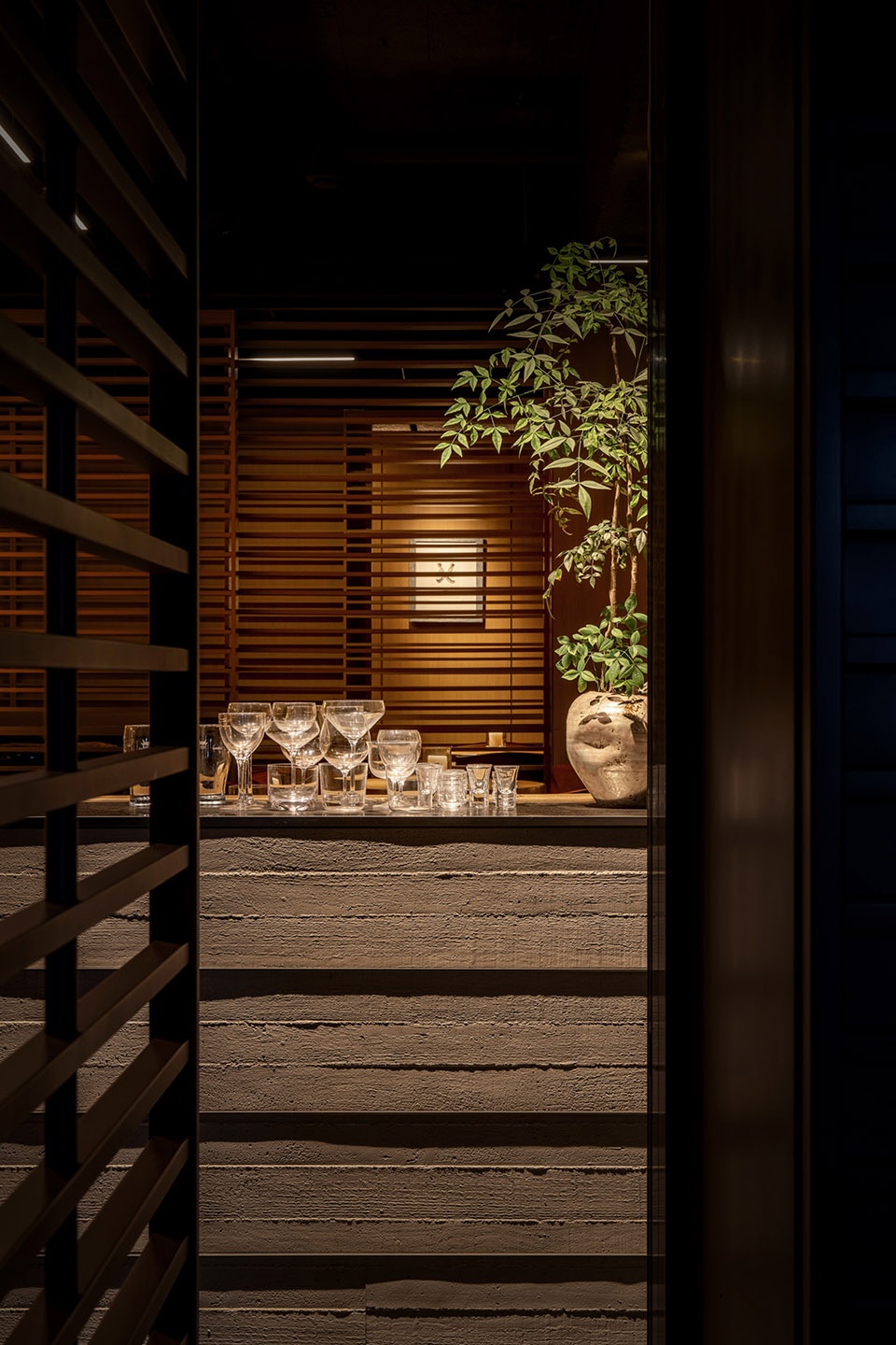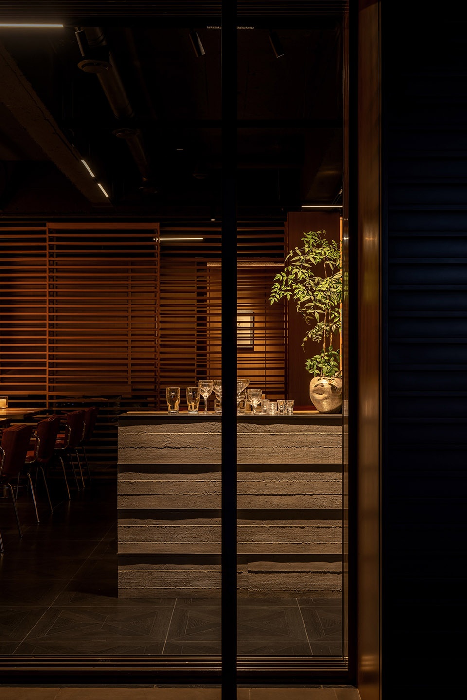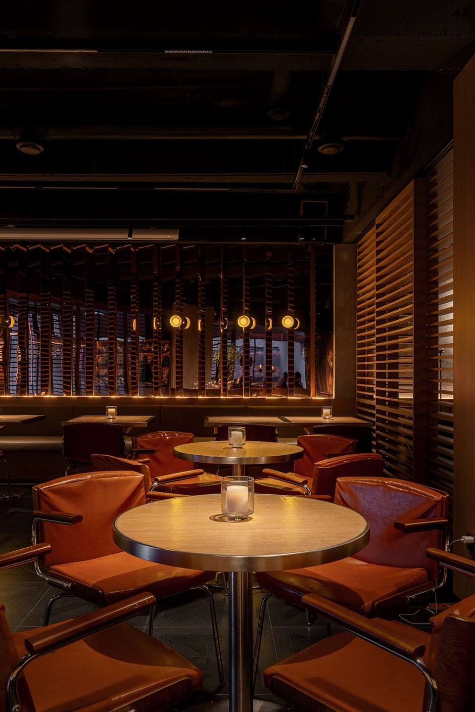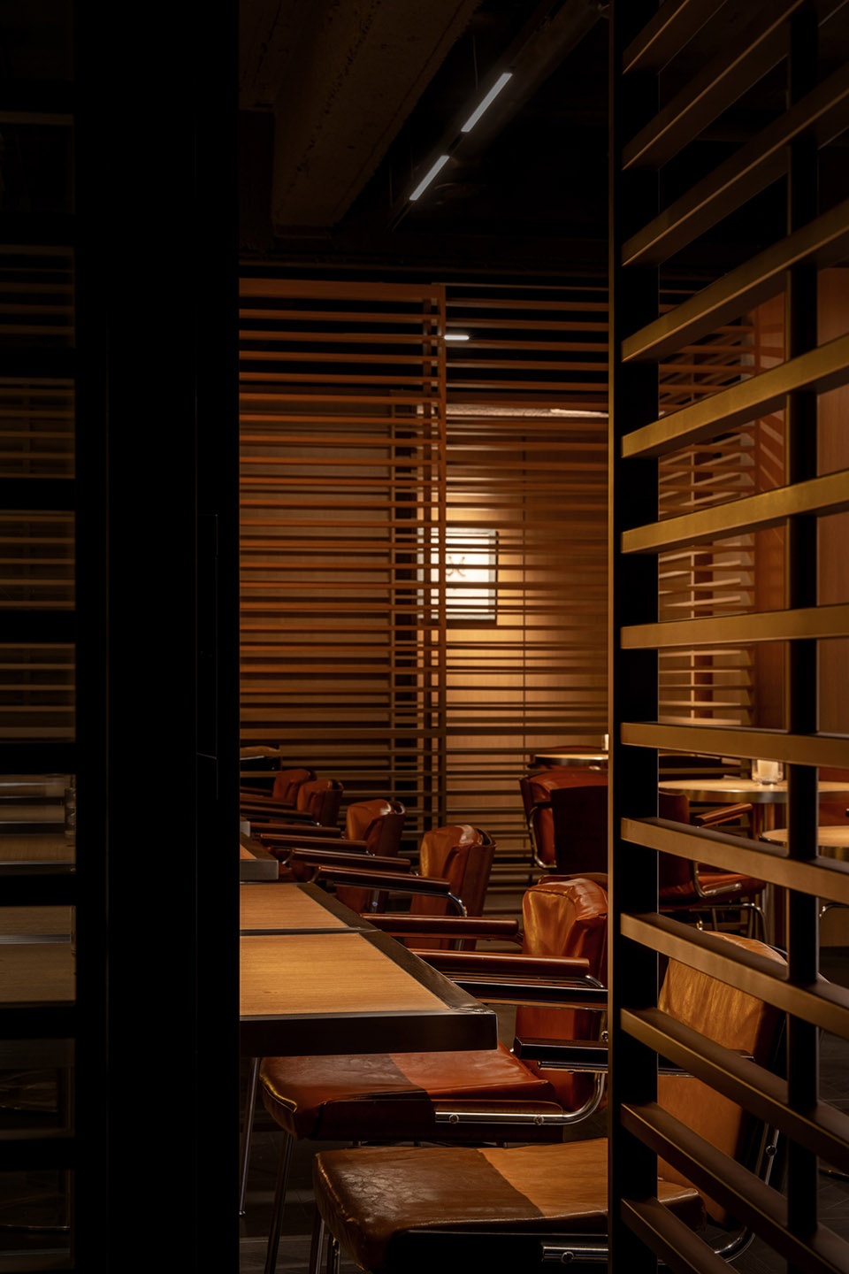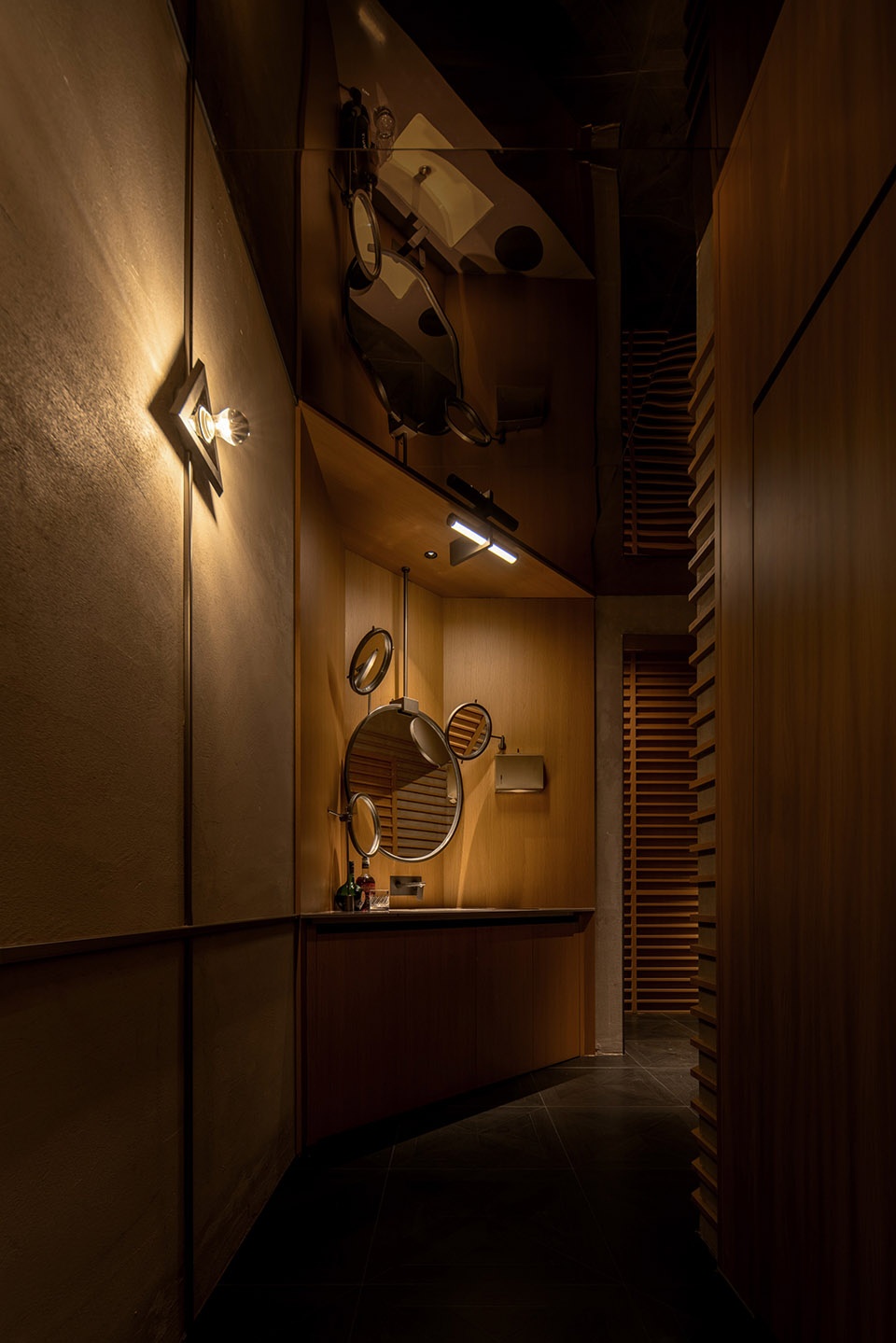 经营区的外立面若隐若现,在空间中运用了横向机理的隔扇体系,满足了外立面半开放的状态,同时也作为空间中延续的设计语言。我们在卫生间区域同样延续了空间中碎片化的反射效果,以及横向的设计语言,让空间延续成整体。