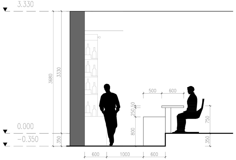我们在设计中将吧台内部操作区域的地面下沉,满足吧台区域为餐桌高度,打造更适合久坐的吧台空间。
