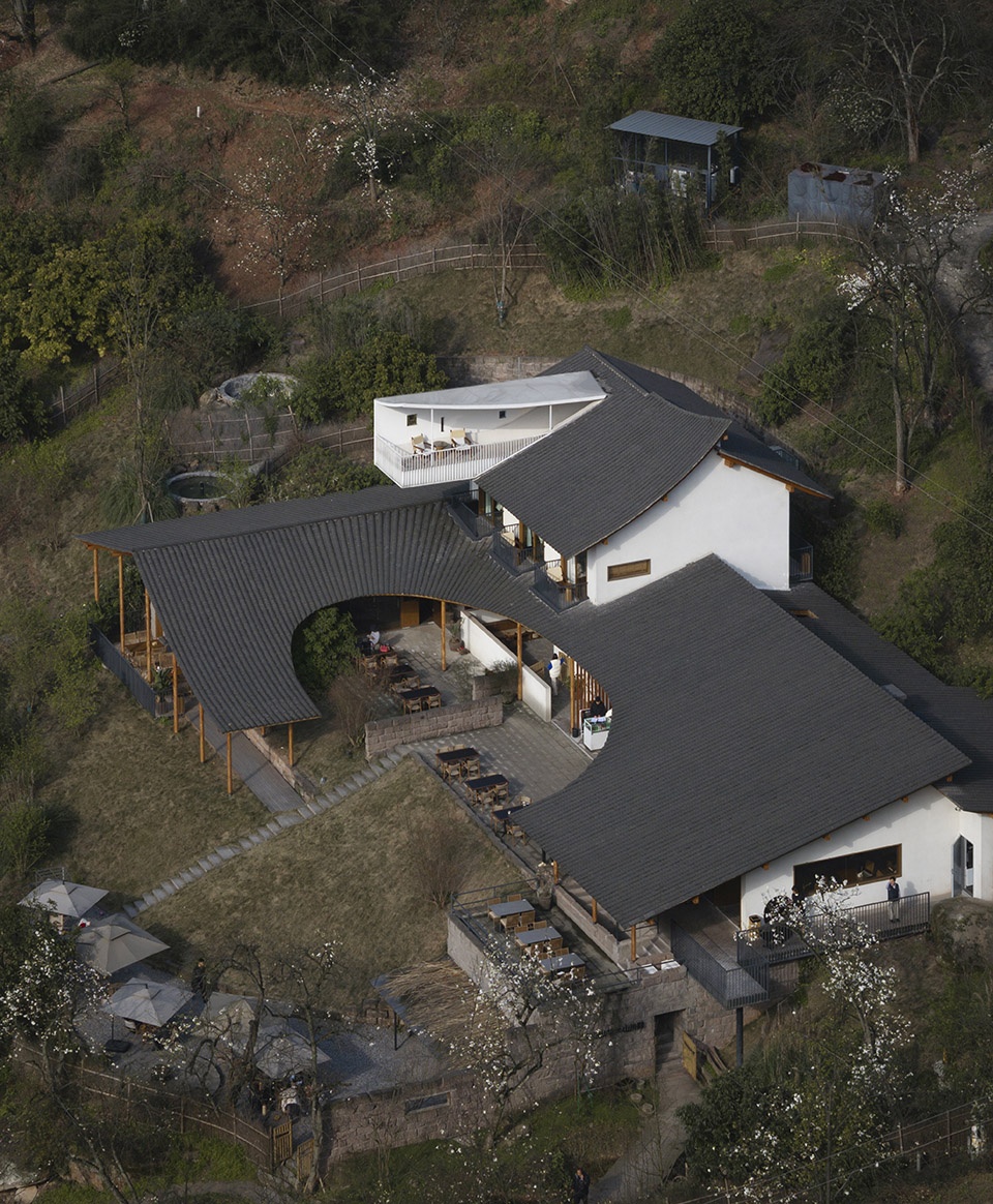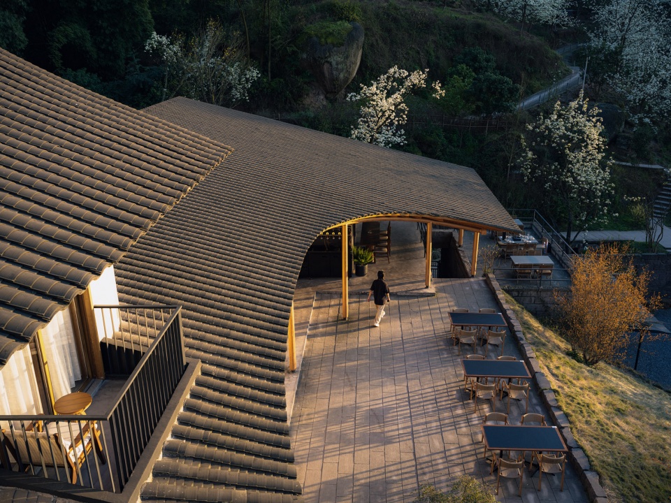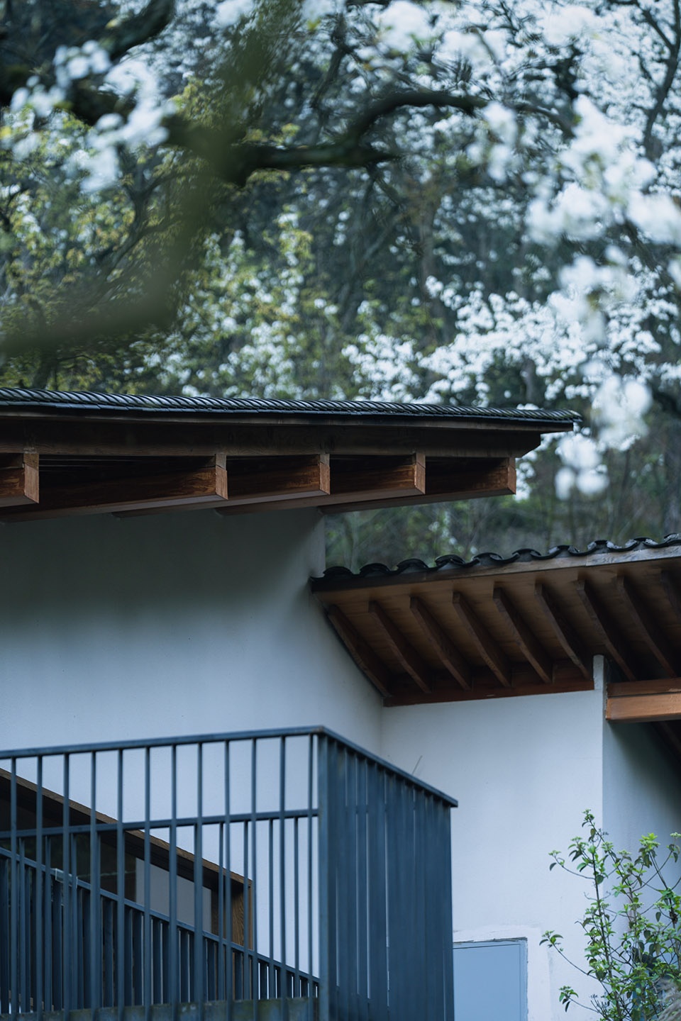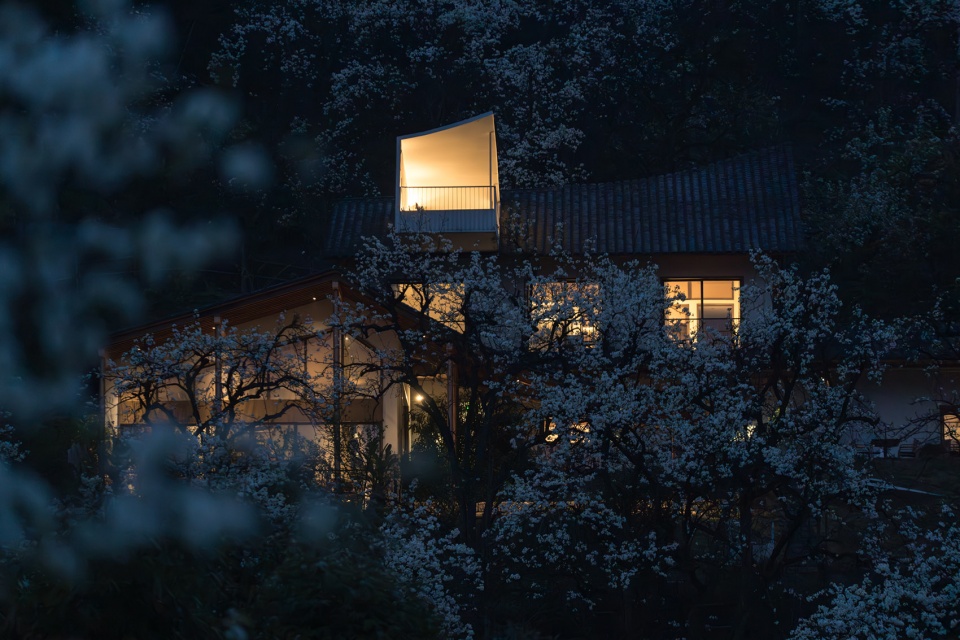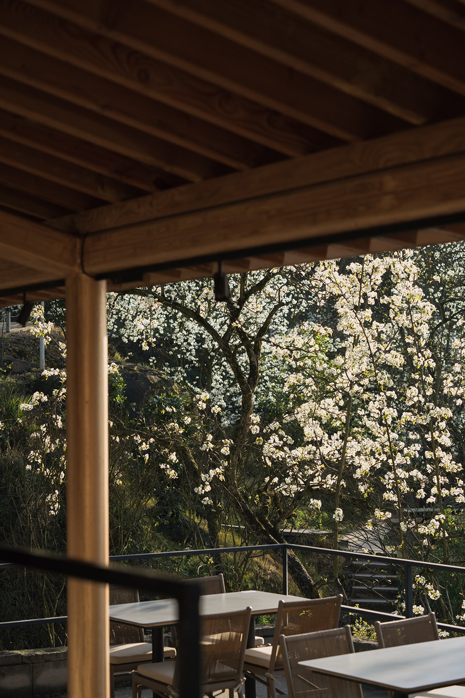 整个建筑基本保留原有民房的空间格局,宽阔巨大的瓦屋面将一层间断的建筑串联成一个整体,梨花瓣叩开一个类椭圆的异形庭院,相较于传统的方形院子更显灵动、柔美,屋檐下的天空形随人动,变化万千,为人们带来更加生动有趣的山野生活体验。二楼屋顶的彩钢棚也改成了瓦屋面,让整个建筑更加和谐统一。屋顶的观景台,犹如乌黑的梨树枝上一颗含苞待放的白色花苞,轻悠的悬在空中,赋予了不在山林独特的形象识别性。同时也为客人提供了一处俯瞰梨园幽谷和观看山林日落的绝佳场所。
