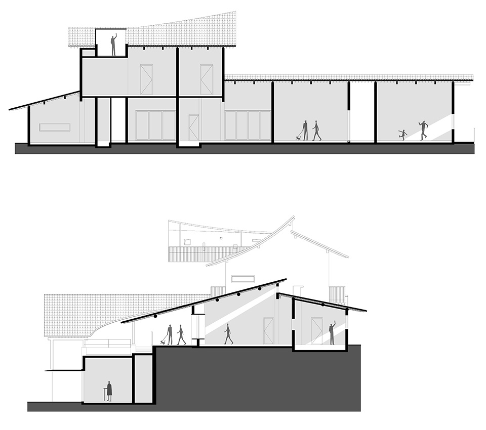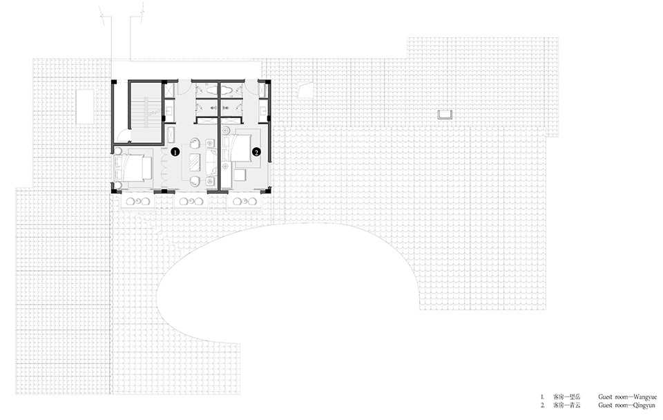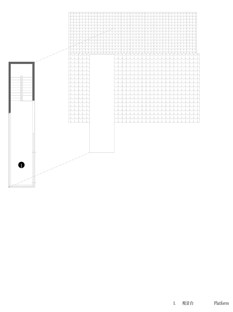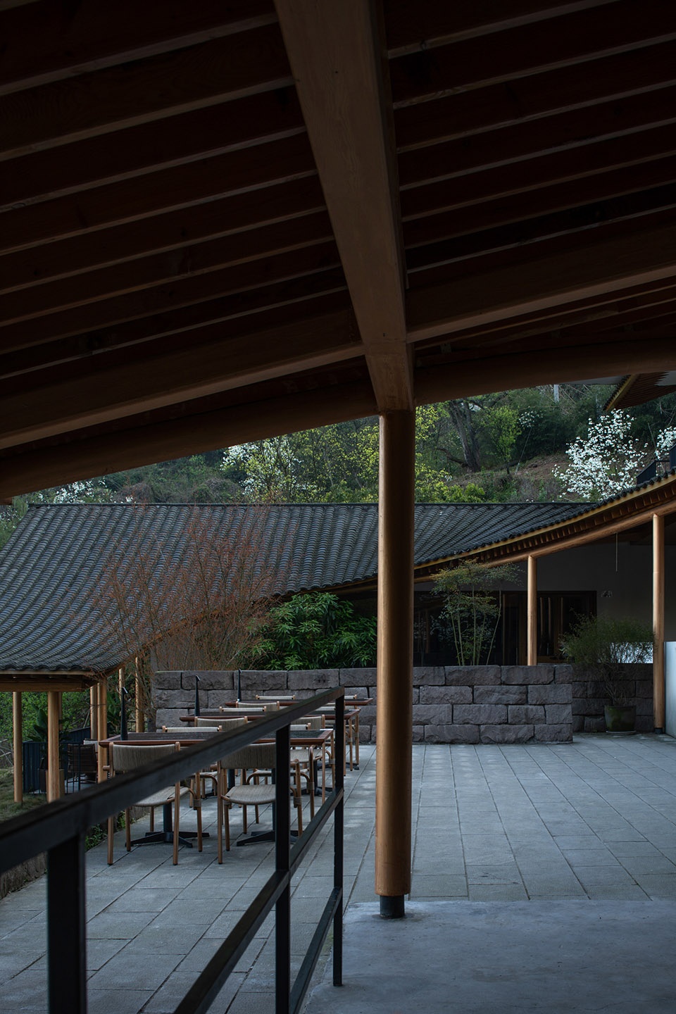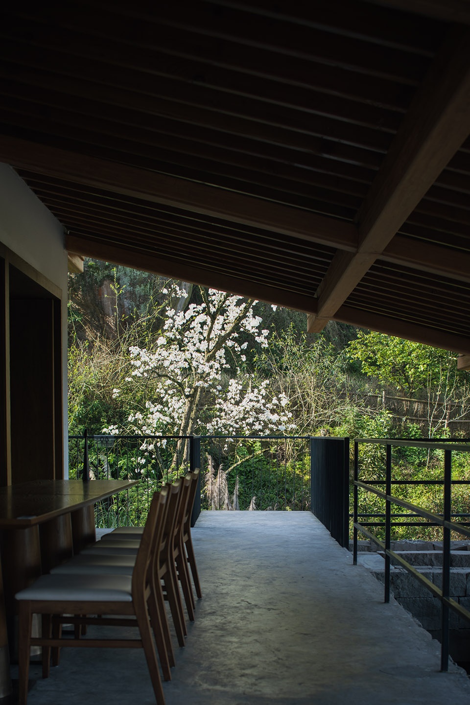 整个建筑基本保留原有民房的空间格局,宽阔巨大的瓦屋面将一层间断的建筑串联成一个整体,梨花瓣叩开一个类椭圆的异形庭院,相较于传统的方形院子更显灵动、柔美,屋檐下的天空形随人动,变化万千,为人们带来更加生动有趣的山野生活体验。二楼屋顶的彩钢棚也改成了瓦屋面,让整个建筑更加和谐统一。屋顶的观景台,犹如乌黑的梨树枝上一颗含苞待放的白色花苞,轻悠的悬在空中,赋予了不在山林独特的形象识别性。同时也为客人提供了一处俯瞰梨园幽谷和观看山林日落的绝佳场所。