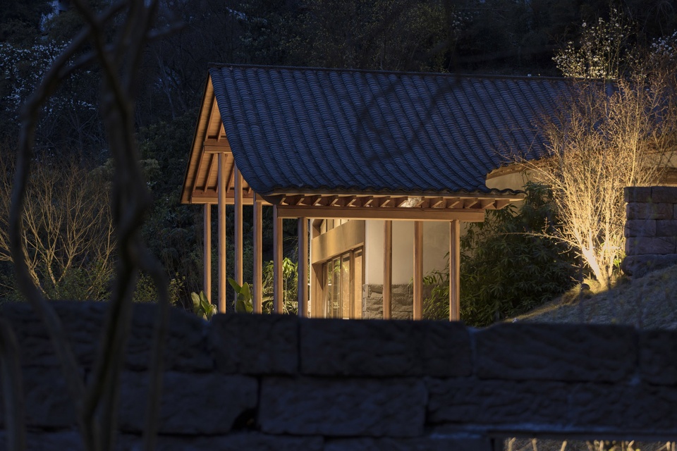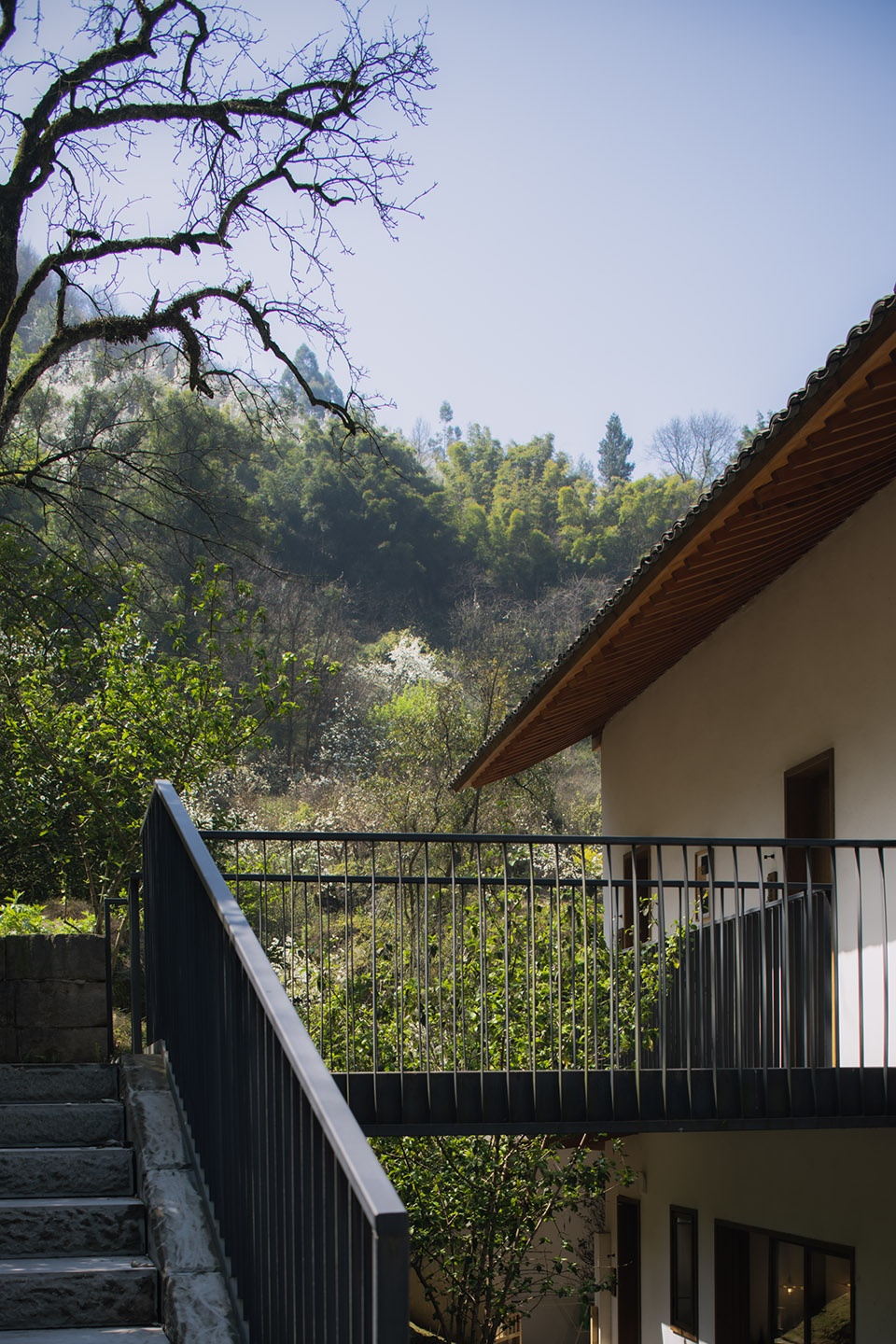 停车信步,迎着巨石的指引拾阶而上,隔着敦实的毛石院墙,便窥见不在山林的侧脸。踏过石板桥,攀上狭窄的石巷楼梯,迎头撞见空中白色的观景台挂在幽远苍翠的幕布之前。步入灵动闲适的小院,青石板铺设的院子,原石砌筑的院墙,暖白色的稻草漆外墙,木结构的屋架,秩序俨然的小青瓦屋面,将传统川南建筑松弛的神韵勾勒出来。顺着院子开口的方向望去,开阔的山谷尽收眼底。扑面而来的巨幅画卷和隐蔽的入口形成了强烈的反差,这种曲径通幽处的豁然开朗让人心旷神怡。