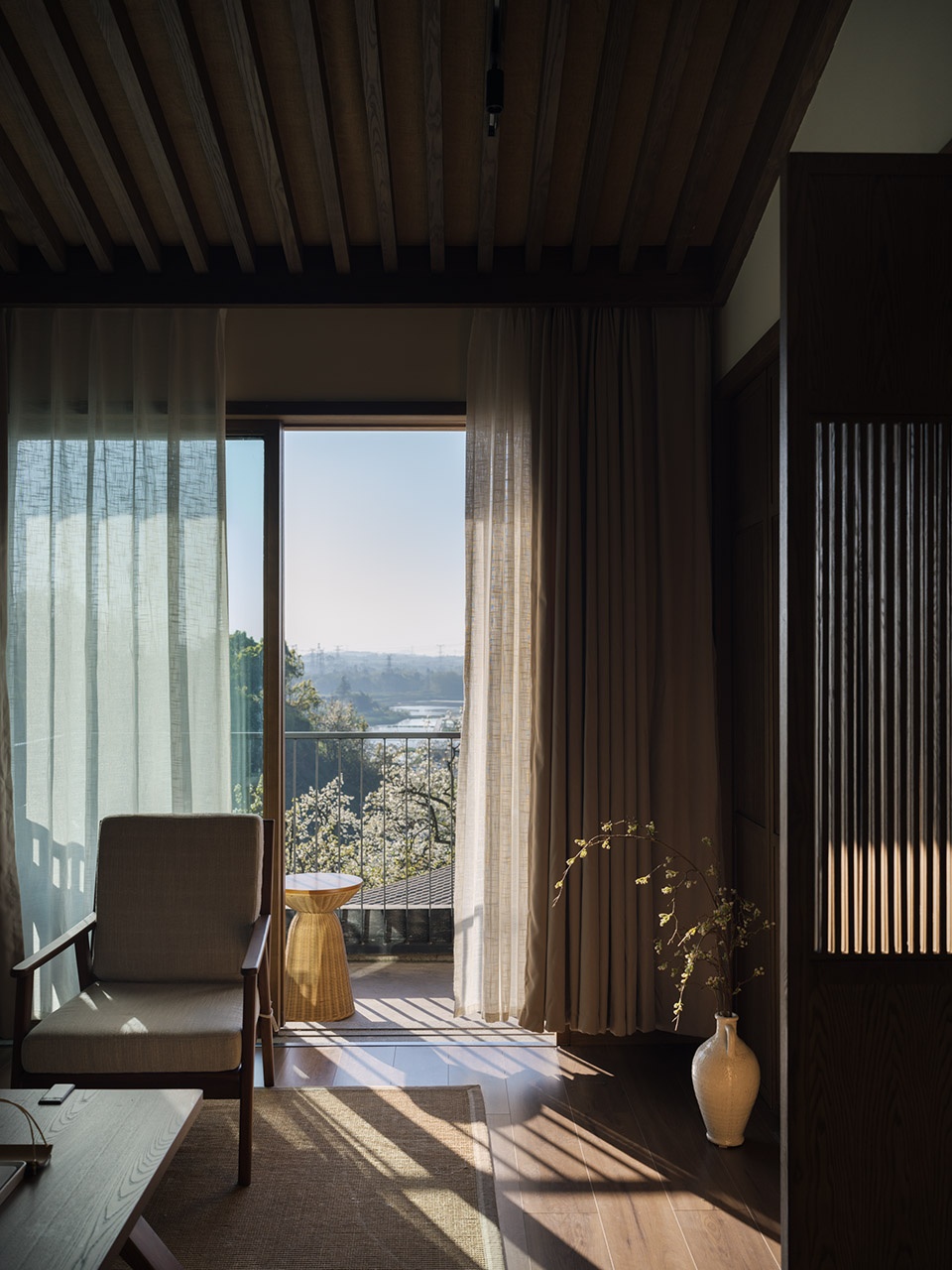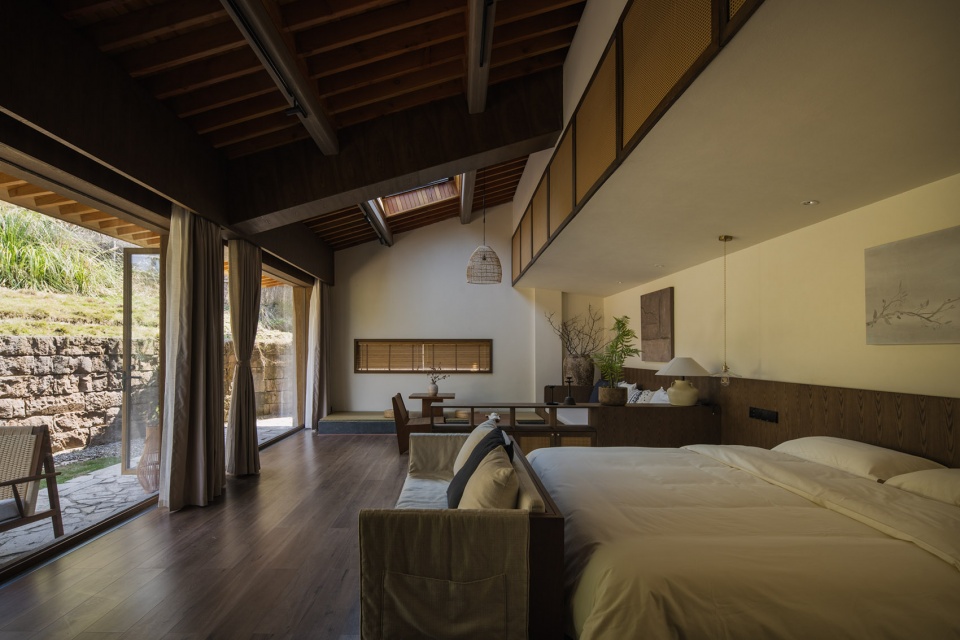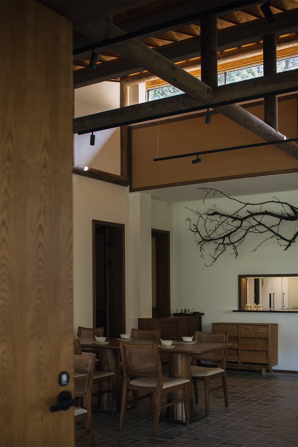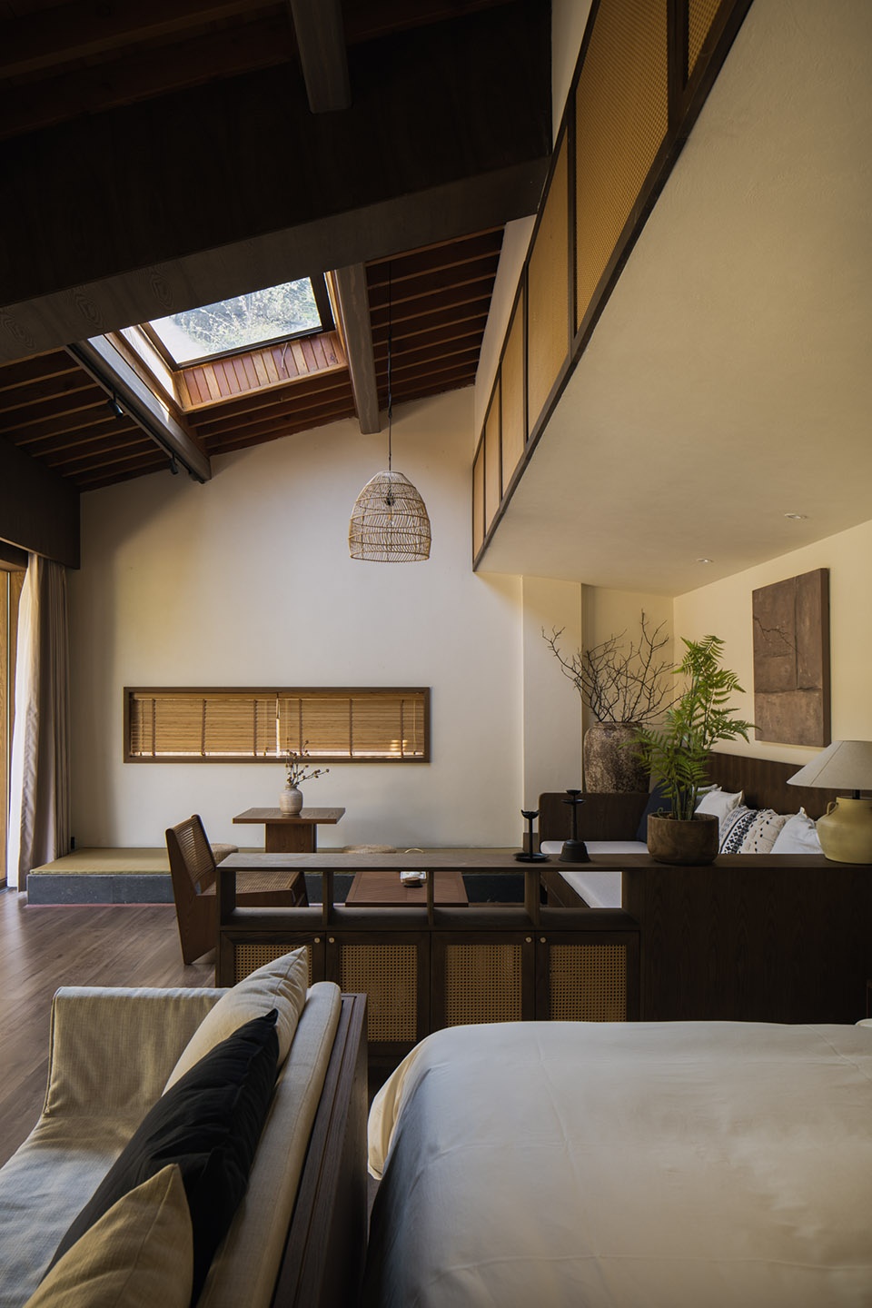 「不在山林」仅打造4间客房,每间客房各具特色。一楼带小院的亲子房,天窗的光倾泻而下,如月光柔和的洒满房间,谓之明月。二楼的套房出阳台便可俯瞰整个院子和山谷,屋内恰好看到青瓦分水的屋脊如山峦伸向远方,谓之望岳。精致素雅的餐厅,老屋留下的木梁把远去的岁月又拉回了现实;阶梯式的多功能茶室,粗犷原生的小酒吧,惬意野趣的户外汤池,满足不同客群的出行需求。室内整个空间延续了阴翳淡然的气质,淡雅柔和的色调与温润的木材结合,将度假感和自然感巧妙融合在了一起。通透的落地门窗将室外自然引入室内,每一个角落都散发出不动声色的拙雅之美。一件家具、一扇窗、一束花、一缕光..……没有繁复的装修,却处处尽显东方美学。
