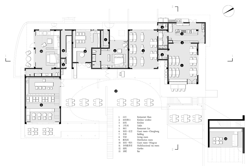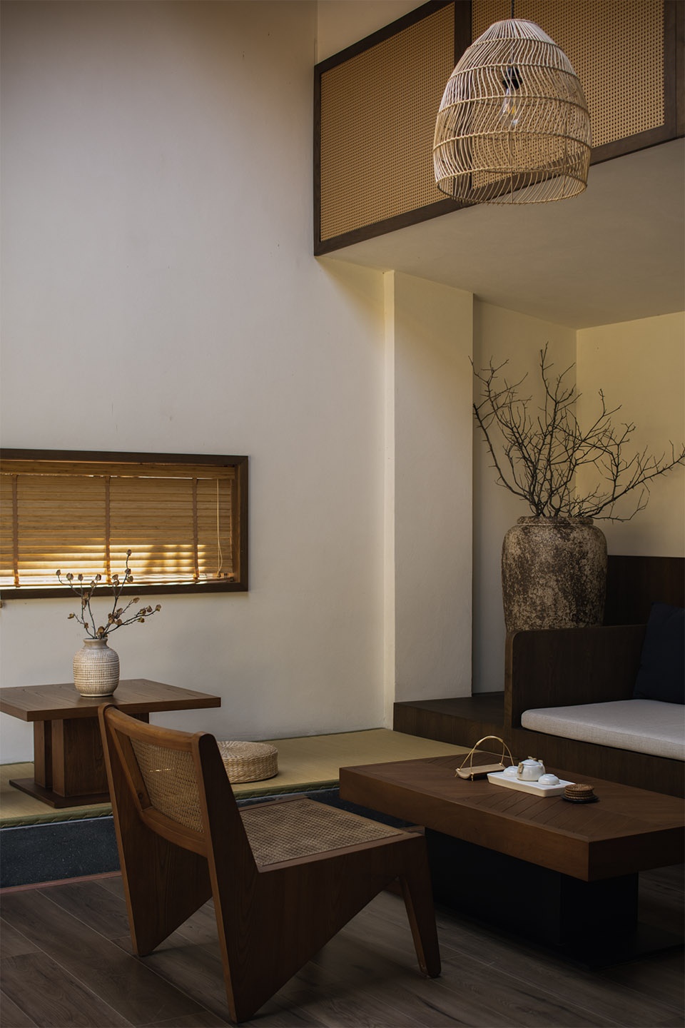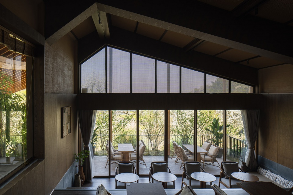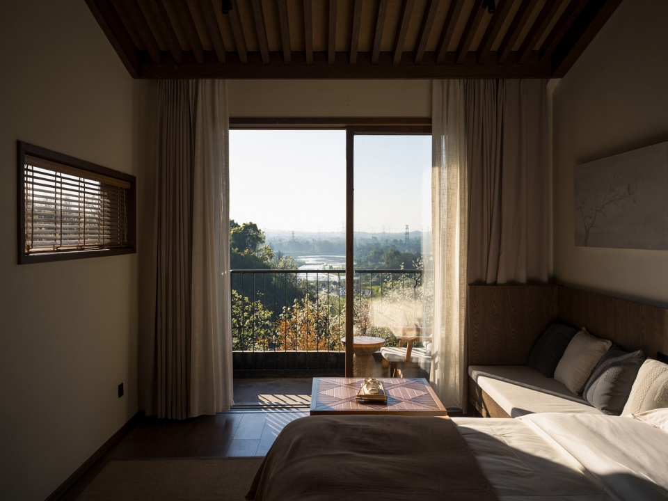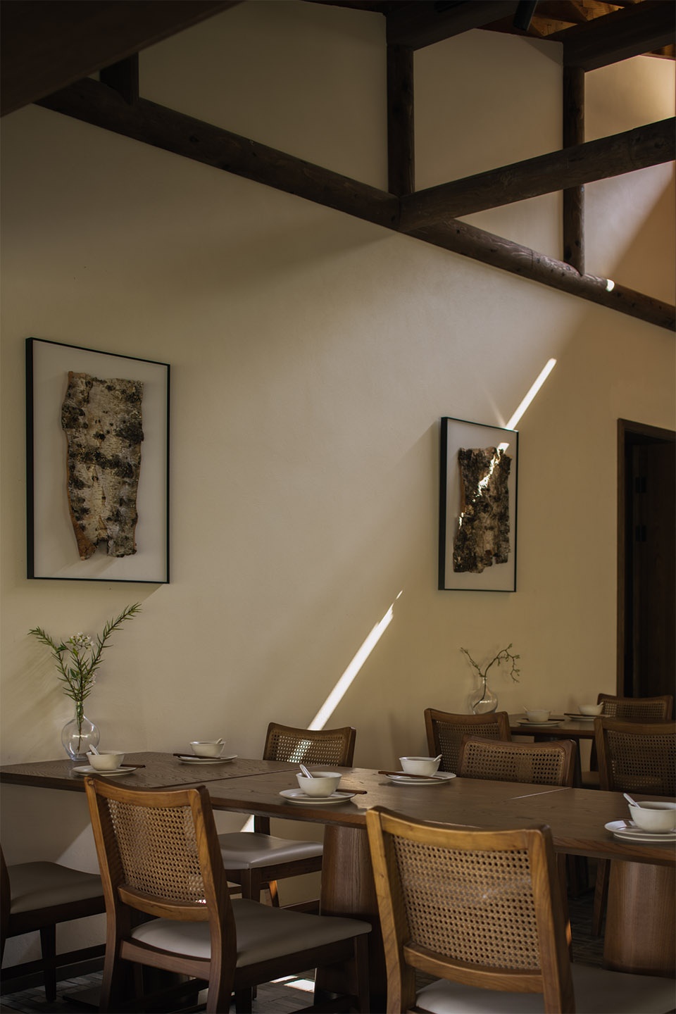 「不在山林」仅打造4间客房,每间客房各具特色。一楼带小院的亲子房,天窗的光倾泻而下,如月光柔和的洒满房间,谓之明月。二楼的套房出阳台便可俯瞰整个院子和山谷,屋内恰好看到青瓦分水的屋脊如山峦伸向远方,谓之望岳。精致素雅的餐厅,老屋留下的木梁把远去的岁月又拉回了现实;阶梯式的多功能茶室,粗犷原生的小酒吧,惬意野趣的户外汤池,满足不同客群的出行需求。室内整个空间延续了阴翳淡然的气质,淡雅柔和的色调与温润的木材结合,将度假感和自然感巧妙融合在了一起。通透的落地门窗将室外自然引入室内,每一个角落都散发出不动声色的拙雅之美。一件家具、一扇窗、一束花、一缕光..……没有繁复的装修,却处处尽显东方美学。