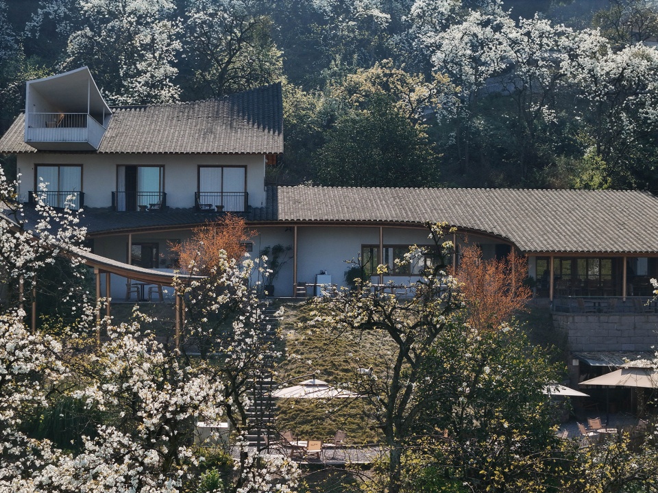 从泸州市区驱车二十分钟,喧嚣悄然退去,逐渐遁入一处山林幽谷。在蜀中名山方山的怀抱中,面对一片幽深的山谷梨园,「不在山林」悠然而居。这里是泸州江阳区丹林镇的梨花村,村内植有梨树四万余株,其中百年古树逾千,春日梨花如雪,故而得名“梨花村”。村子背靠的方山,是蜀东南佛教发祥地,山巅始建于唐的云峰寺中,供奉着全国唯一一尊“黑脸观音”,为这片山野更添一分禅意与神秘。