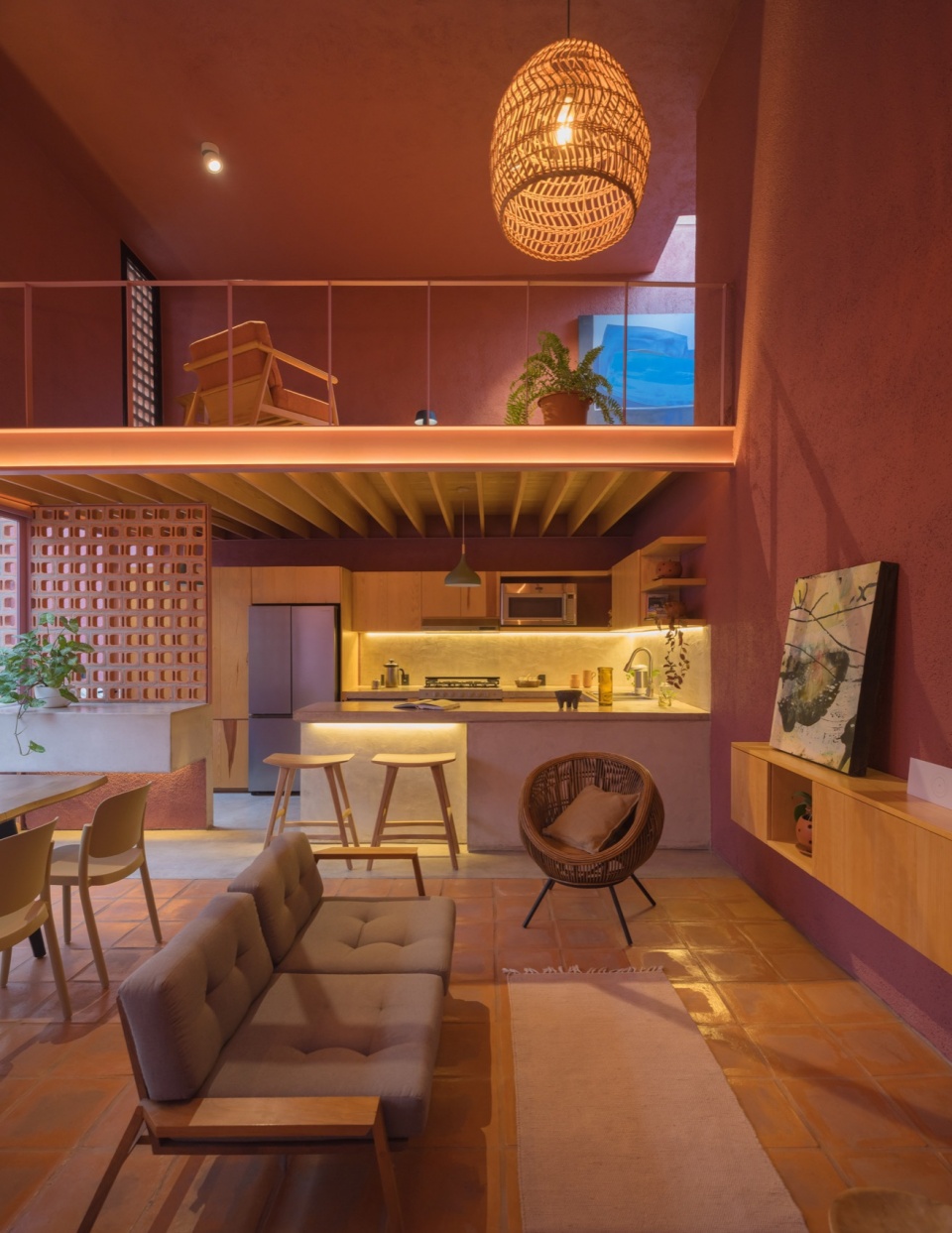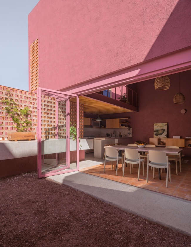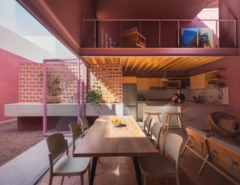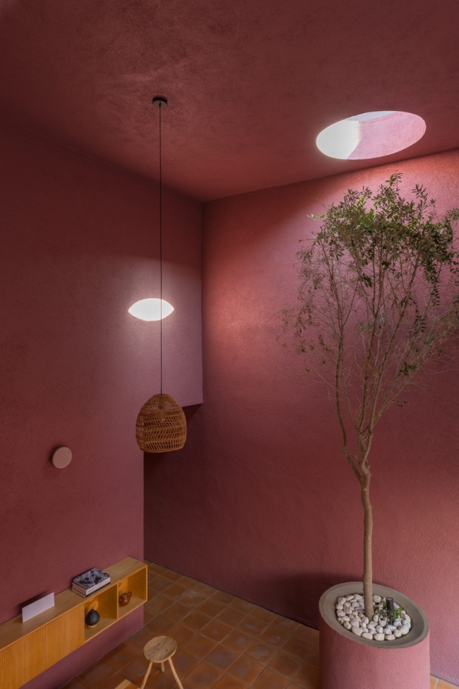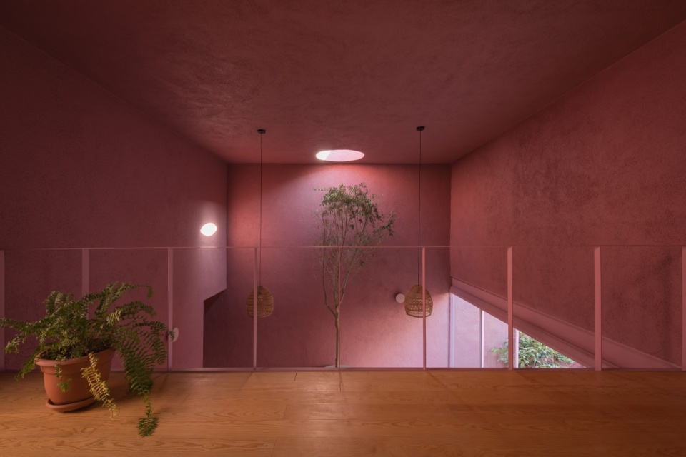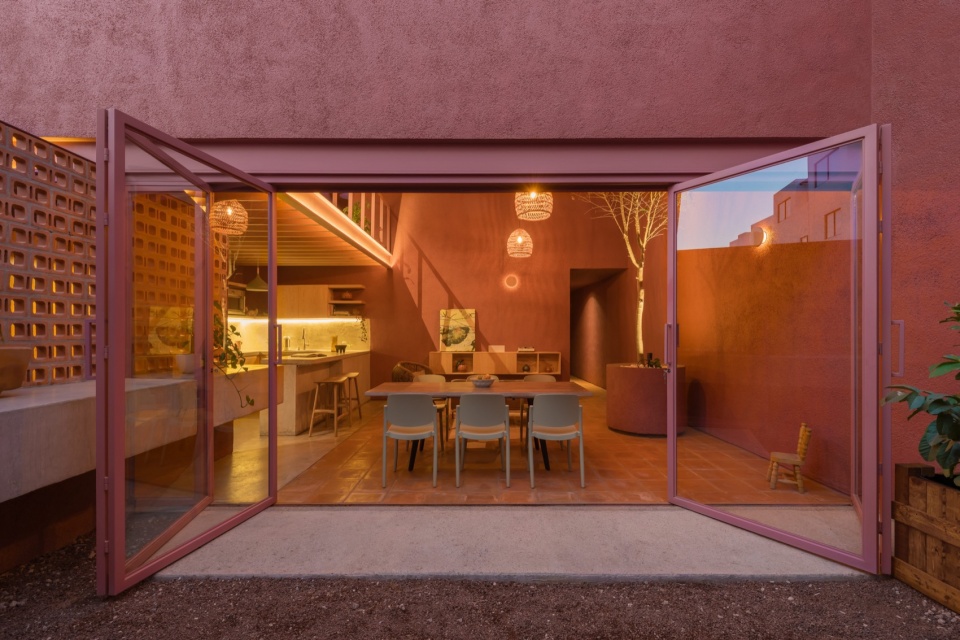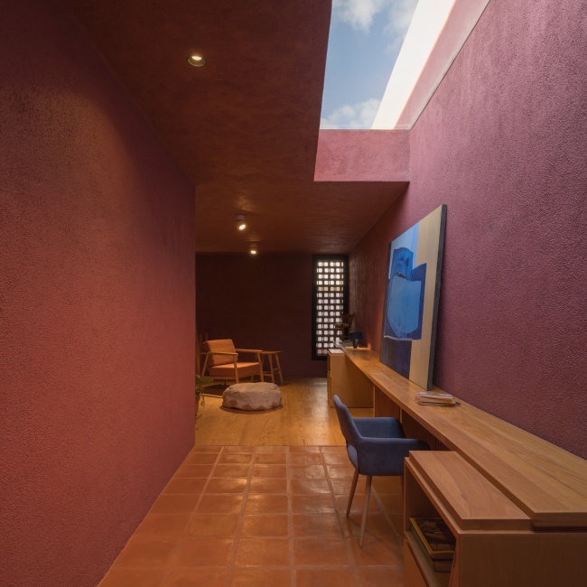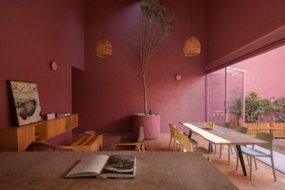 自构思之初,项目便将自然要素——光、色彩、风、阴影与植被——作为塑造空间氛围的基本工具,并使其随时间推移不断变化。经过策略性朝向设计的开口,使阳光得以被控制性地引入室内,形成回应昼夜更替与四季变化的色彩层次。一棵被精心纳入起居空间的树木,通过枝叶的变化、气味以及其鲜活的存在,标记着时间的流逝。甚至墙体的色彩——取自金枪鱼卡多纳仙人掌——也会随着太阳运行轨迹的变化而发生转变,使住宅的视觉身份与其所处环境形成亲密而直接的联系。