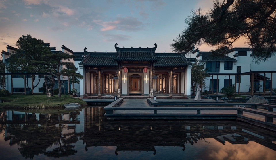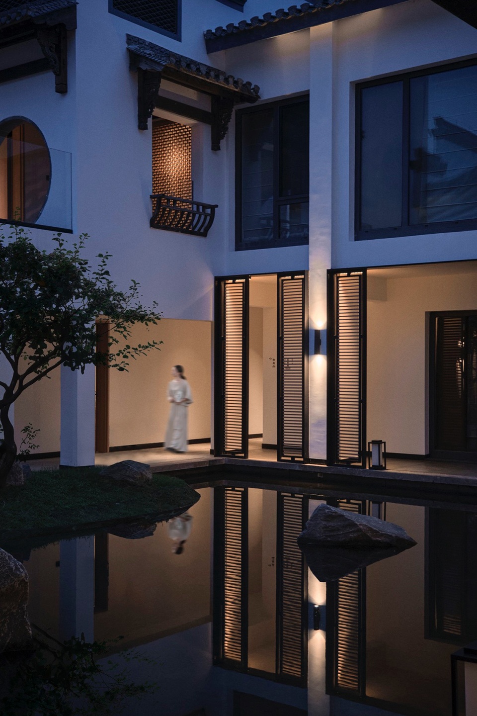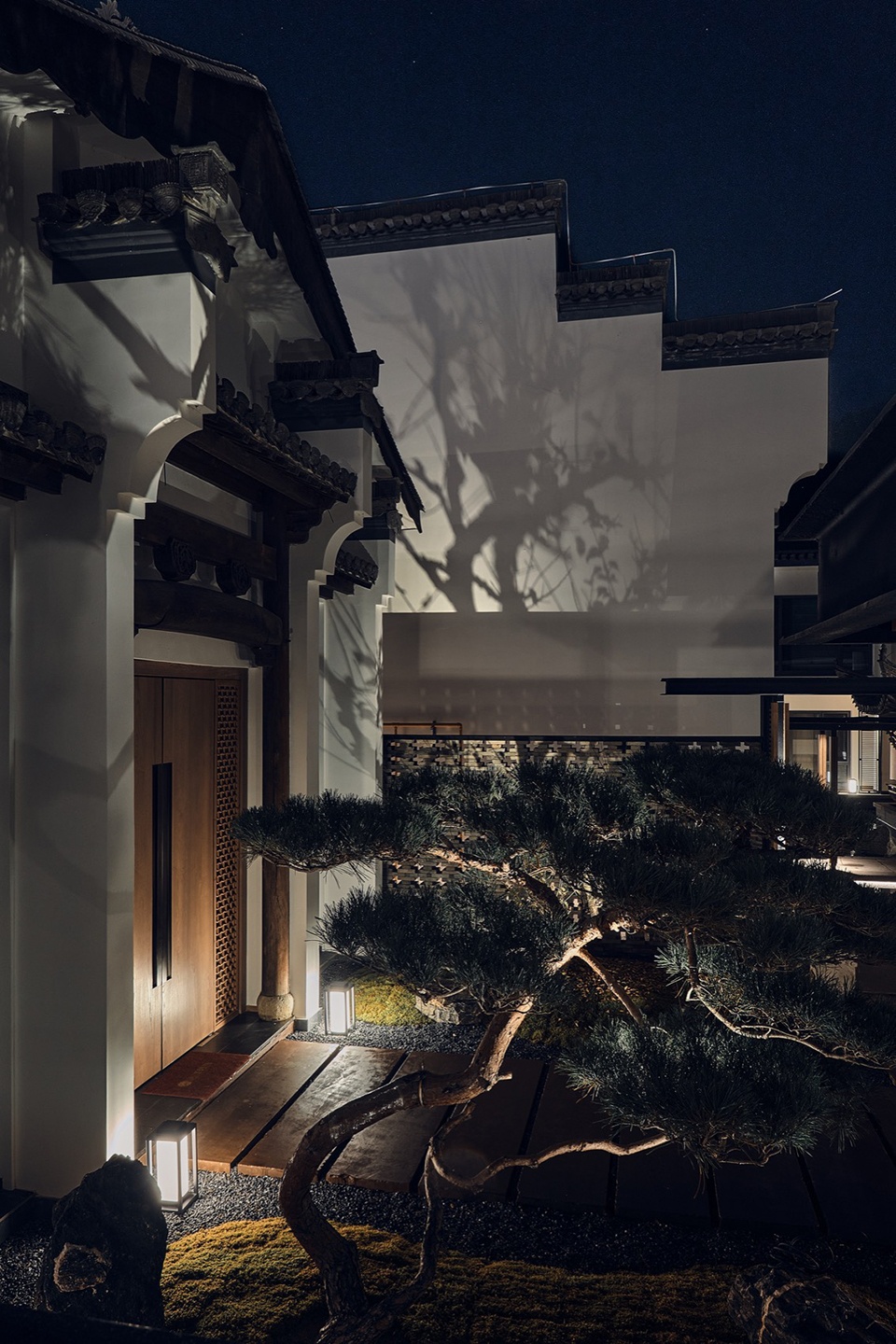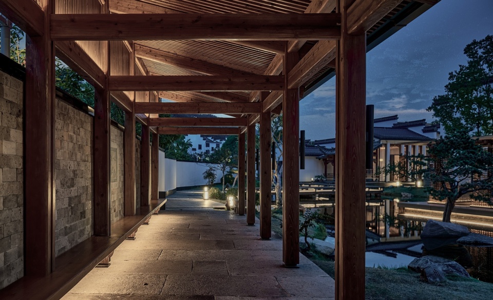 “外简内秀,院落叠进,枕水而栖”是项目的整体定位。高大的马头墙勾勒出起伏的天际线,立面则以纯粹的墙面“留白”,创造出一种“精神归隐”的氛围,让游者在抵达的第一时间,便能从心理上卸下疲惫,安享这一方静谧的景致。