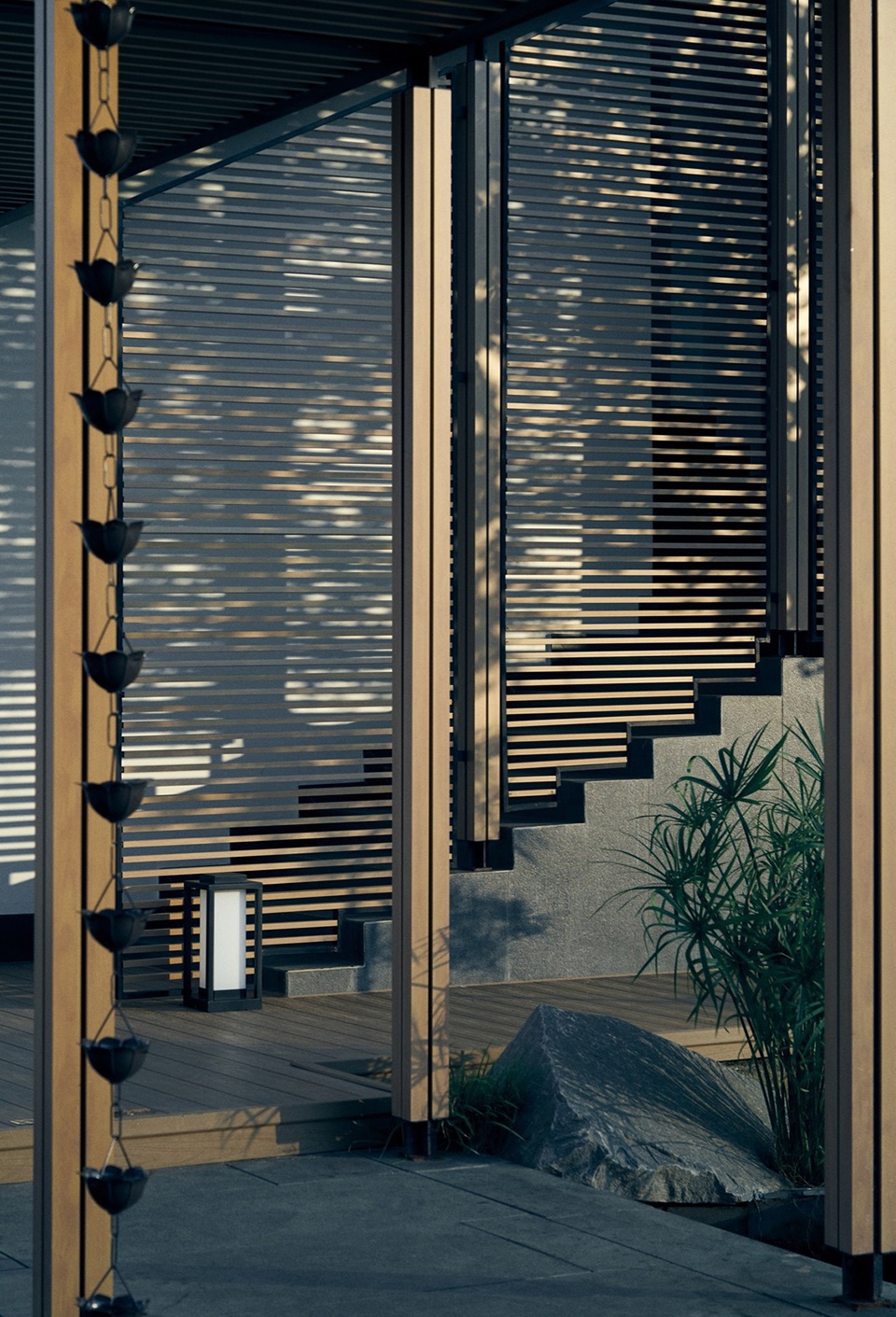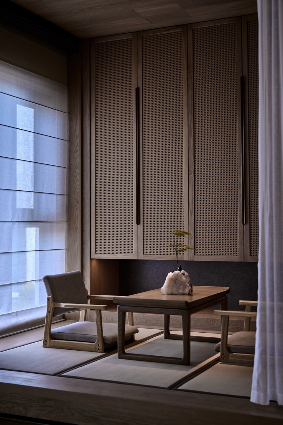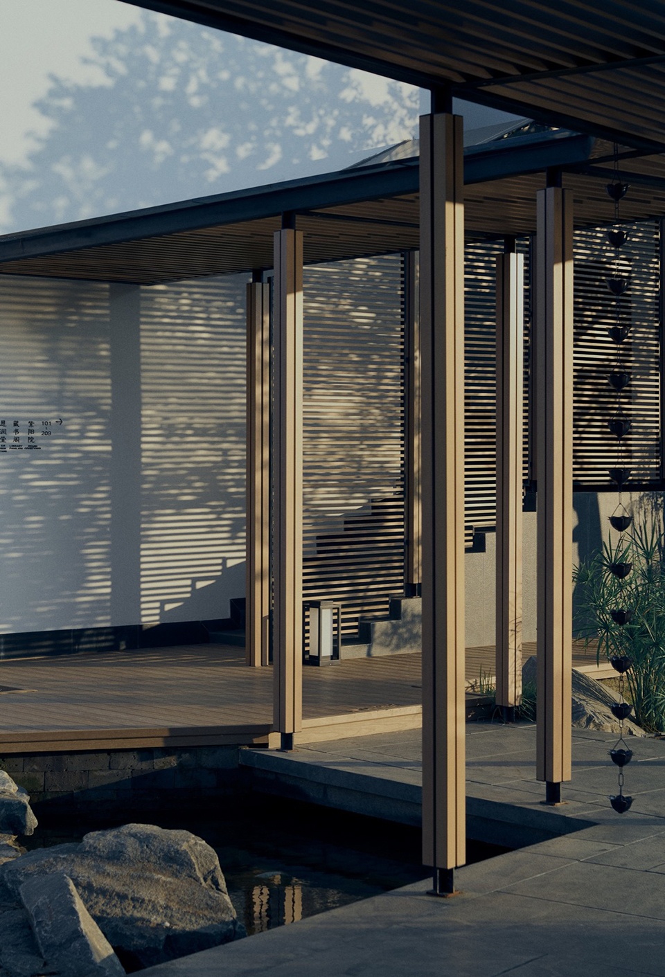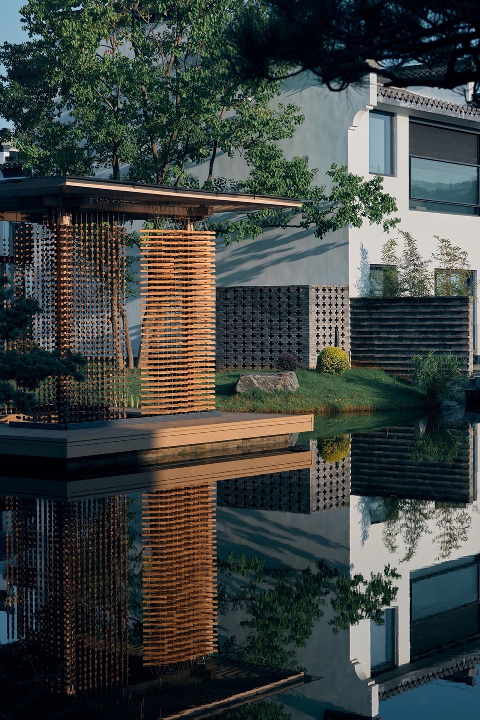 水系流转的中心,一座四面通透的水中茶亭轻盈地浮于水面,成为整个庭院的视觉与精神核心。它是一个邀请风、光与视线自由穿行的“空”的容器,一处可供人暂停下来,与自我、与自然真正对话的场域。
