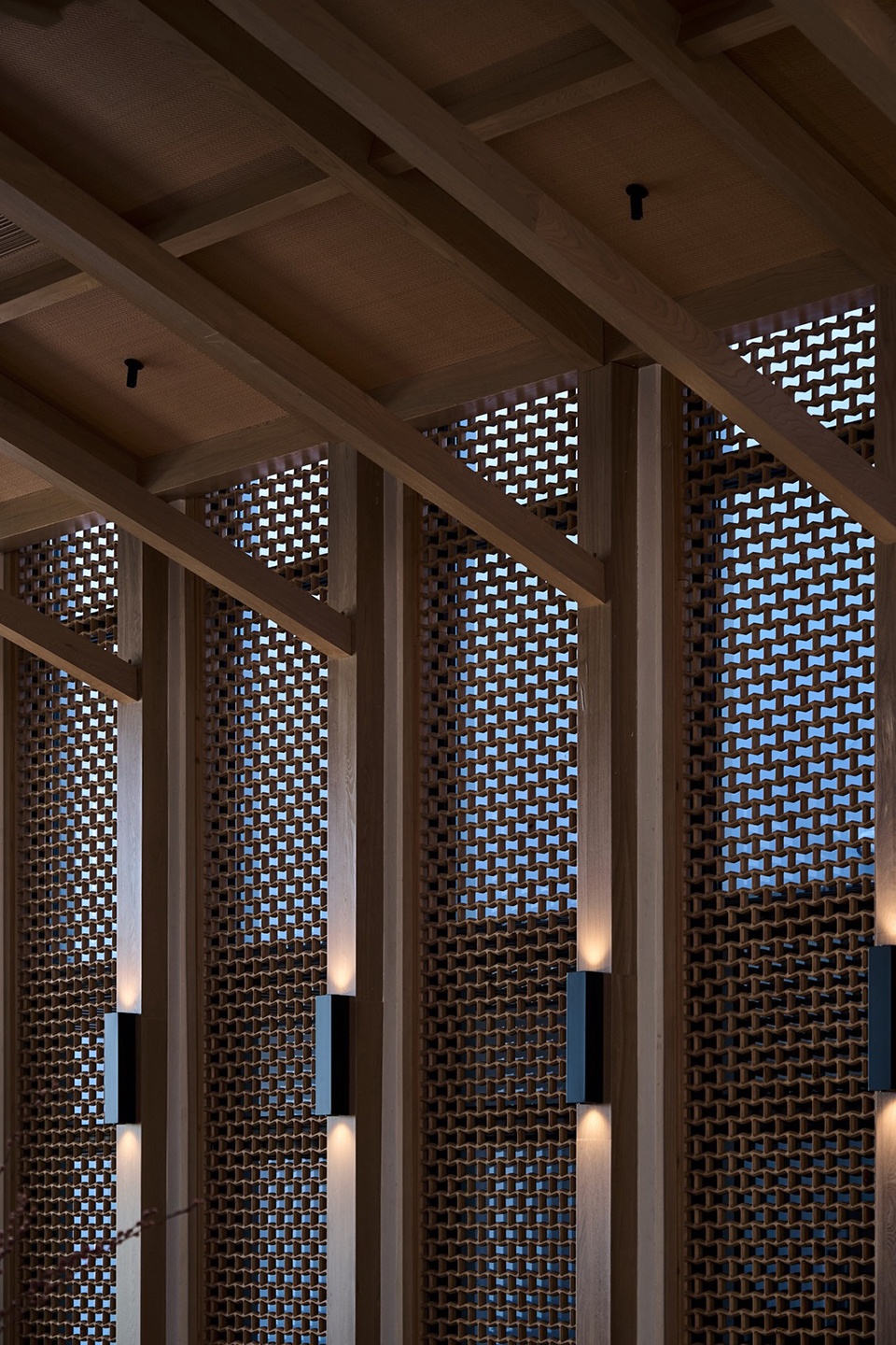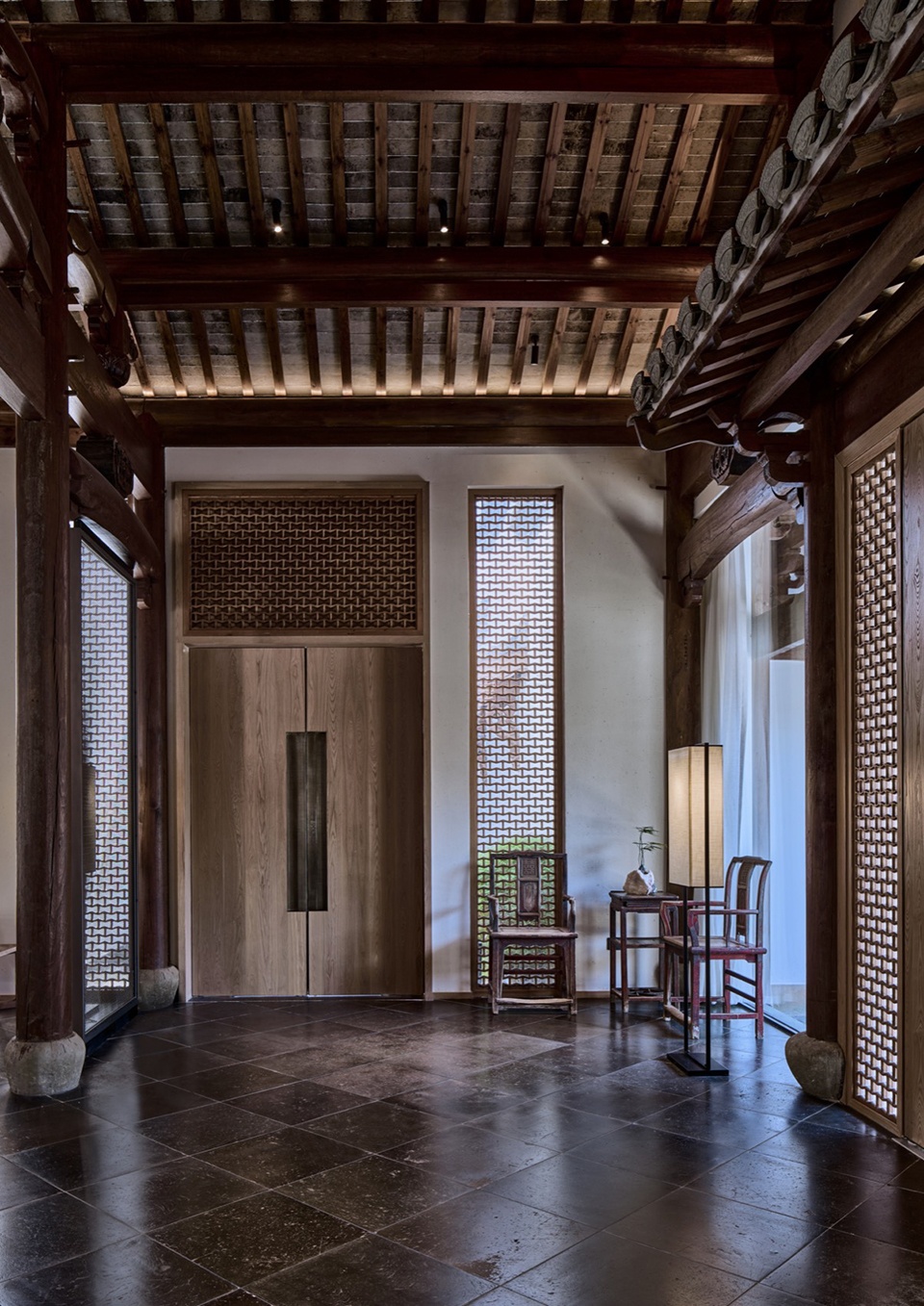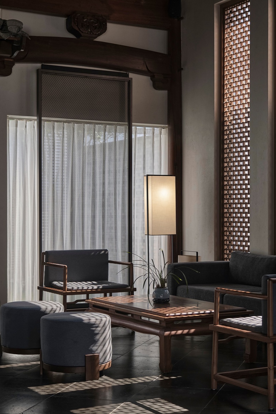 接待厅的设计,始于对古建筑风骨的尊重。裸露的抬梁式木构架成为最强有力的语言,构建出殿堂气韵。两侧花格屏风将光线转换为虚实的晕染,营造出层层递进的深邃感。空间器物亦是对自然质感的礼赞,没有浮华雕琢,唯有被时间打磨的朴素之美。