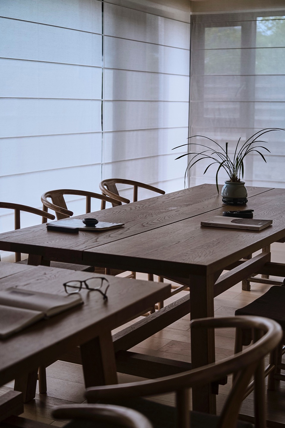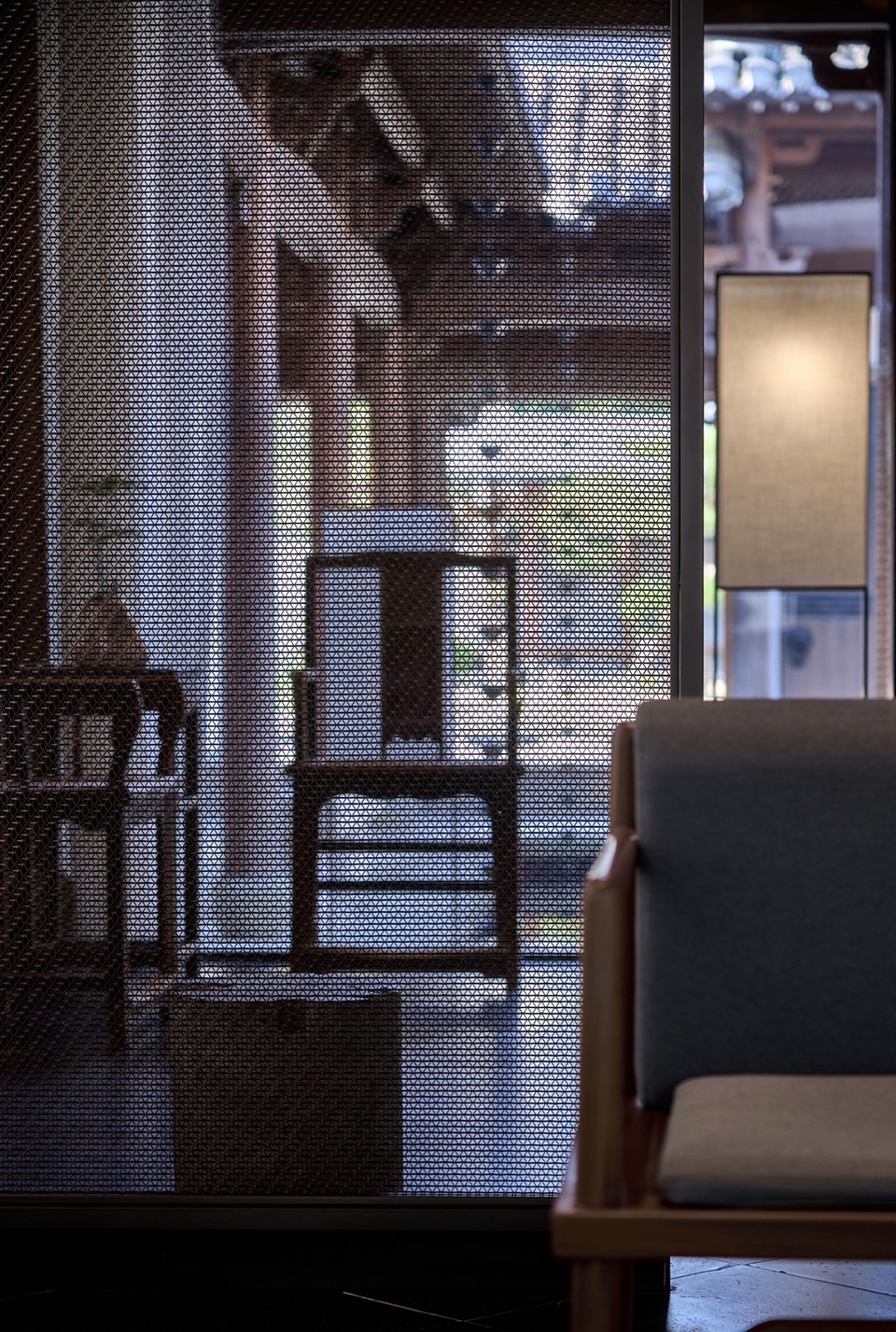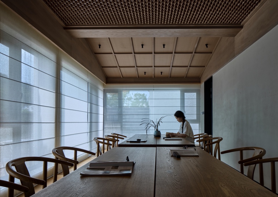 接待厅的设计,始于对古建筑风骨的尊重。裸露的抬梁式木构架成为最强有力的语言,构建出殿堂气韵。两侧花格屏风将光线转换为虚实的晕染,营造出层层递进的深邃感。空间器物亦是对自然质感的礼赞,没有浮华雕琢,唯有被时间打磨的朴素之美。