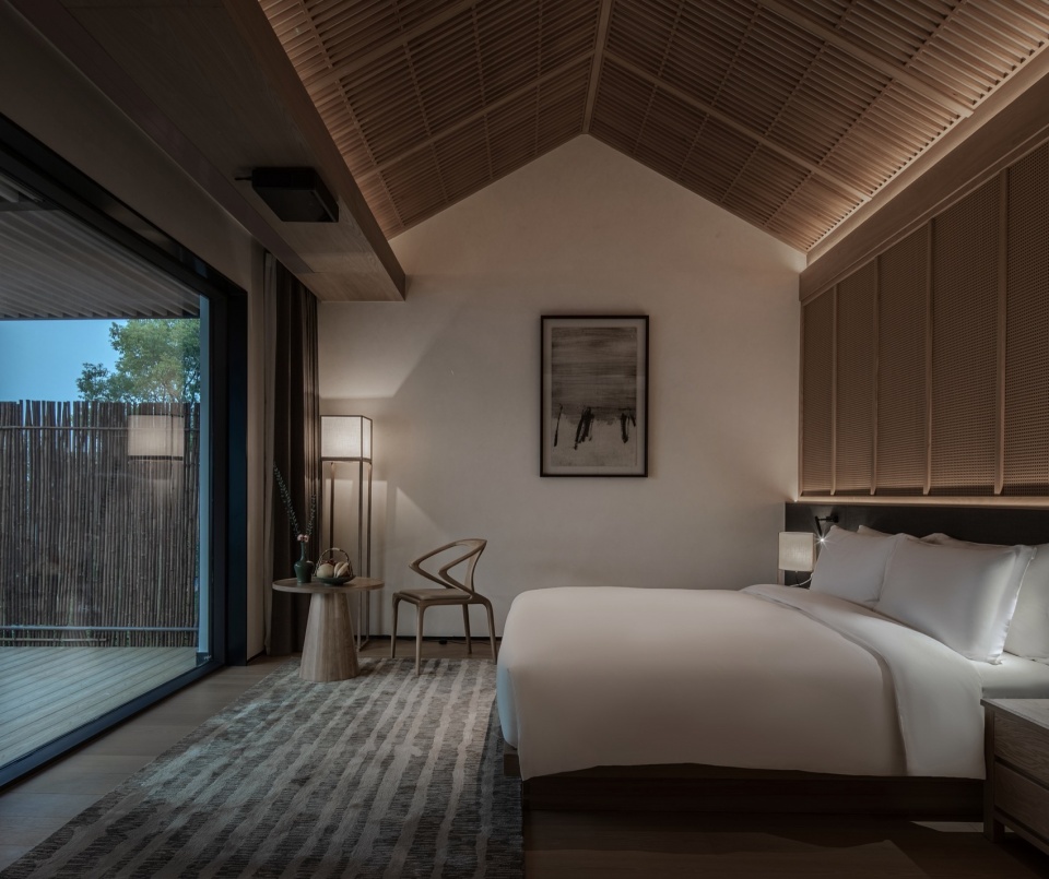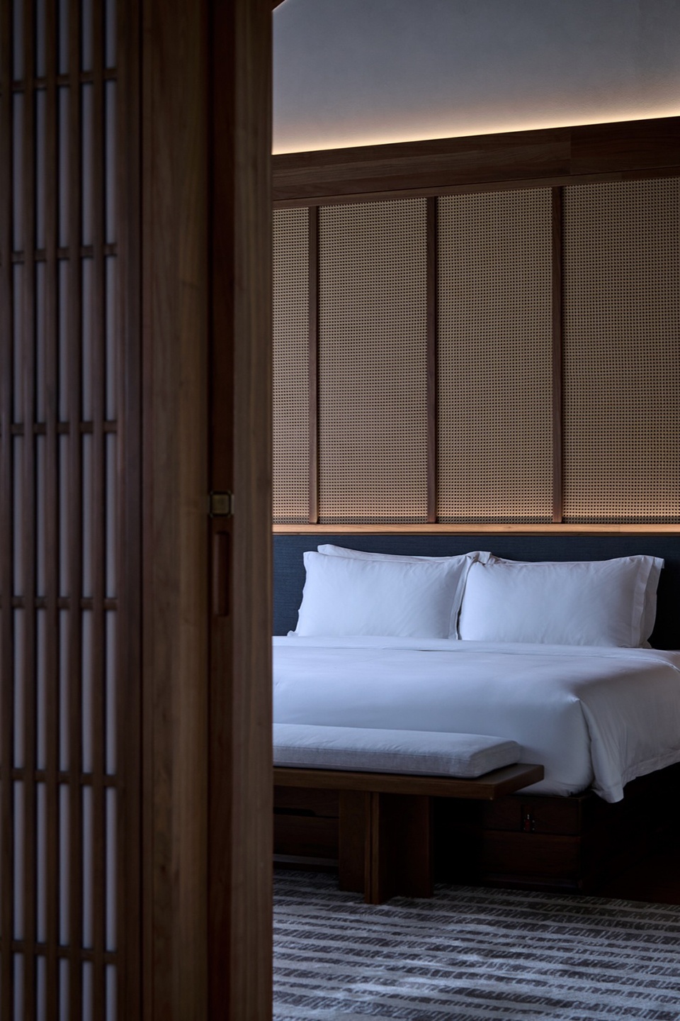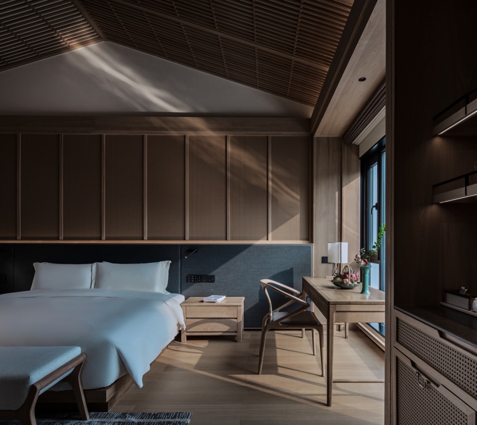 客房,是对“枕水而居”这一东方栖居理想的当代诠释。空间最大限度地退让于风景,让卧榻与江水仅一步之遥,使对岸的古城风貌成为一幅触手可及的床头画卷。室内则以温润原木与质朴竹编构建起安然居所,将感官焦点让位给窗外。最终,栖居于此,不再是单纯的休憩,而是成为一次身心沉浸于山水之间的深度疗愈。