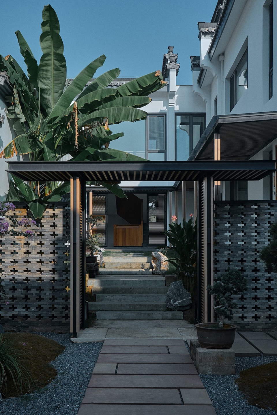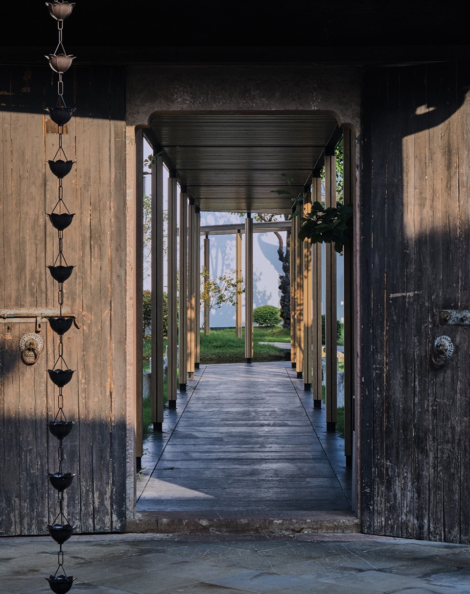 迴廊蜿蜒水庭之上,串联起四组院落,它不仅是连接动线的通道,其本身就是一条流动的风景线。行走其上,步移景异,左手是庭院深深,右手是天光云影。