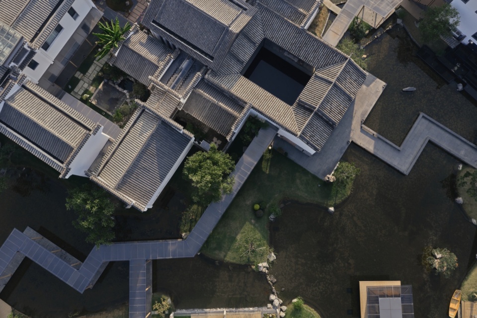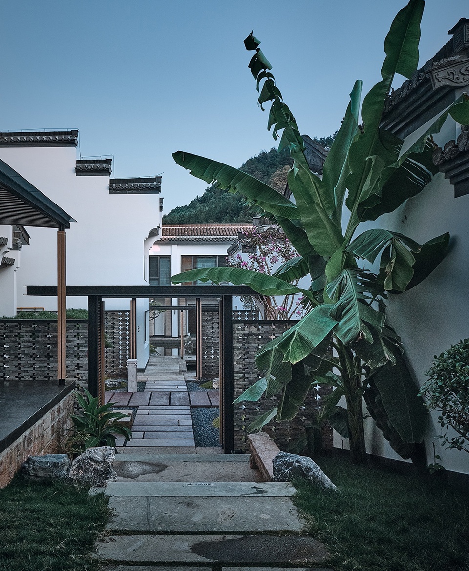 屋顶形制传承了徽派神韵——黛瓦铺陈,山墙起伏,转译着传统民居的风骨与神髓。色彩以水墨般的黑、白、灰奠定素淡悠远的基底,间或点缀木作与青翠,恰如泼墨山水画中那一抹赋予生机的温润点睛。
