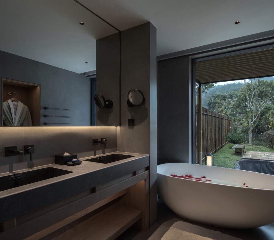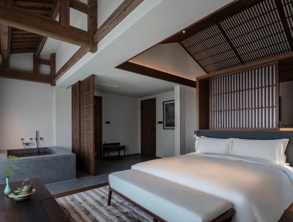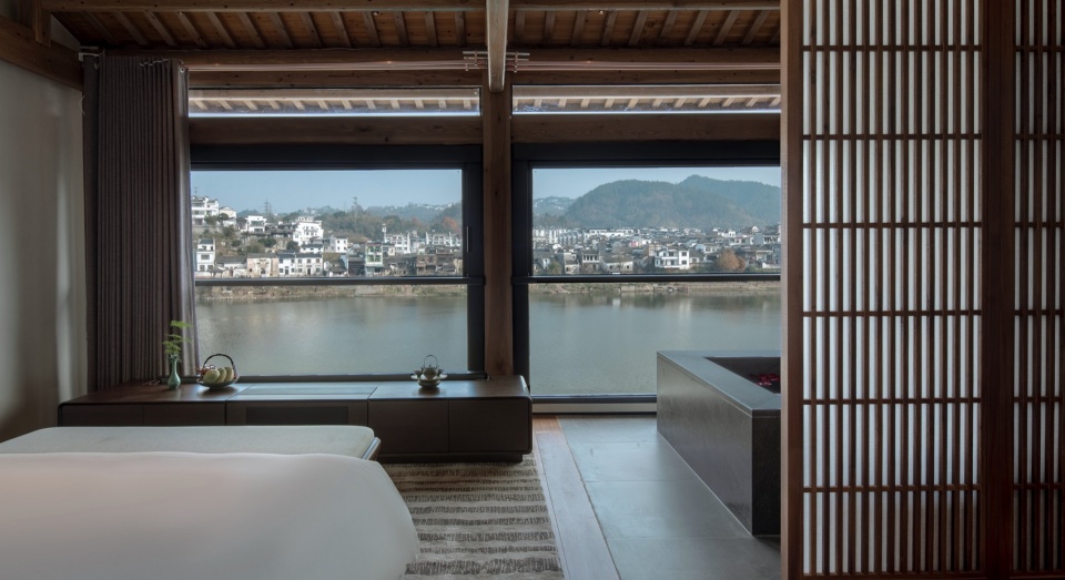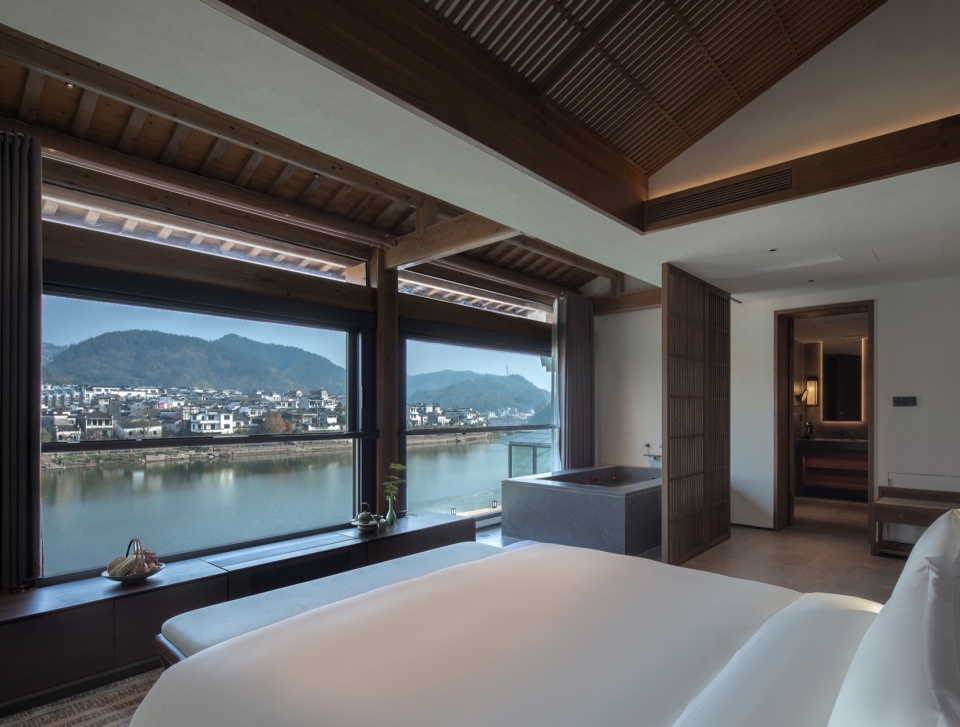 设计跳脱了对传统符号的表象摹写,更通过光影与材质的对话赋予其新生。大面积玻璃将江景无界地引入室内,与温润木作、质朴石材形成平衡。这不仅是框取风景,更是消弭人与自然的边界,让度假体验回归自然。设计既不突兀于山水,亦不盲从于复古,恰如一幅始于渔梁古坝、落笔于当代生活的山水长卷。