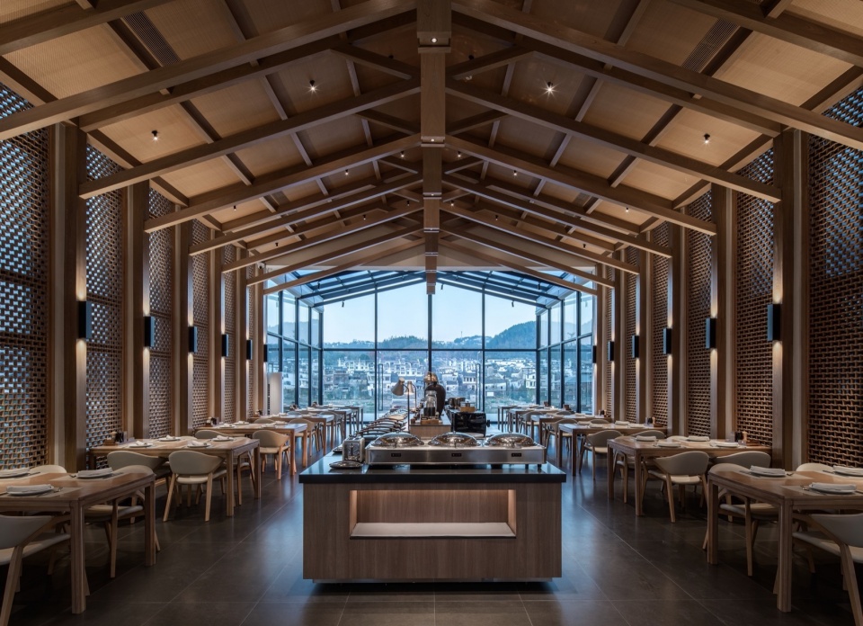 餐厅旨在构建一处“安坐于当下,与历史对望”的场域。极富仪式感的木构架笼罩空间,所有的内敛与秩序,都是为了端头那面通透玻璃幕墙的豁然开朗。安坐于此,新安江的波光与对岸的千年古城,化为一幅真实的古城长卷,让饮食升华为对在地风土与历史文脉的深度品尝。
