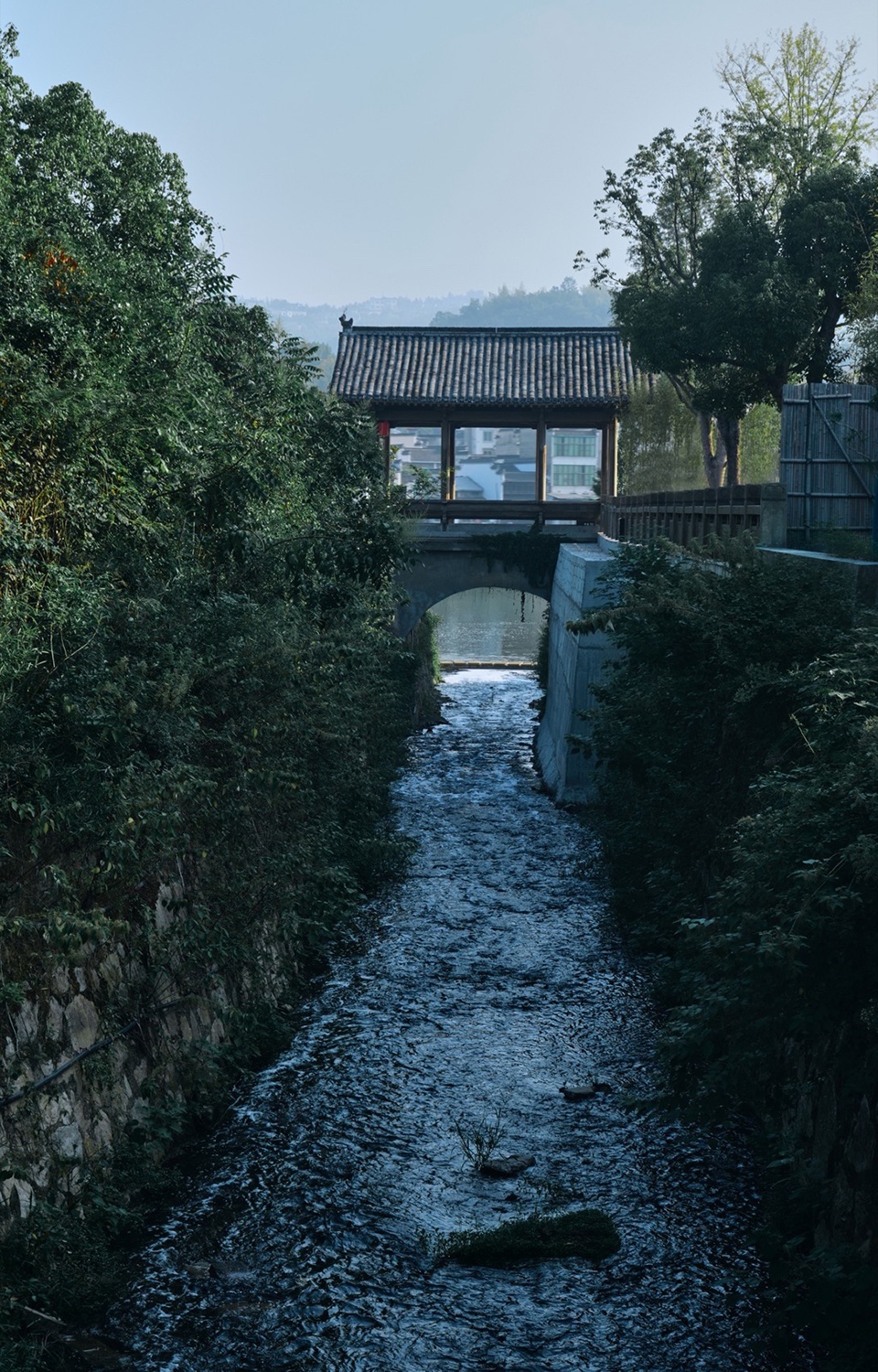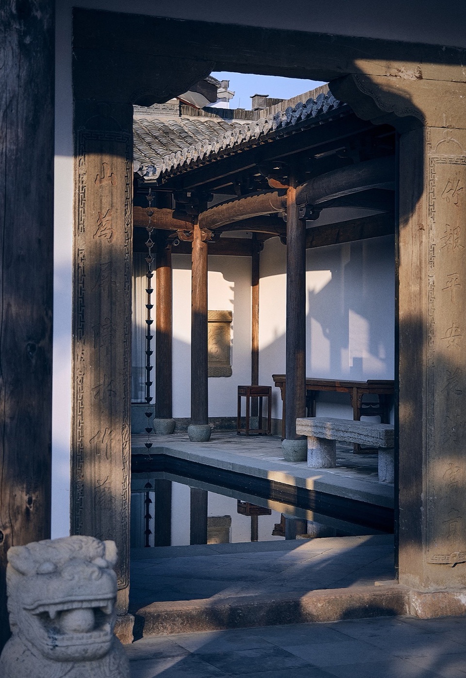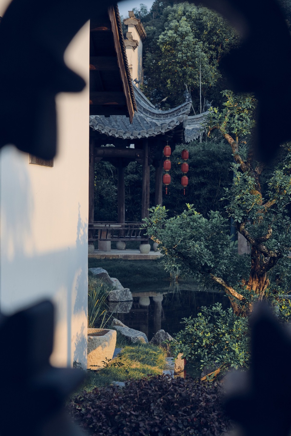 那里,千年古城的鳞次栉比与人间烟火,都化为这方水镜前最生动的背景,将当代生活方式与历史余韵无痕融合。园林之中,一座质朴的石桥是路径的转折,亦是心境的渡口。它引导着宾客跨越潺潺溪流,从一重景致渡向另一重。而桥的尽头,一座翼然的徽派门廊则静候于此,成为整个园林叙事中的“思绪锚点””,一个可供静侯观雨、让思绪全然放空的心灵归处。
