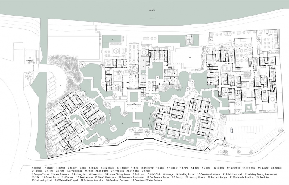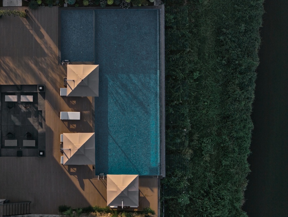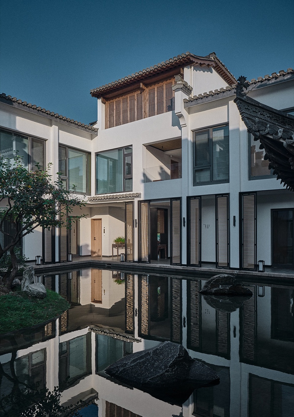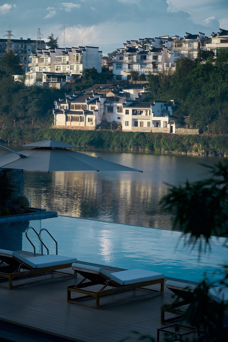 廊桥的存在,模糊了室内与室外的边界,巧妙地连接公共与私密、喧闹与宁静的过渡,让漫步于其上的人,也成为了这幅流动风景中最生动的一笔。旅程的深处,一方泳池如静谧水镜。它不仅向内倒映着马头墙与天空的轮廓,更将视线引向江的对岸。
