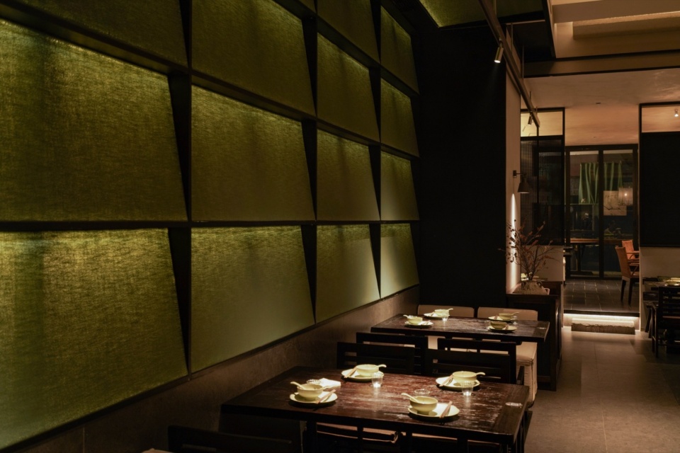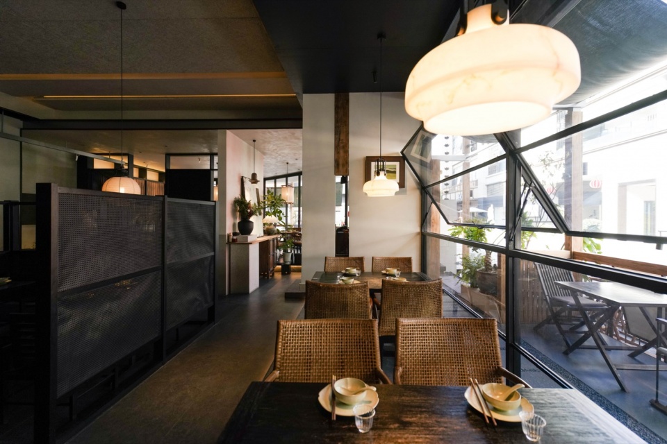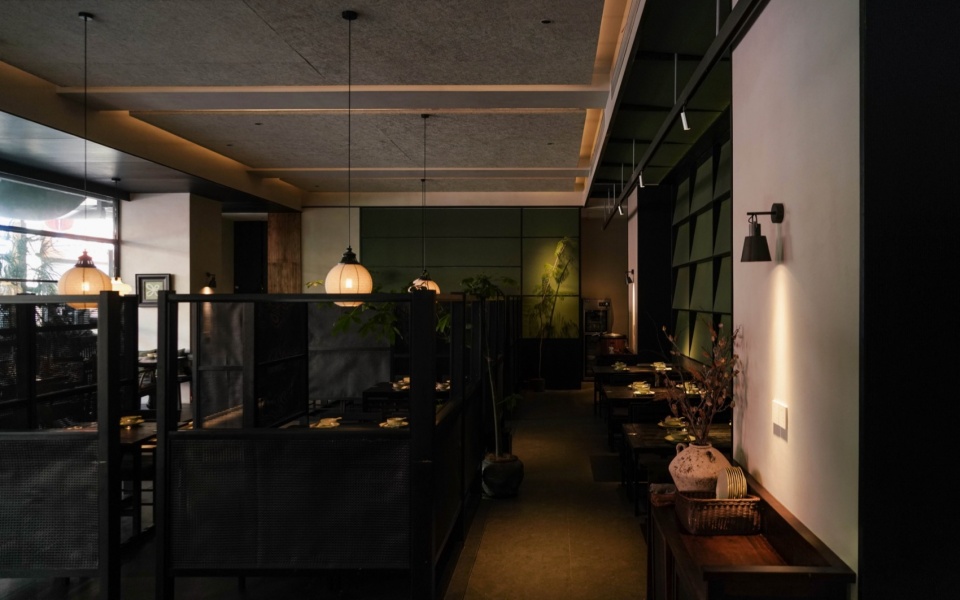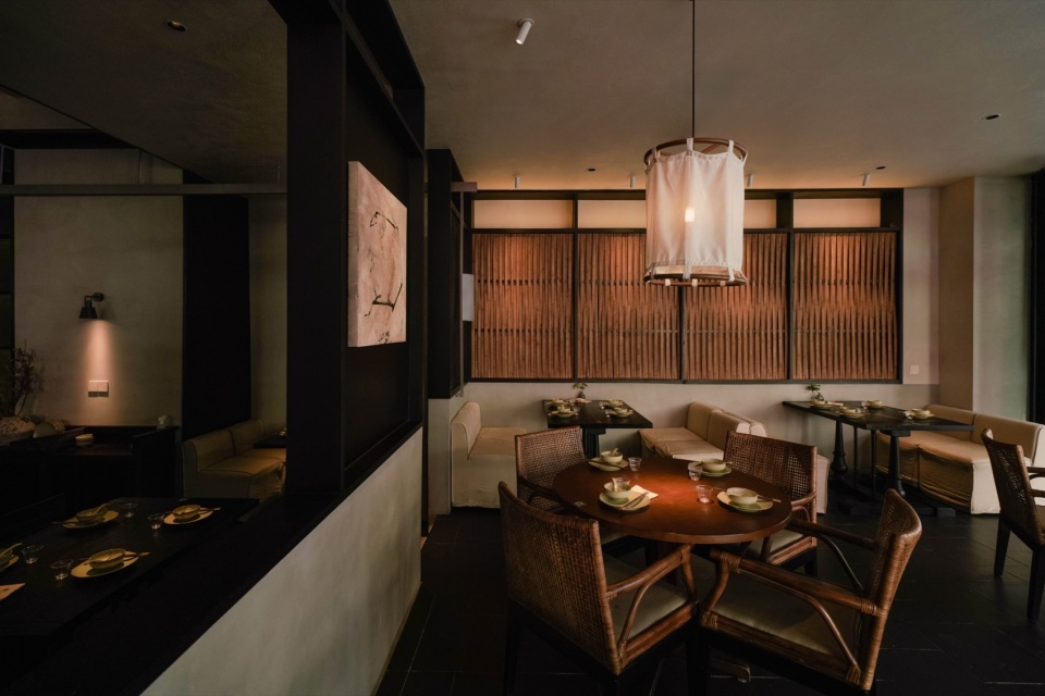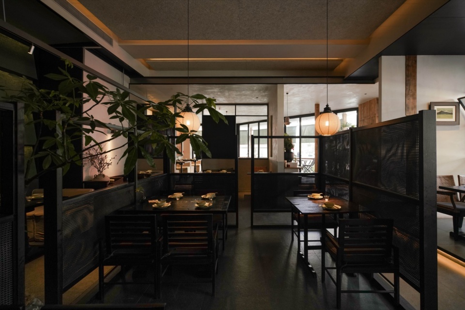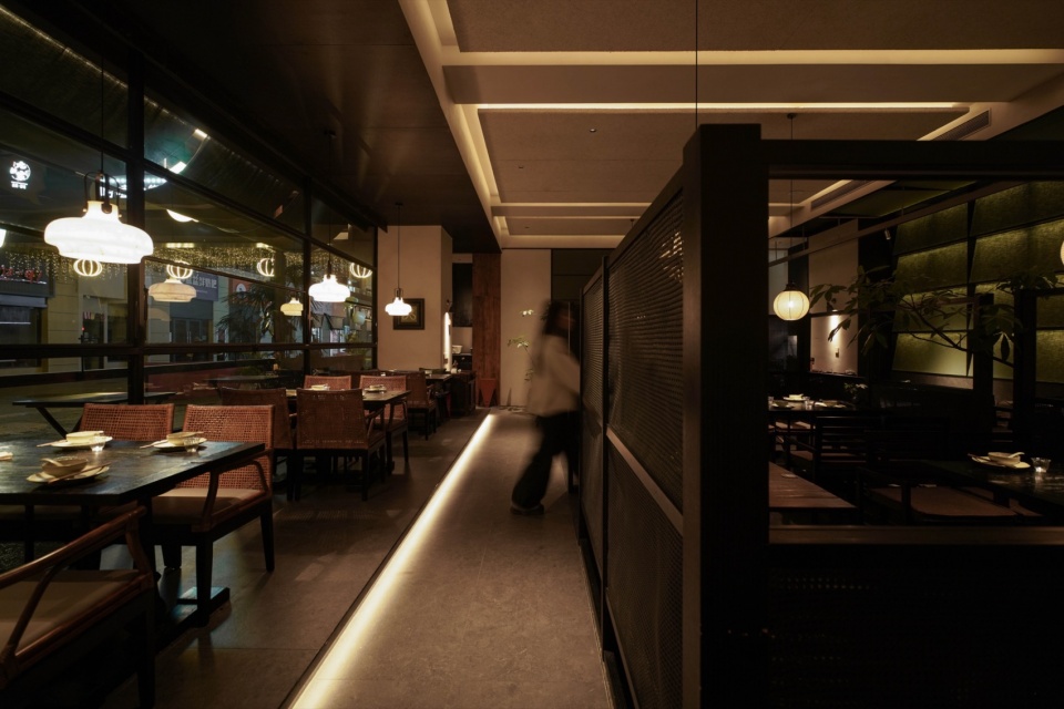 而靠内侧的半围合就餐区域,则更像是一处收纳情绪的角落。汀步、绿植、素墙、透帘、半高卡座,以天然材质为线索,铺展开一个转而念之的餐饮日常。