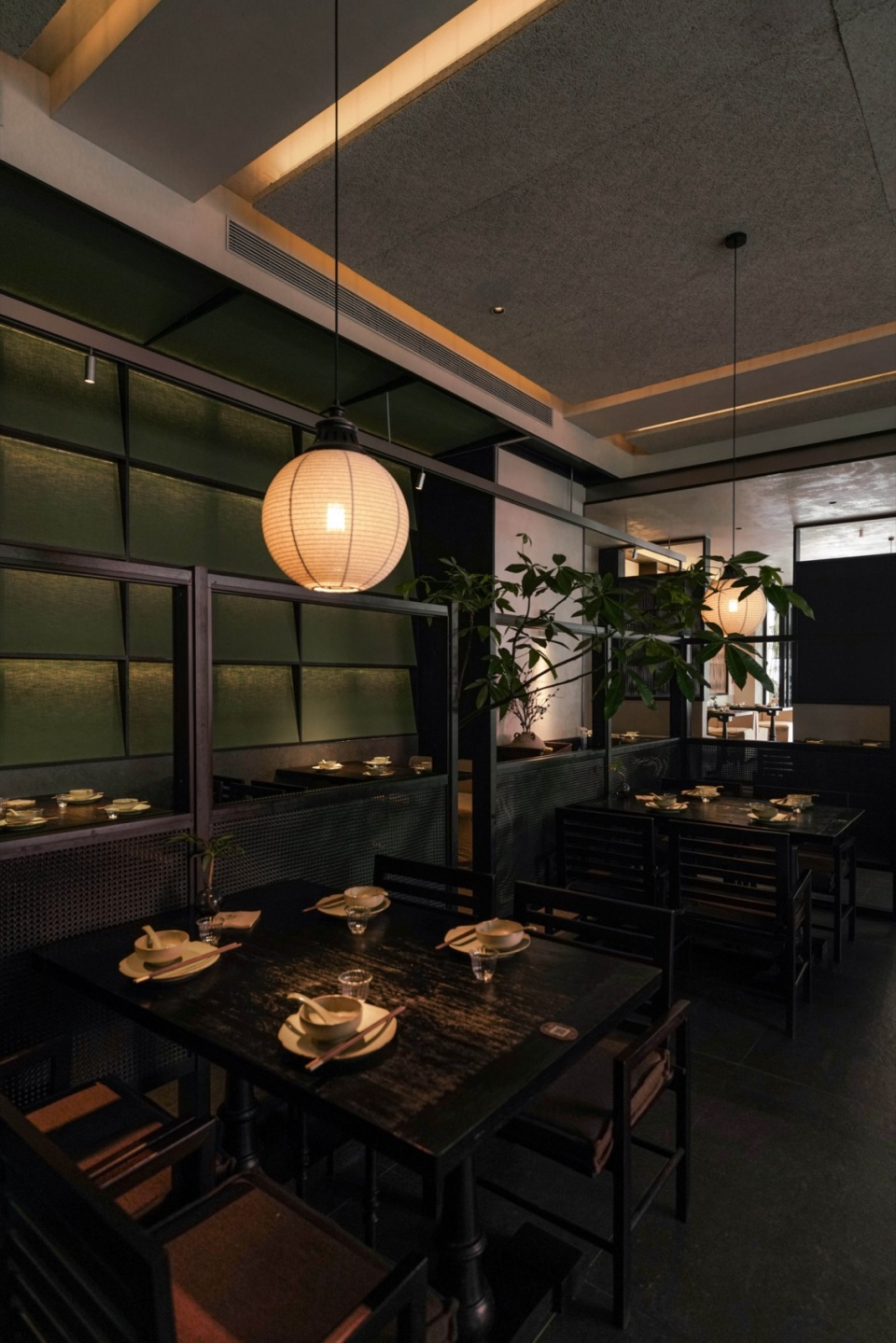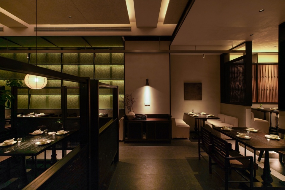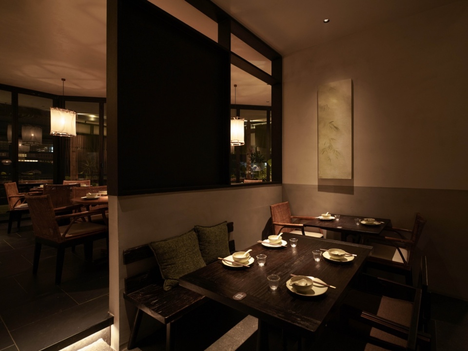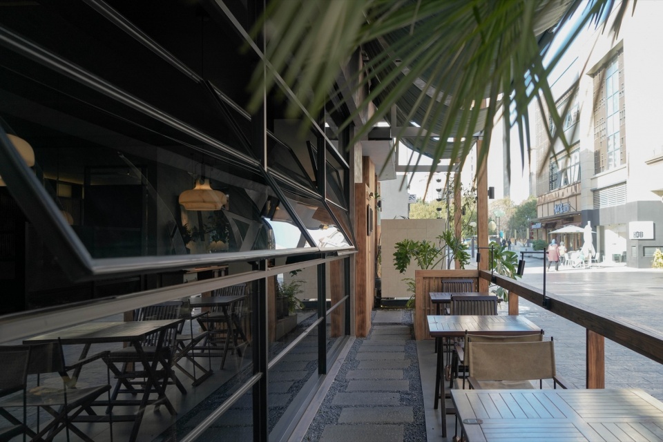 而靠内侧的半围合就餐区域,则更像是一处收纳情绪的角落。汀步、绿植、素墙、透帘、半高卡座,以天然材质为线索,铺展开一个转而念之的餐饮日常。