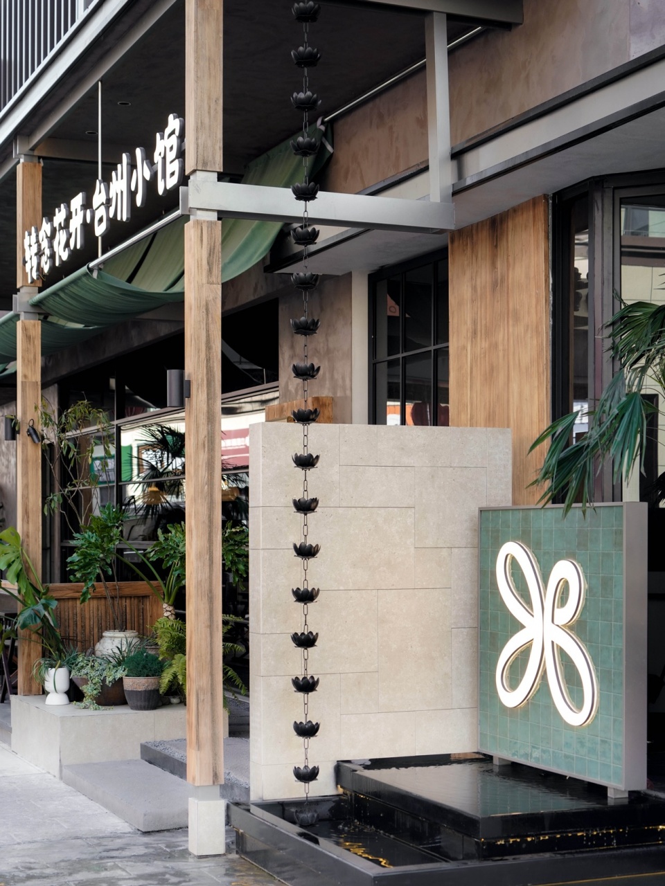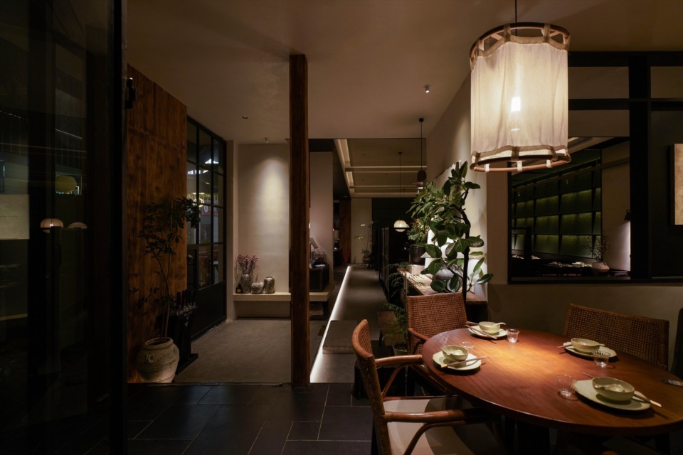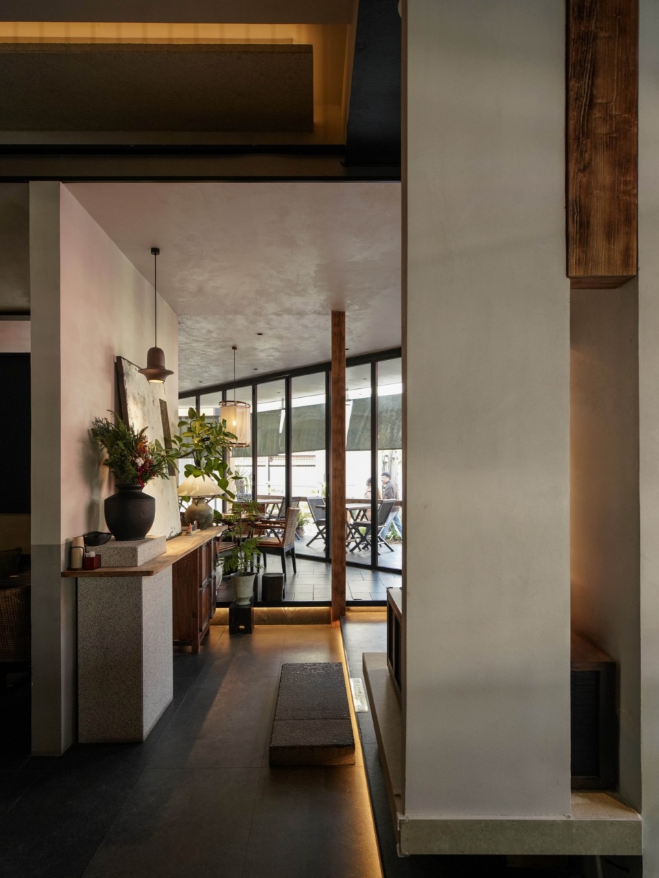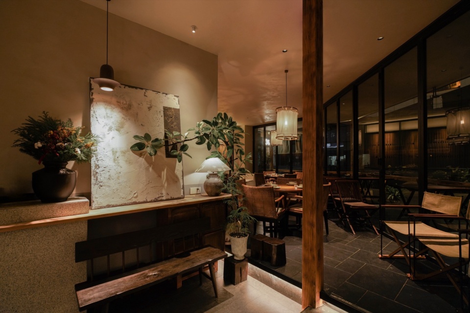 外摆区作为延伸界面,以种植池与石材构成软隔断,视觉连续、功能独立;入口设置过渡区域,通过陶罐、植物与高低体块,构成空间“缓冲带”。靠窗的位置,会被透光玻璃打上一层温和的雾光;