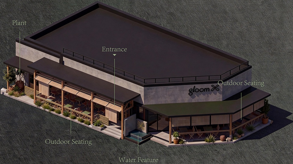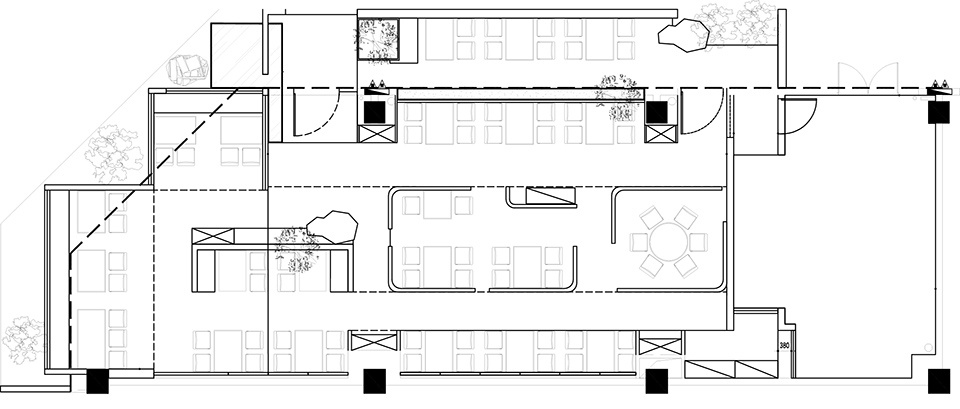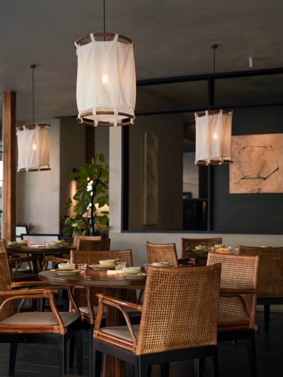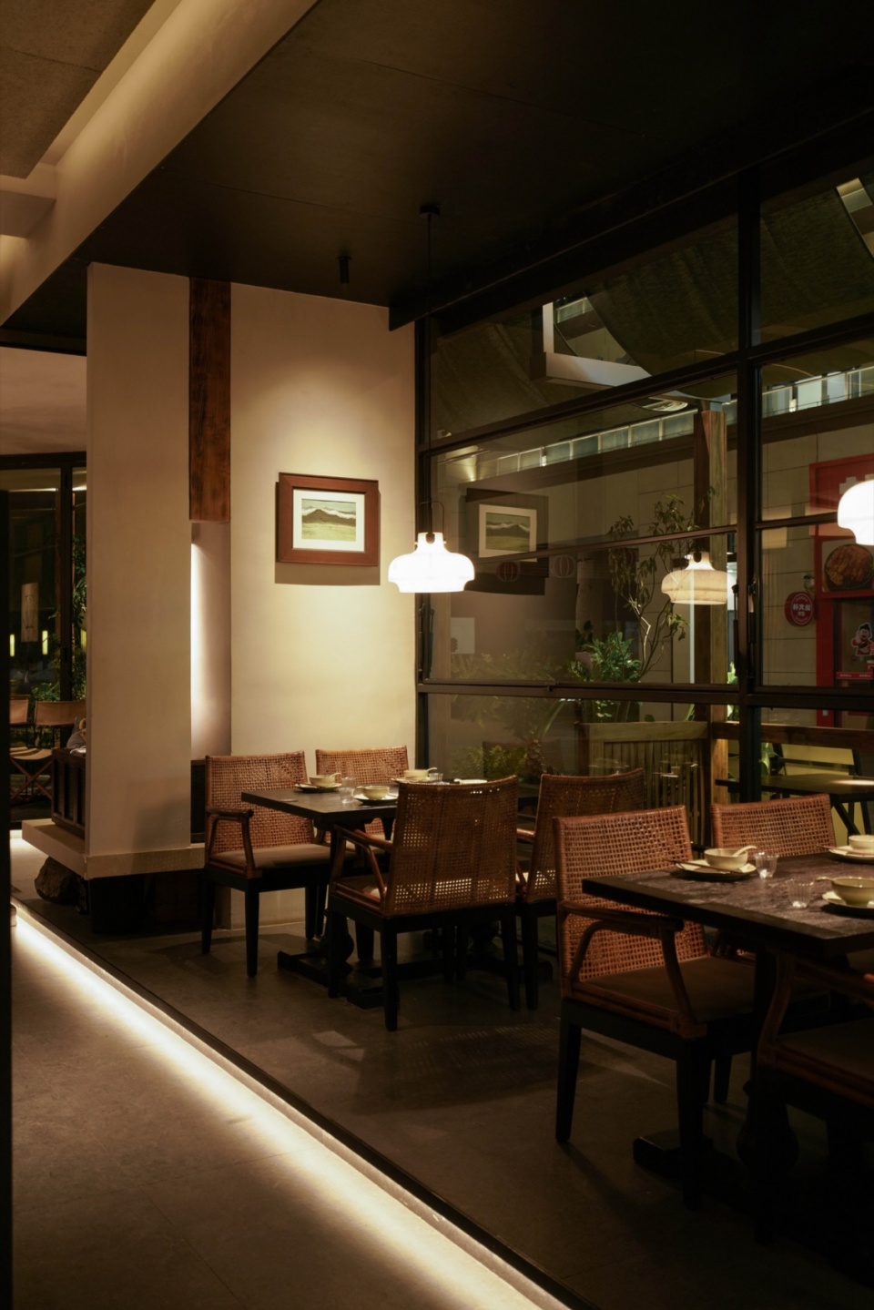 外摆区作为延伸界面,以种植池与石材构成软隔断,视觉连续、功能独立;入口设置过渡区域,通过陶罐、植物与高低体块,构成空间“缓冲带”。靠窗的位置,会被透光玻璃打上一层温和的雾光;