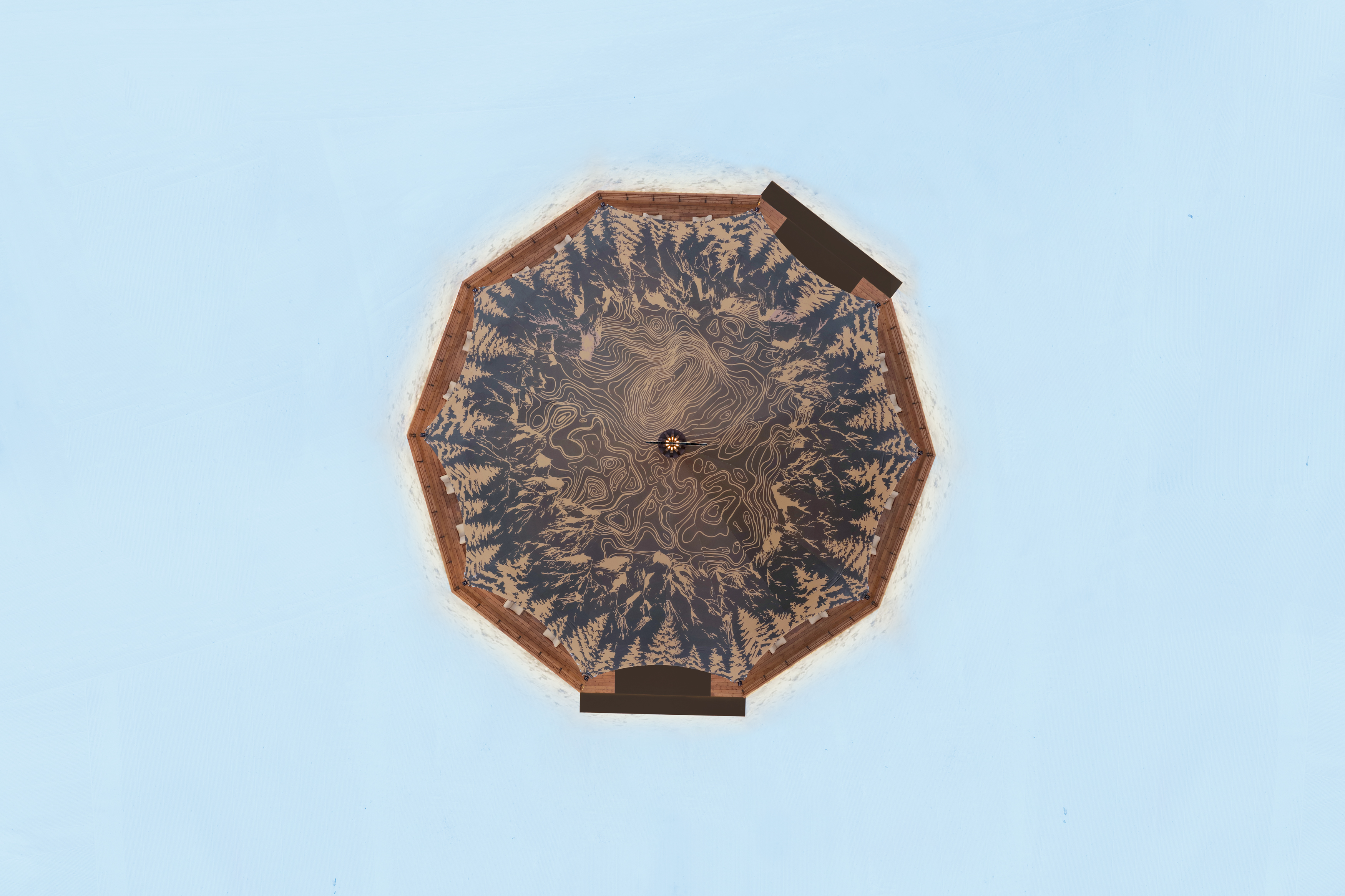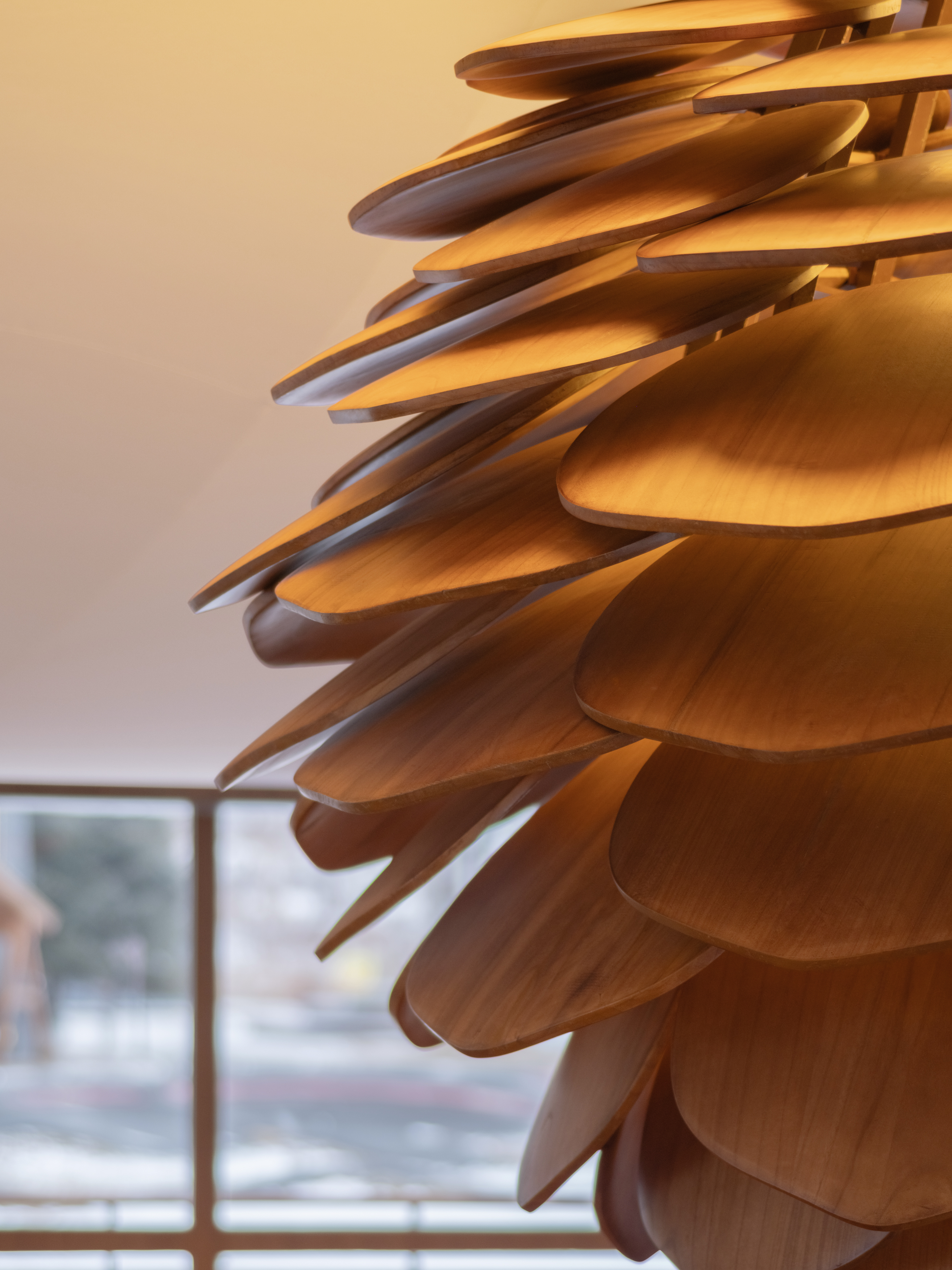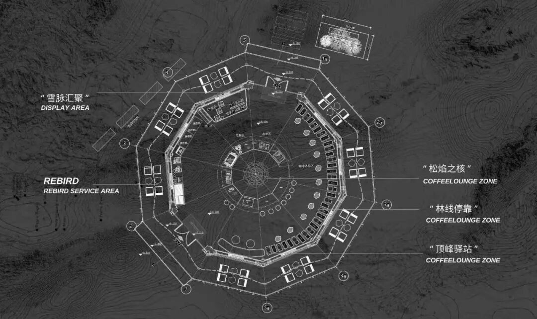 咖啡空间的核心装置“松焰之核”延续松果这一自然意象,将针叶林在风雪中层层蓄势、向上生长的能量,凝聚成体验中心的主视觉。薄翼般的片层环绕生长,外缘收紧,向内打开,在集合区上方成为空间核心。光从内核缓慢溢出,像登顶前营地的微光。