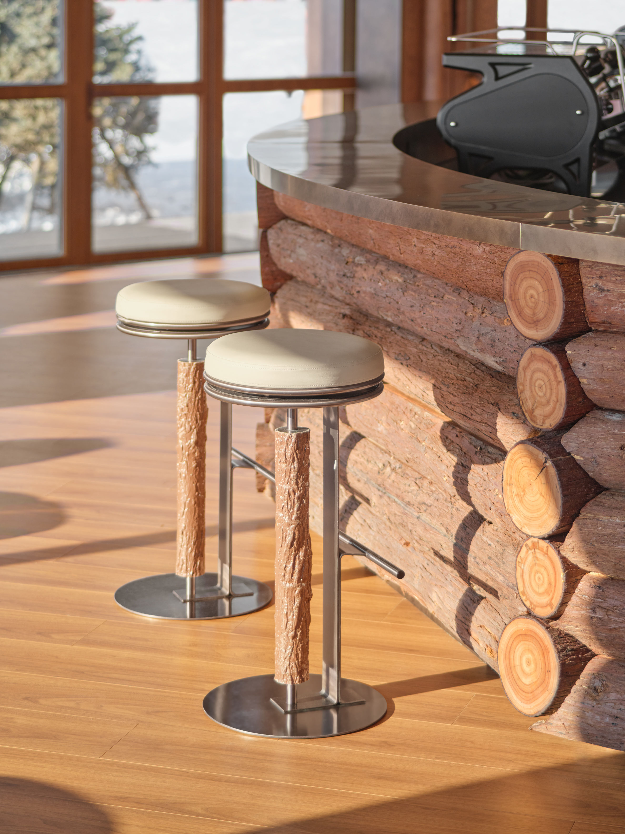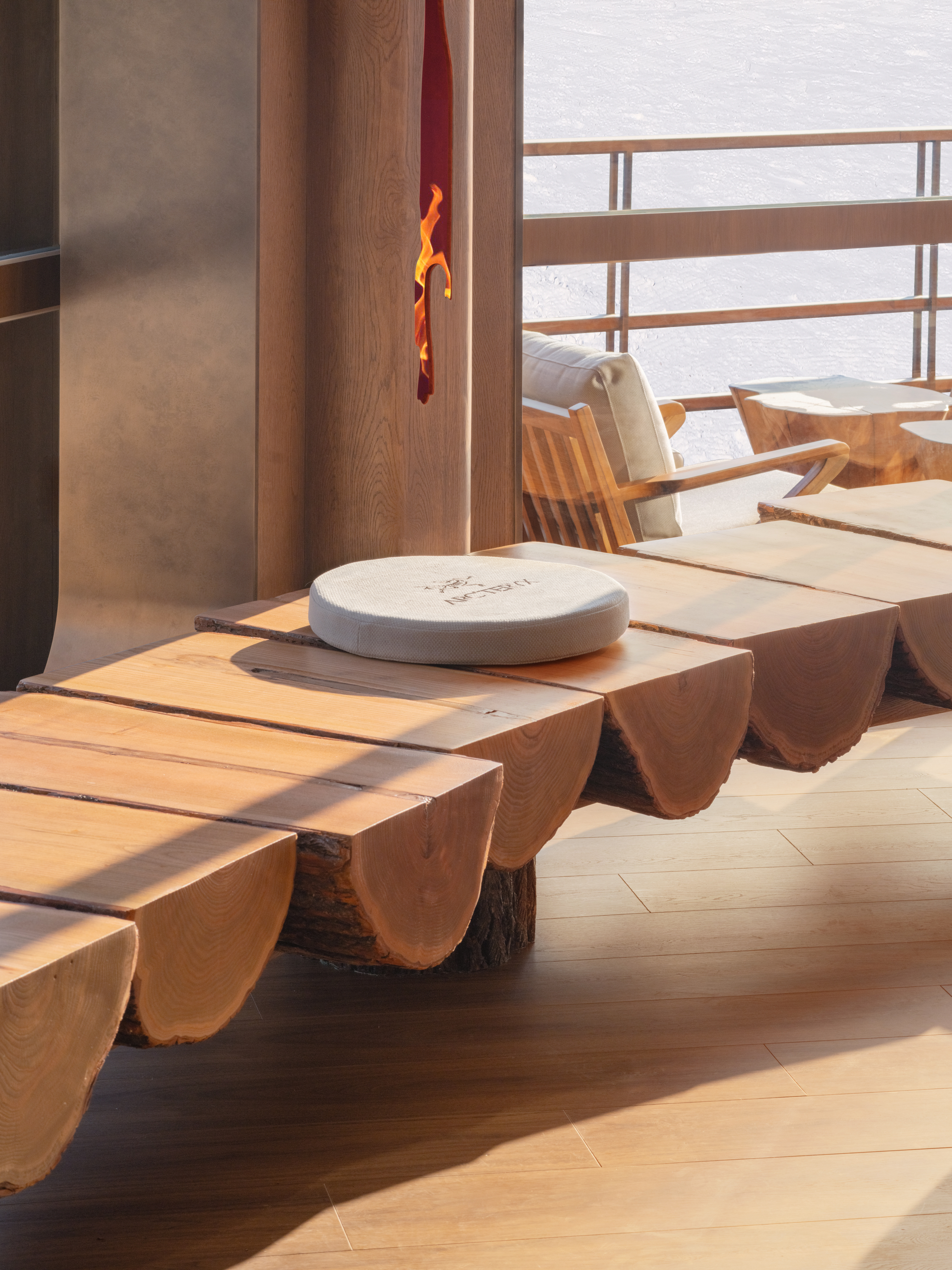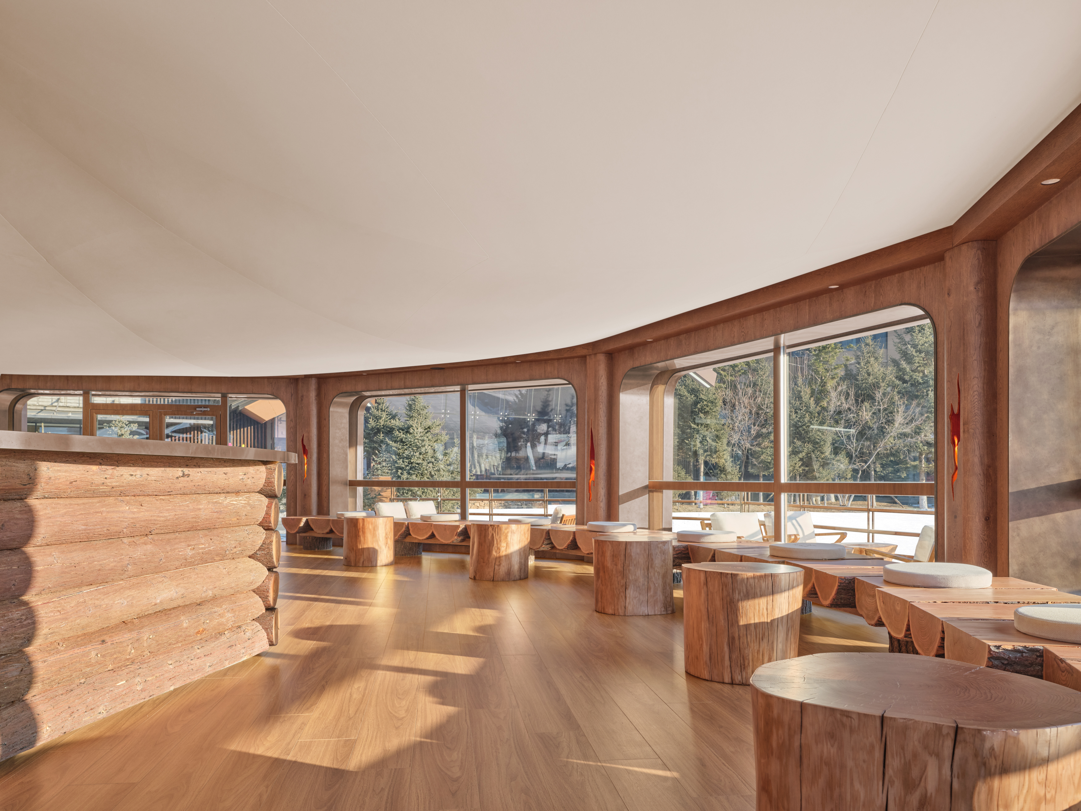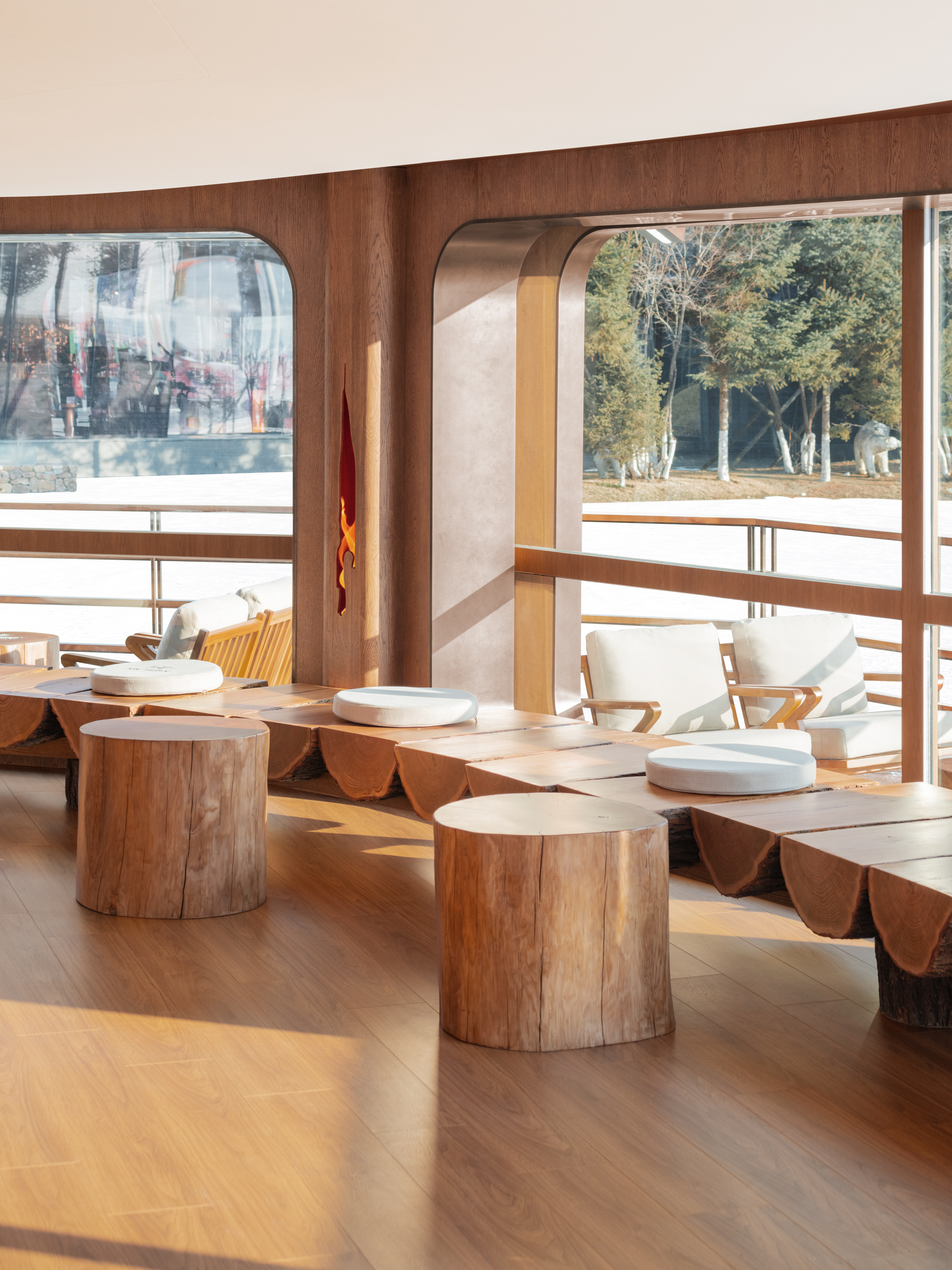 移步室内,浪木构筑出山野肌理,雪境的凛冽与营地的温暖在此共存。软装以山地木屋为灵感,原木的温润、玻璃的通透、布料的柔软与金属的坚韧相互平衡,既保证户外场景的耐用性,同时传递自然亲和的质感。