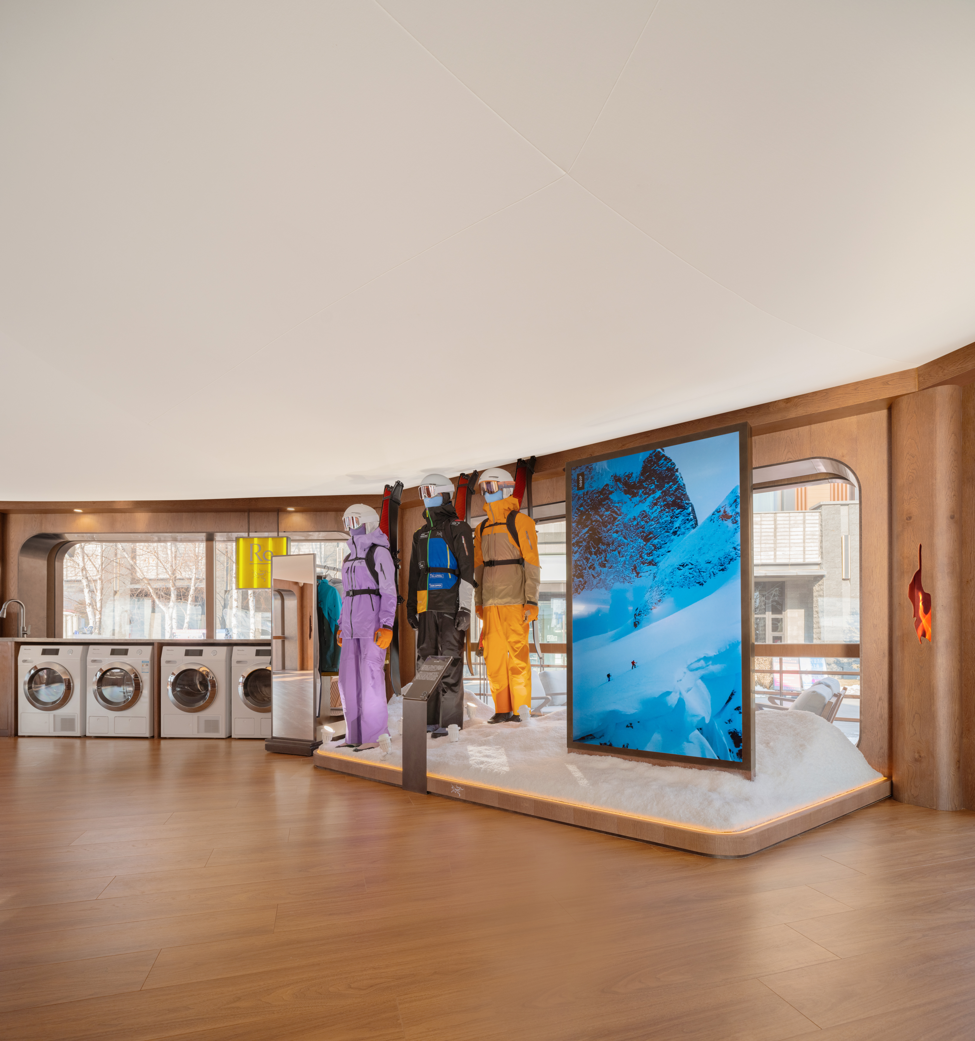 登滑叙事线是一条从准备到出发的完整链路。以“雪脉汇聚”展示区为起点,装备按“选择—使用—养护—再出发”的行动逻辑陈列,让登滑者直观理解专业装备的适配场景。叙事的核心落点于ReBIRD体验区,提供雪服租赁、雪季限时洗护、热压印限时体验等会员服务,给予登滑者全方位的滑雪周边体验。装备在这里通过养护,热压印等工艺焕发新生,同时经ReBIRD修复技术循环再造供客人租赁的雪服,更是一种"再出发"的表达。