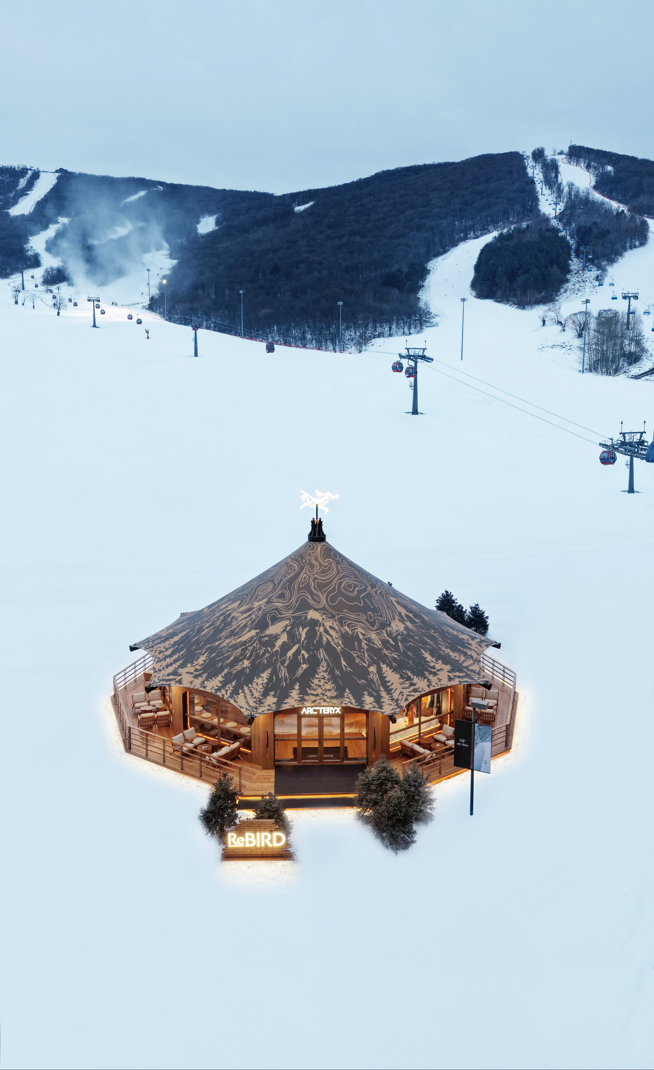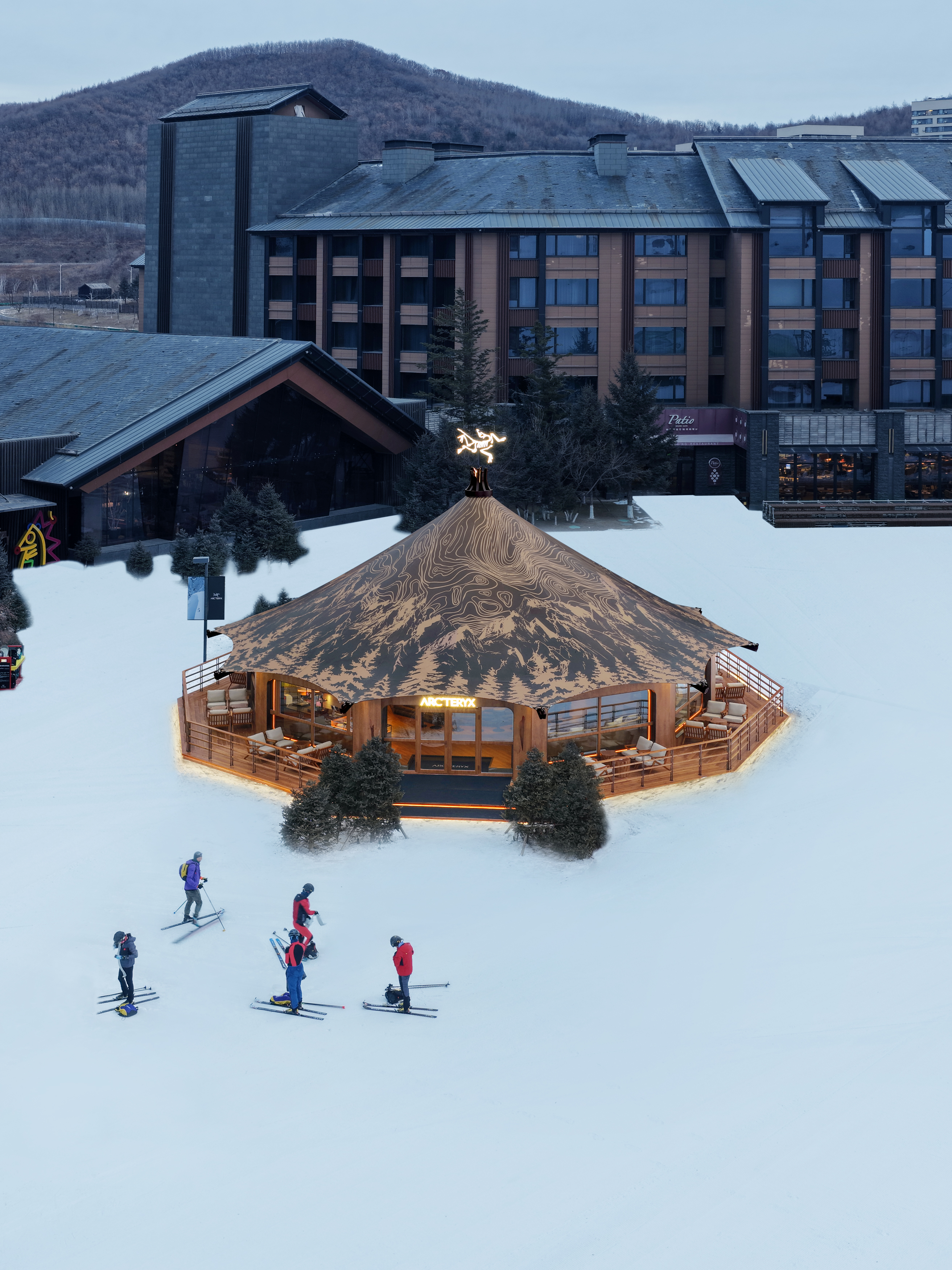停靠体系以“松焰之核”为中心,结合咖啡与补给功能,承担短暂停留与节奏调整。靠近雪场边界的“顶峰驿站”,则将视线重新交还给山体与雪道,允许更长时间的观察与交流。