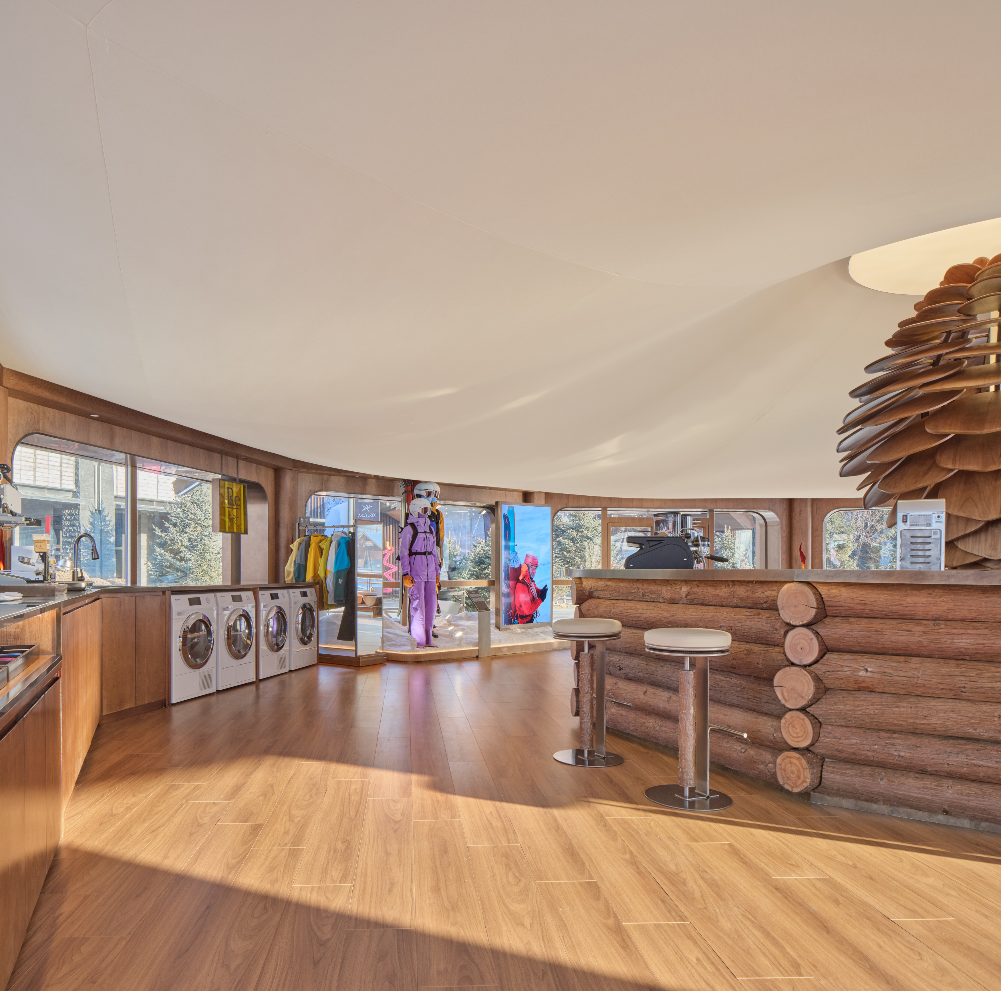 装置下方运用大量原木材质构建吧台与陈列基底,家具选用半围合树桩卡座、原木小桌,桌面印有松花湖专属金属印花,还原户外露营的质朴感。墙面嵌入壁炉灯,模拟户外篝火取暖的场景,让登滑者在室内也能感受到自然庇护的温暖。弧形沙发搭配柔软面料,缓解登滑后的疲惫,营造轻松社交的氛围,让来自各地的登滑者能围坐交流,形成户外文化的价值认同。